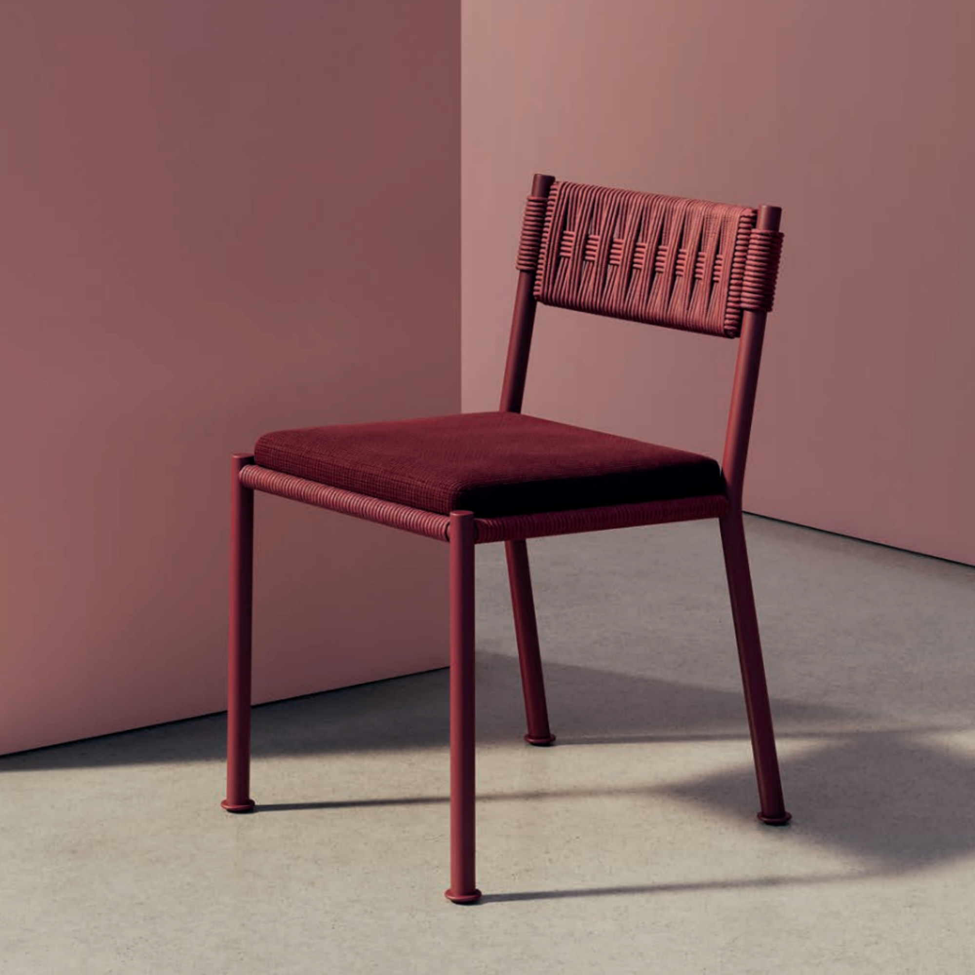The Brezal Chair SI2363 features a corded seat and backrest with a steel frame, both available in multiple colors. Optional upholstered seat cushions add comfort, making it a versatile and stylish choice for residential, office, or commercial spaces.