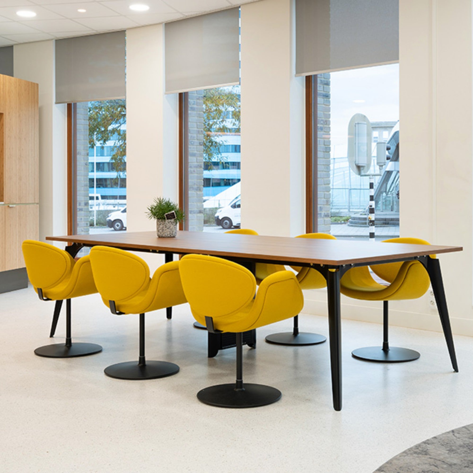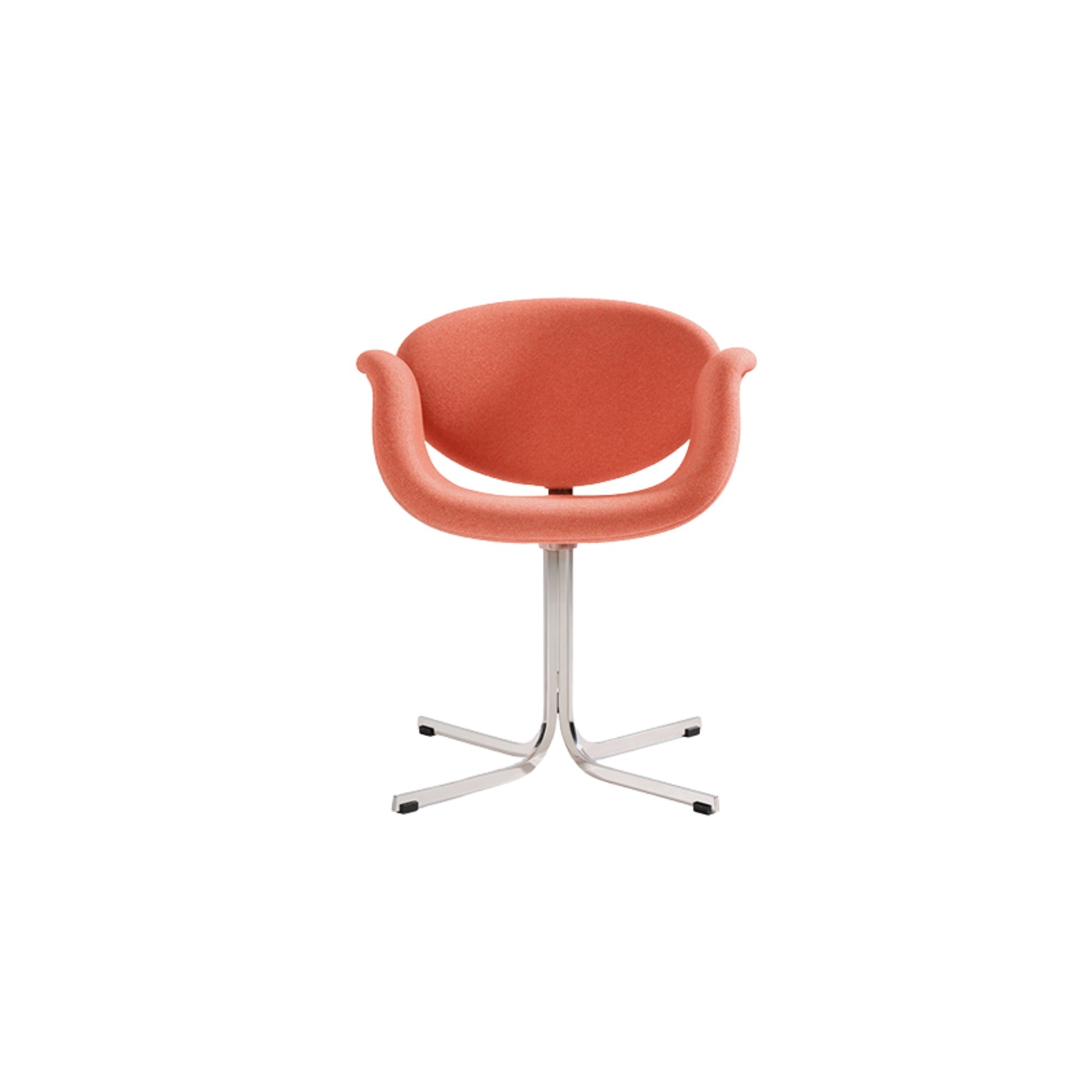The Little Tulip® Chair by Pierre Paulin for Artifort is a Mid-Century Modern icon, featuring sculptural curves inspired by tulip petals. Ergonomic, versatile, and inviting, it suits dining tables, meeting rooms, or collaborative spaces, with options for a cross base or swivel disc base.