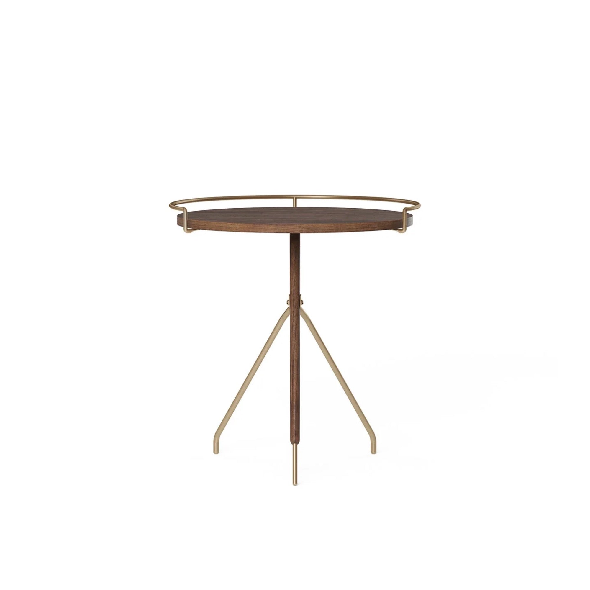 Originally designed by Arthur Umanoff in the 1950s, the reissued Umanoff Side Table combines walnut and brass atop a rounded top with a tripod-inspired frame. Compact yet striking, it embodies mid-century modern style, perfect for books, coffee, or vases, and is available in two versatile sizes.