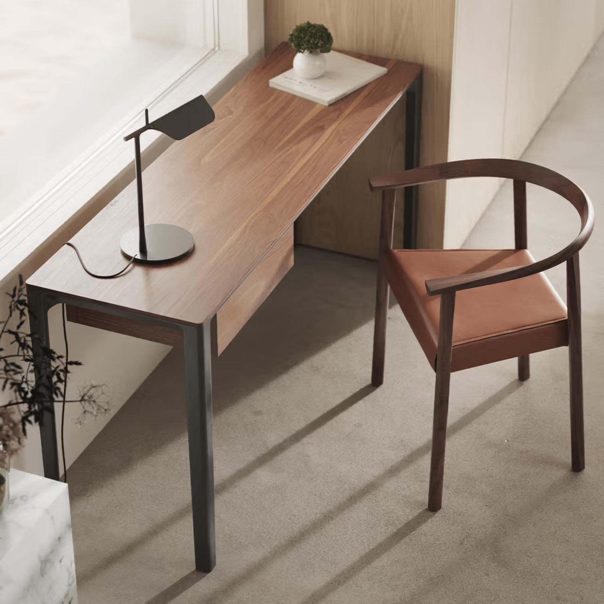 The Able Desk & Low Console by Bensen offers versatile functionality with a minimalist design. Featuring die-cast aluminum legs and customizable wood or marble tops, it includes movable drawers that can be added or removed to suit various needs. Ideal for home offices or entryways.