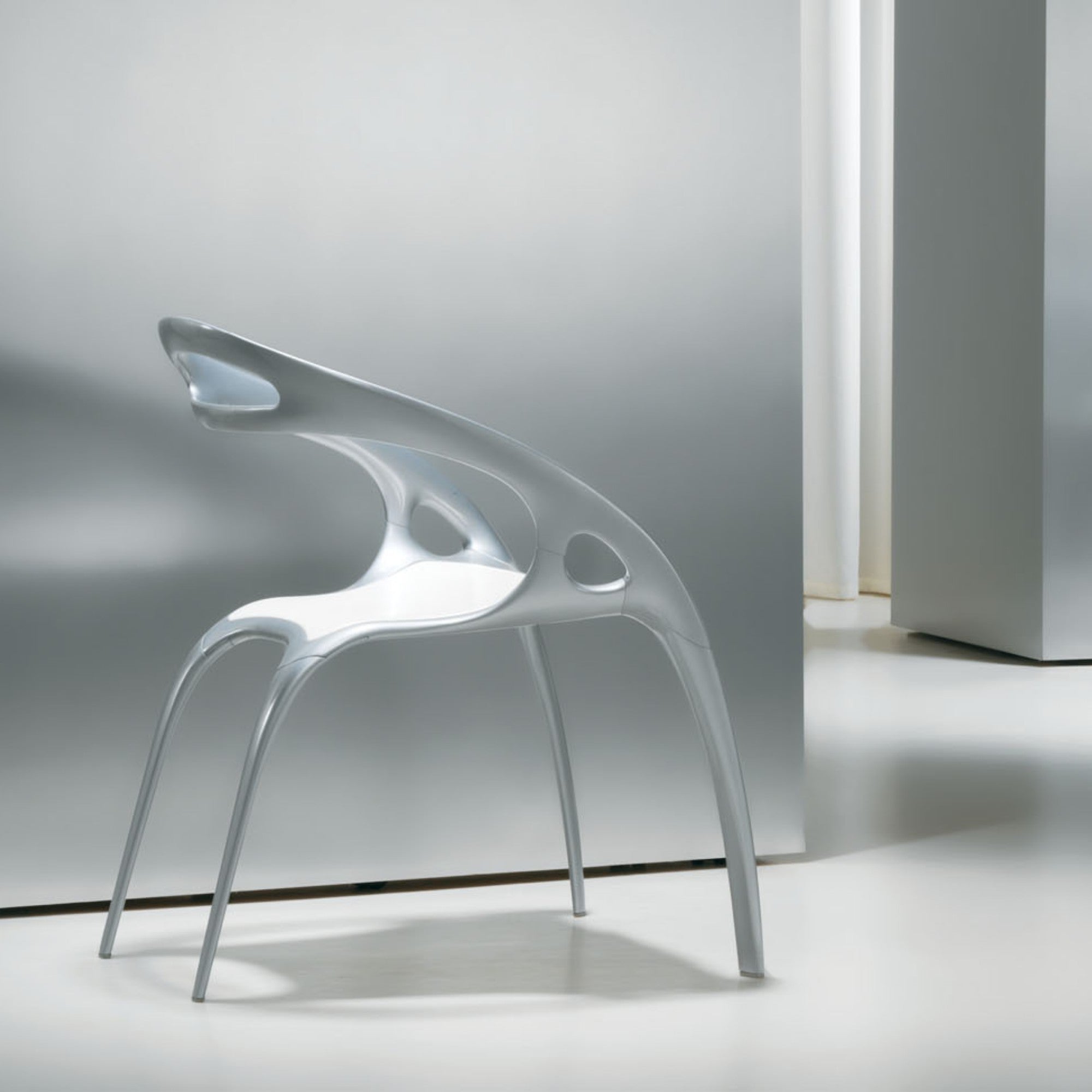 Go® Chair features an organic, sculptural design inspired by the human form. Crafted with a lightweight, strong die-cast magnesium frame, it combines art and versatility. Available with white or grey polypropylene seats, Go® seamlessly suits both residential and commercial interiors with comfort and style.