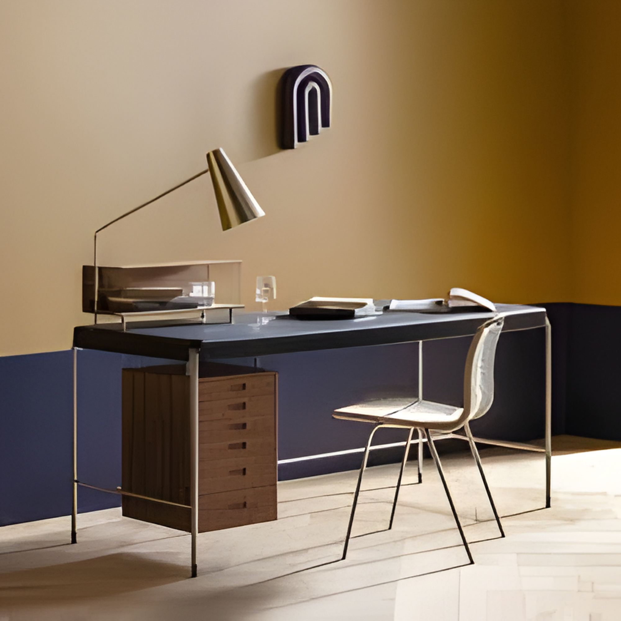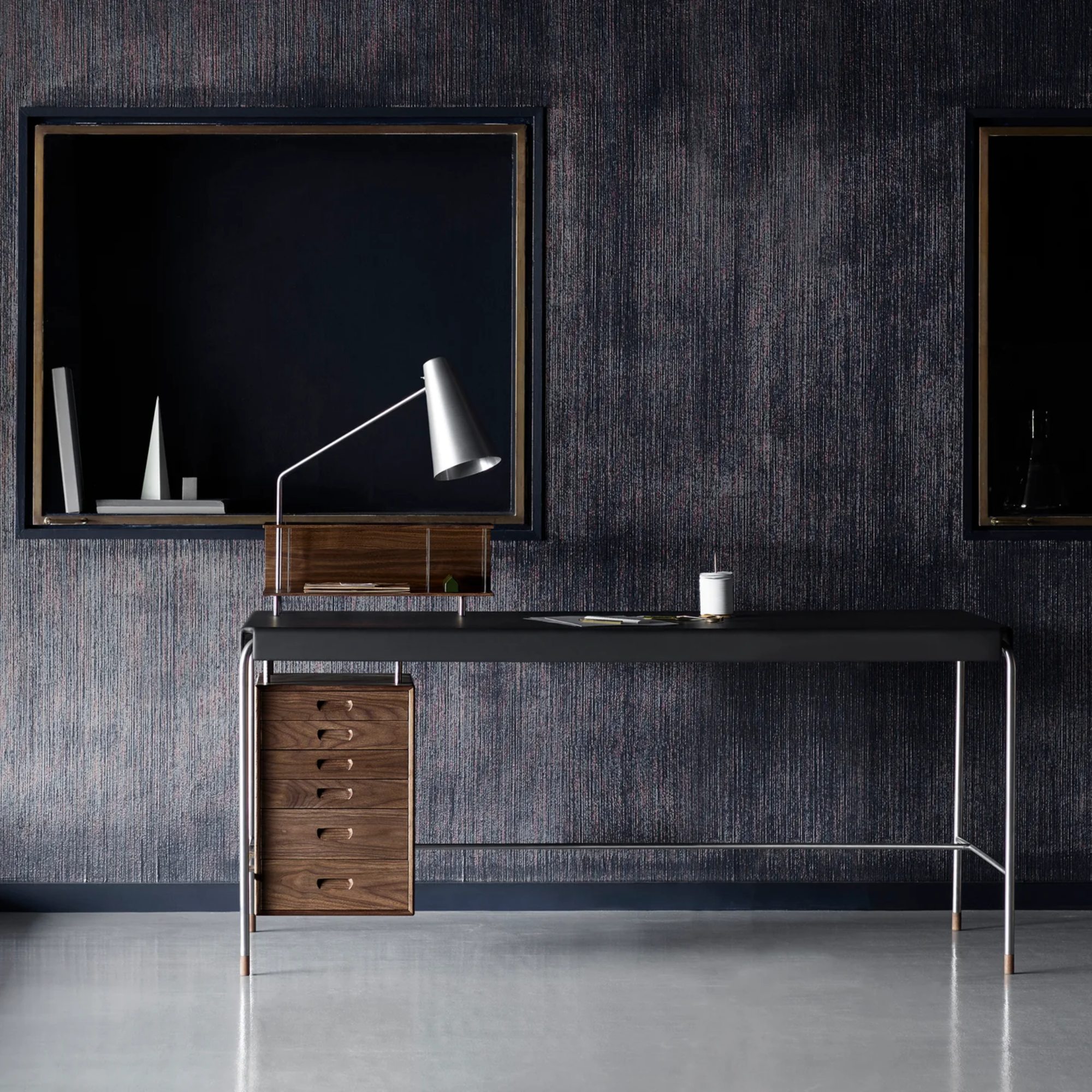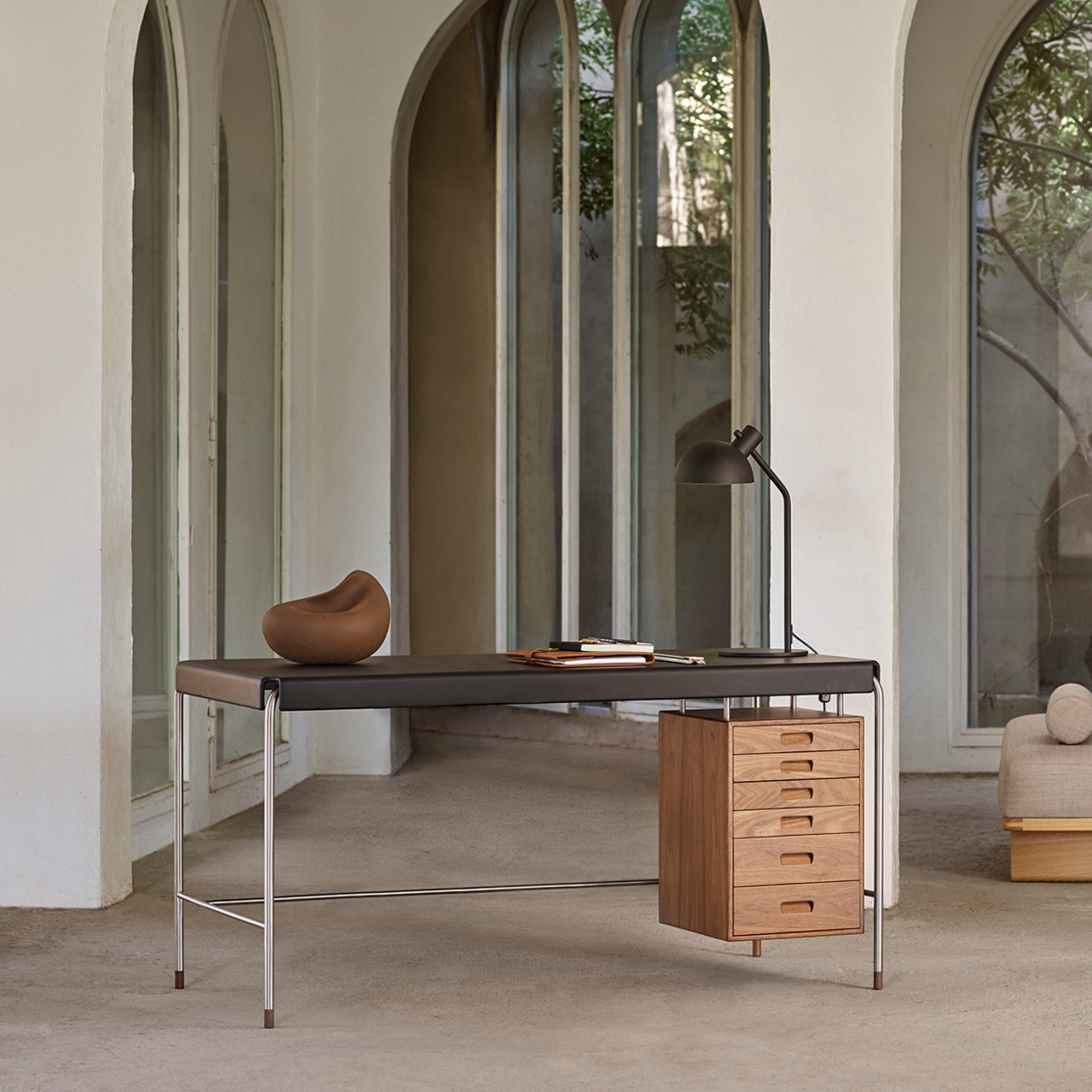 Arne Jacobsen’s AJ52 Society Table, designed in 1952, embodies Danish functionalism with enduring elegance and industrial refinement. Featuring a leather-wrapped top, tubular steel frame, integrated lamp, and optional drawer unit, this iconic Carl Hansen & Søn desk combines craftsmanship and lightness—ideal for refined home offices or executive spaces.