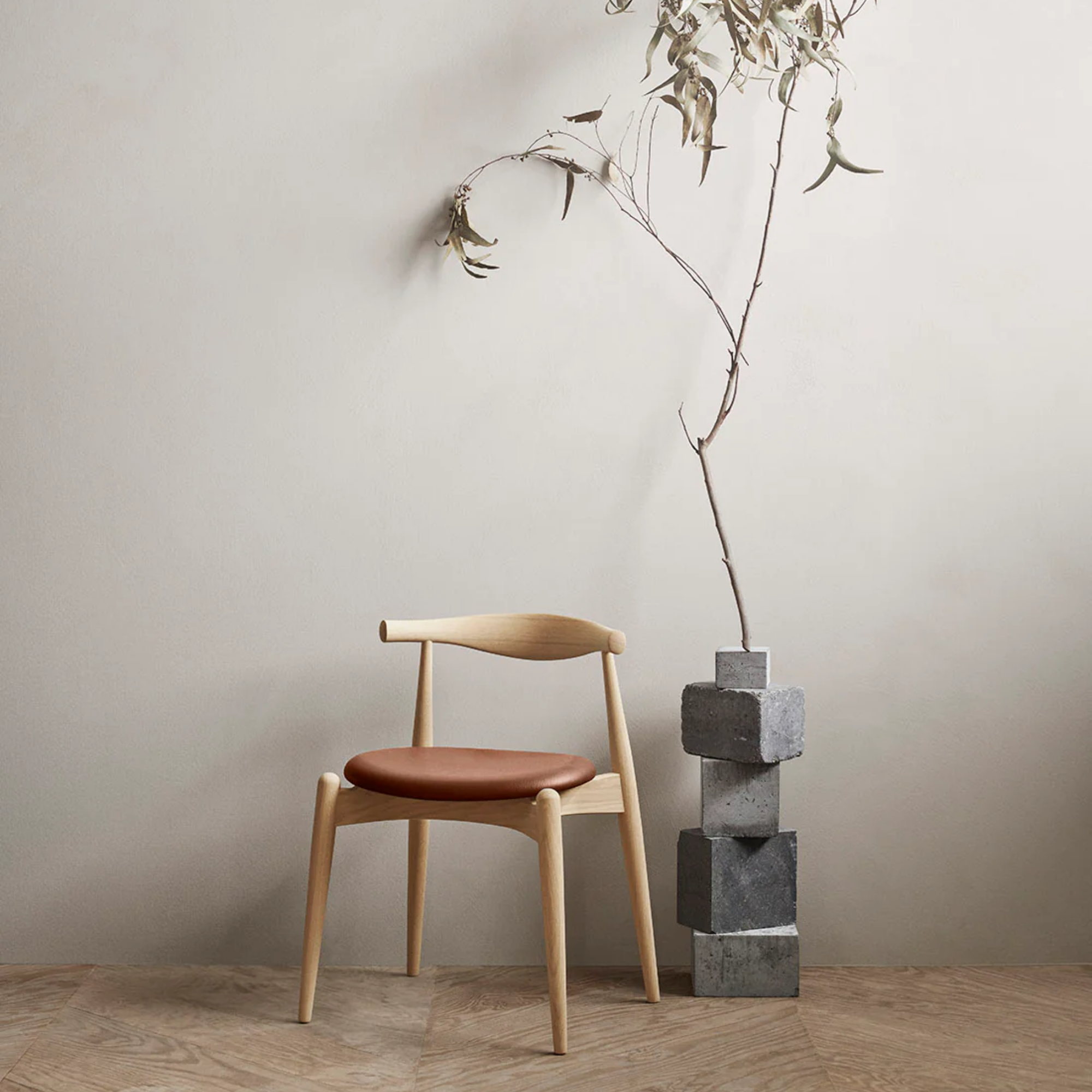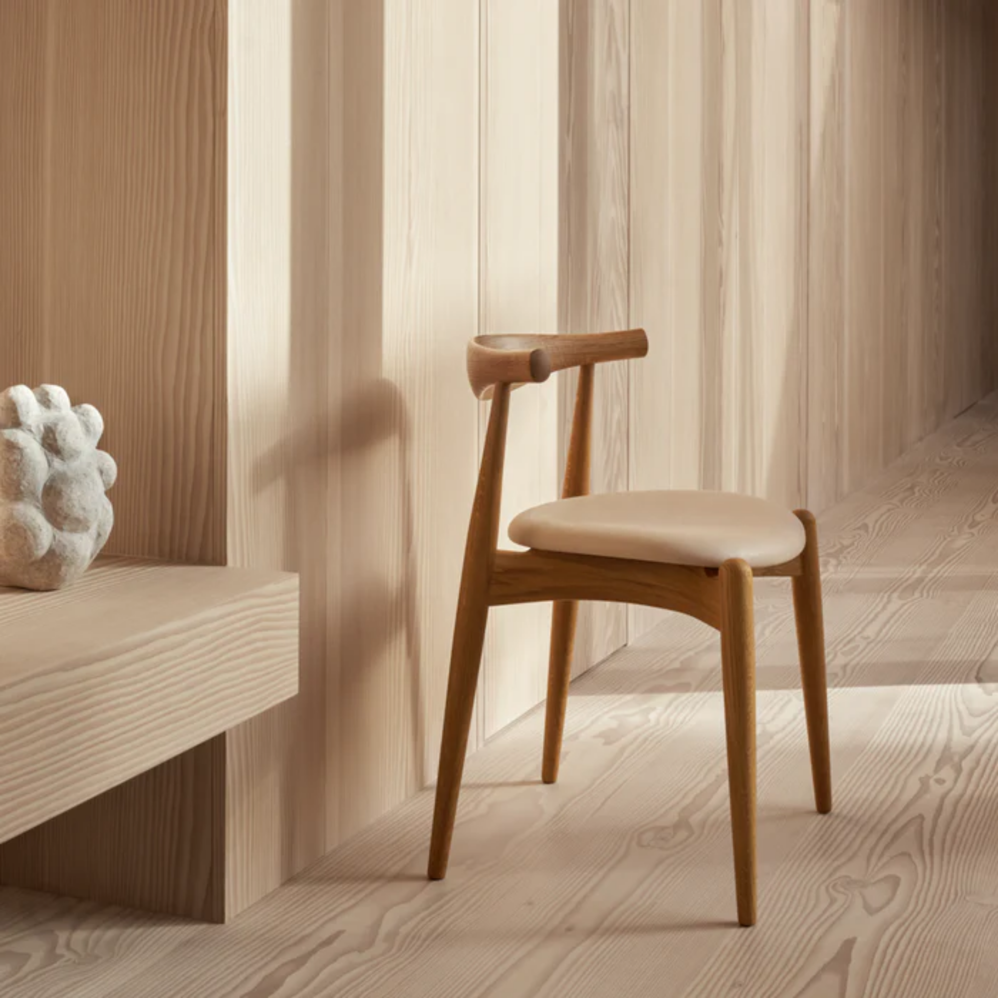 Designed by Hans J. Wegner, the CH20 Elbow Chair combines a steam-bent solid wood backrest with a light, floating expression. Its innovative rail construction ensures stability while providing ergonomic elbow and lower back support, making it a modern classic in timeless Danish design.