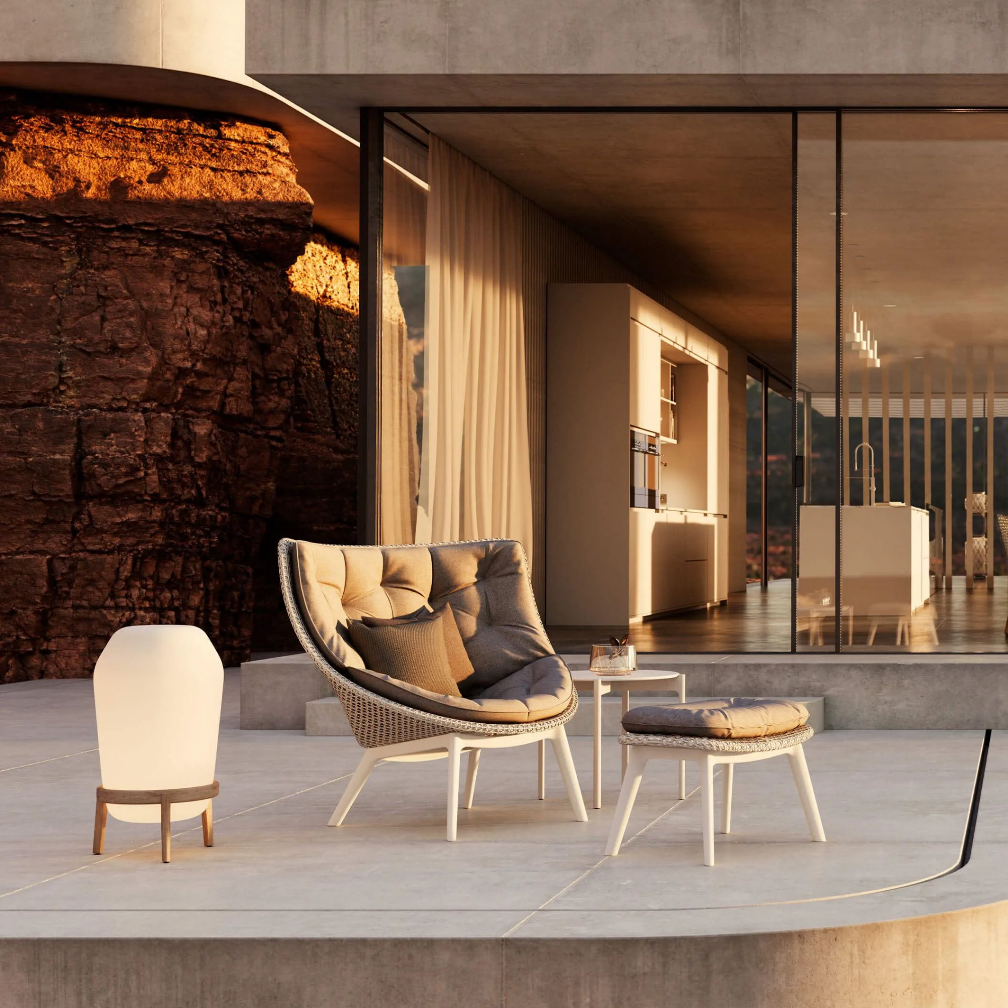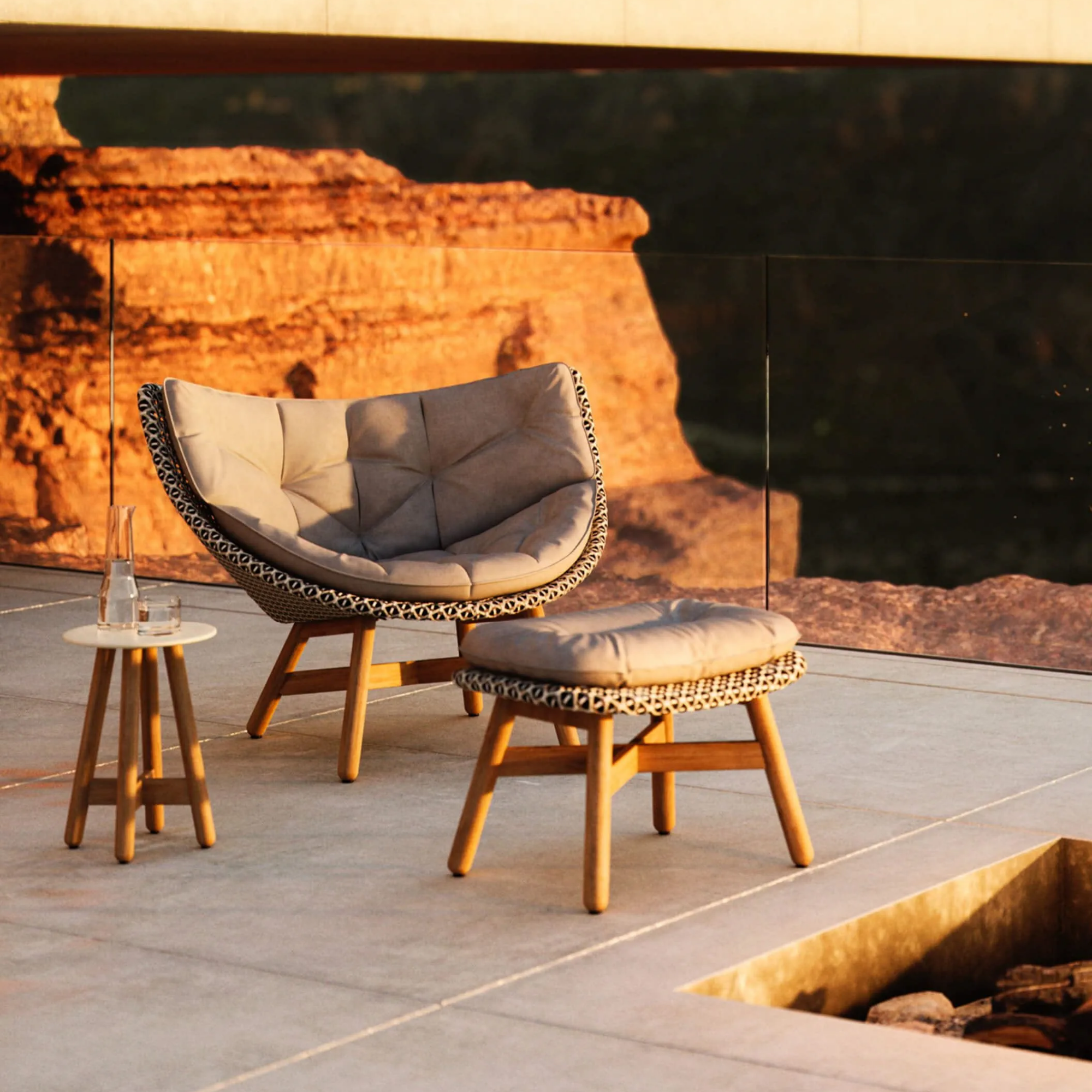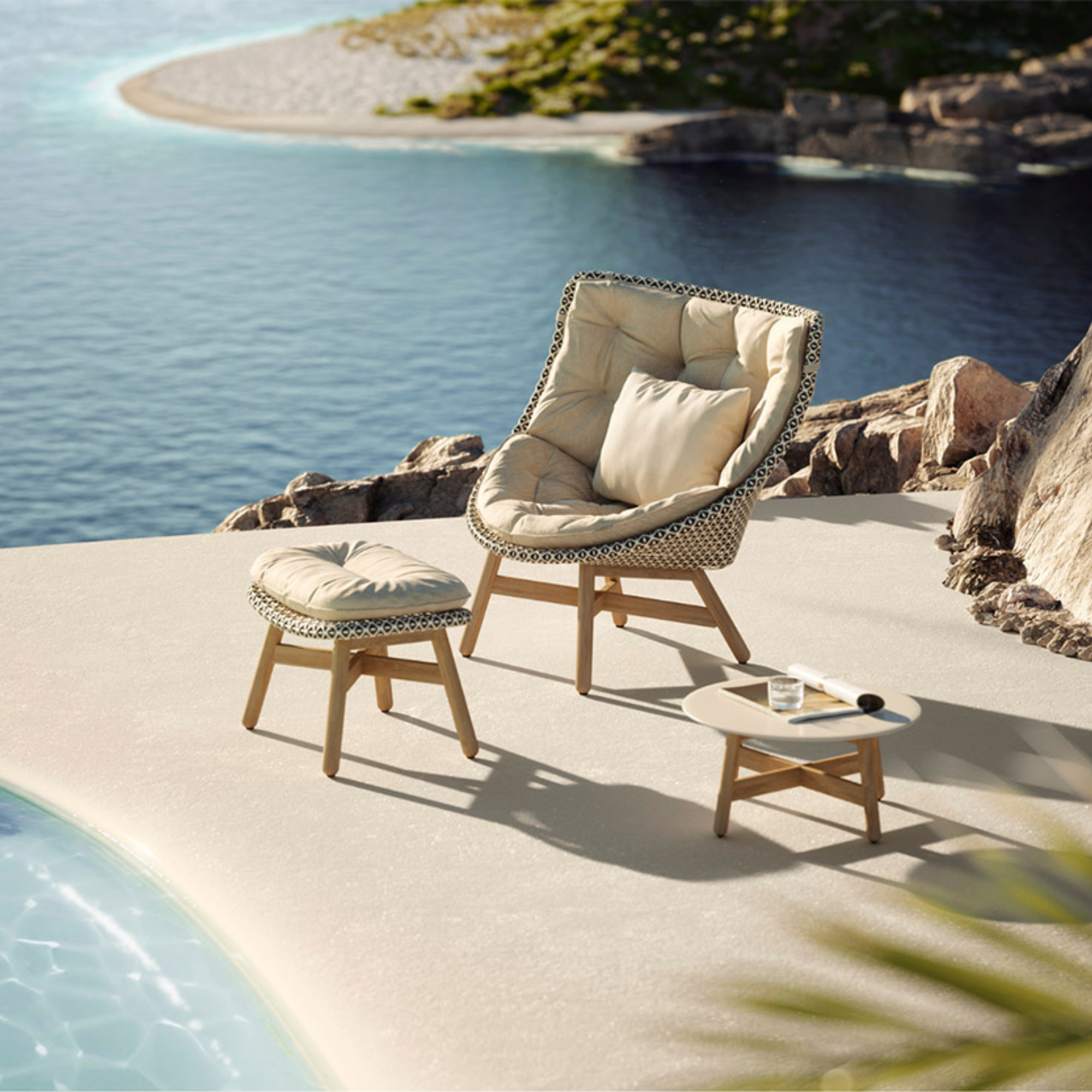MBRACE is a DEDON classic, featuring inviting, organic forms in woven fibre and teak. With optional die-cast aluminium bases, the collection includes armchairs, wing chairs, lounge chairs, and footstools. Offering over 70 combinations of styles, colours, and materials, MBRACE brings versatile, expressive elegance to any outdoor setting.