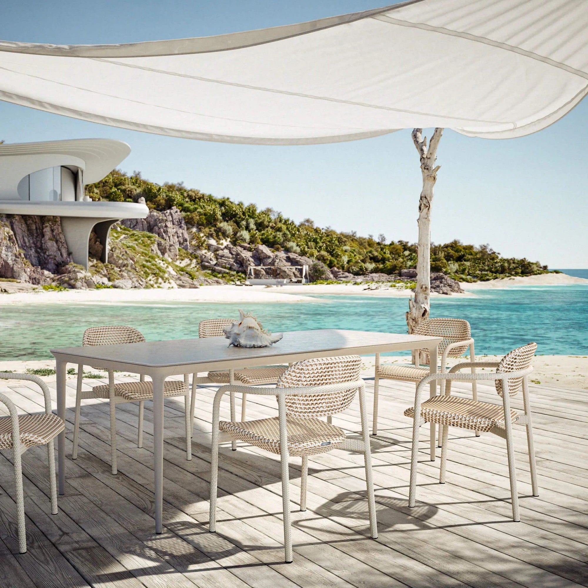 ROII by Benjamin Baum showcases DEDON’s signature design with side chairs, armchairs, and lounge chairs in two distinctive weaves. Lightweight, stackable, and durable, the collection features herringbone and open triaxial DEDON Fiber ‘Touch’ in warm tobacco tones, offering comfort, versatility, and contemporary outdoor style.