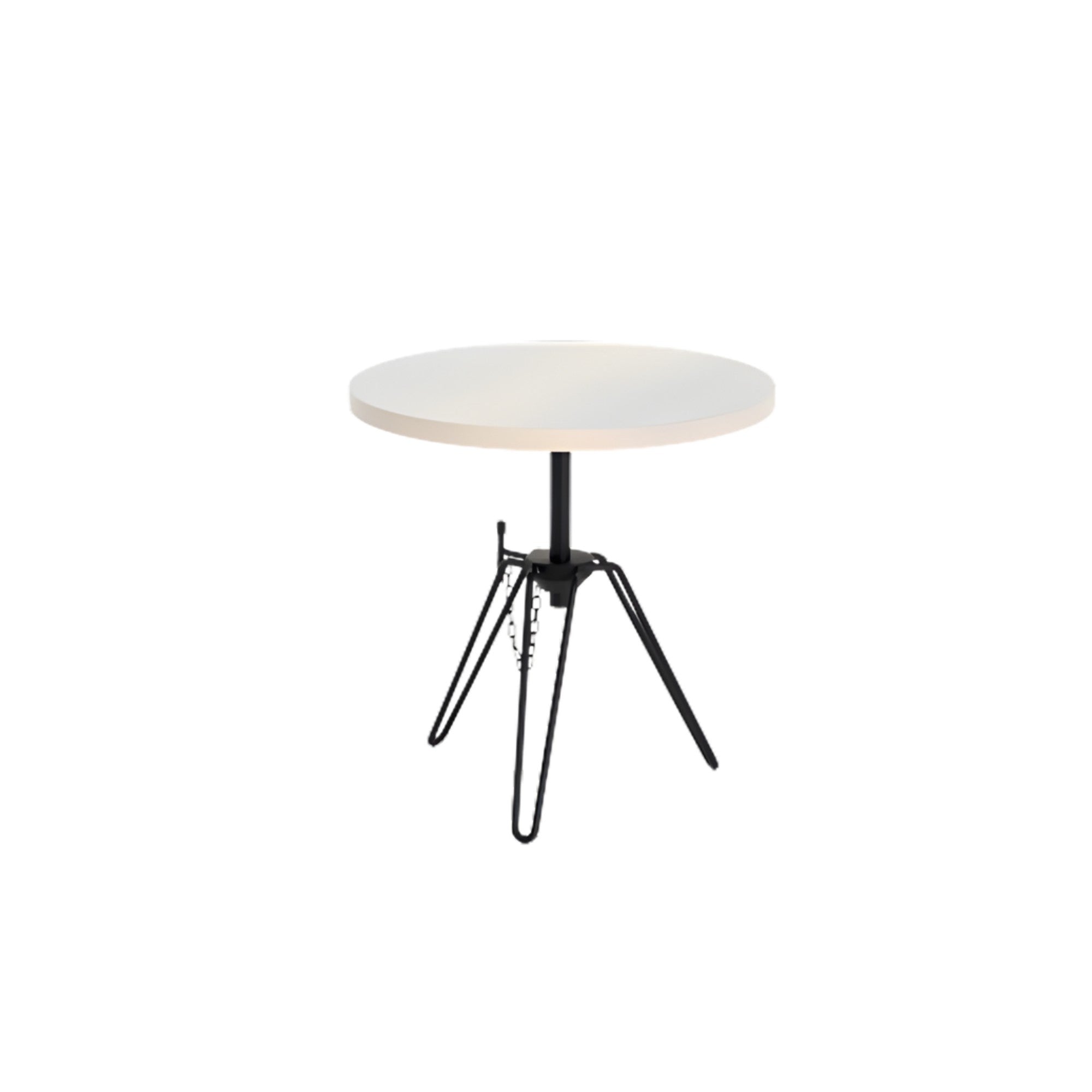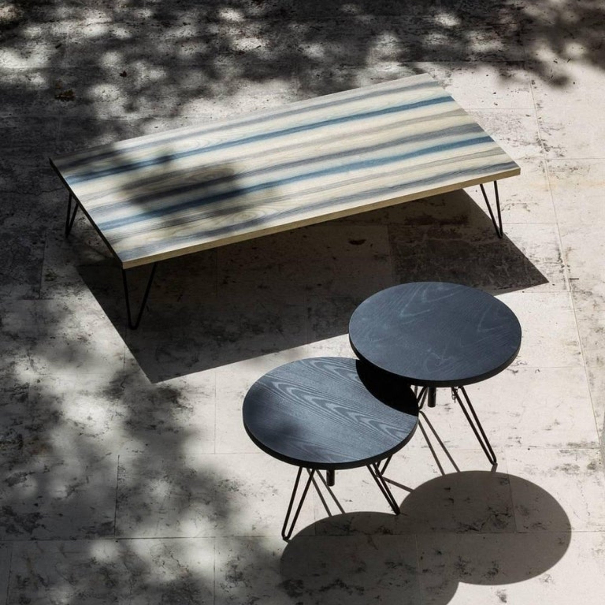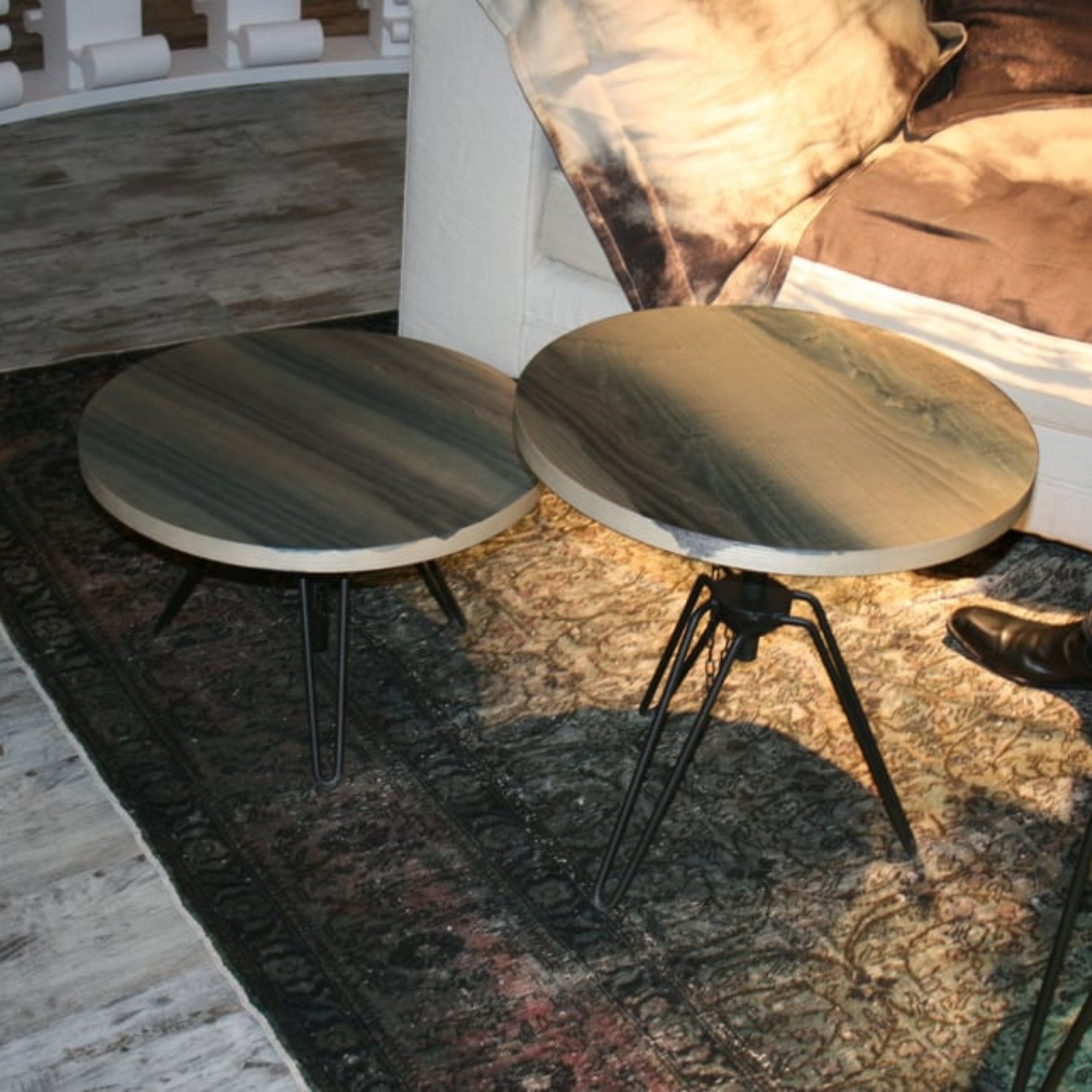 These pieces feature hand-painted details that enhance a vintage effect, highlighting the natural grain of treated wood. Tables and chairs alike are finished with a special manual technique. Tops are in MDF with aniline-dyed ash veneer, supported by a steel base with a durable varnish finish.