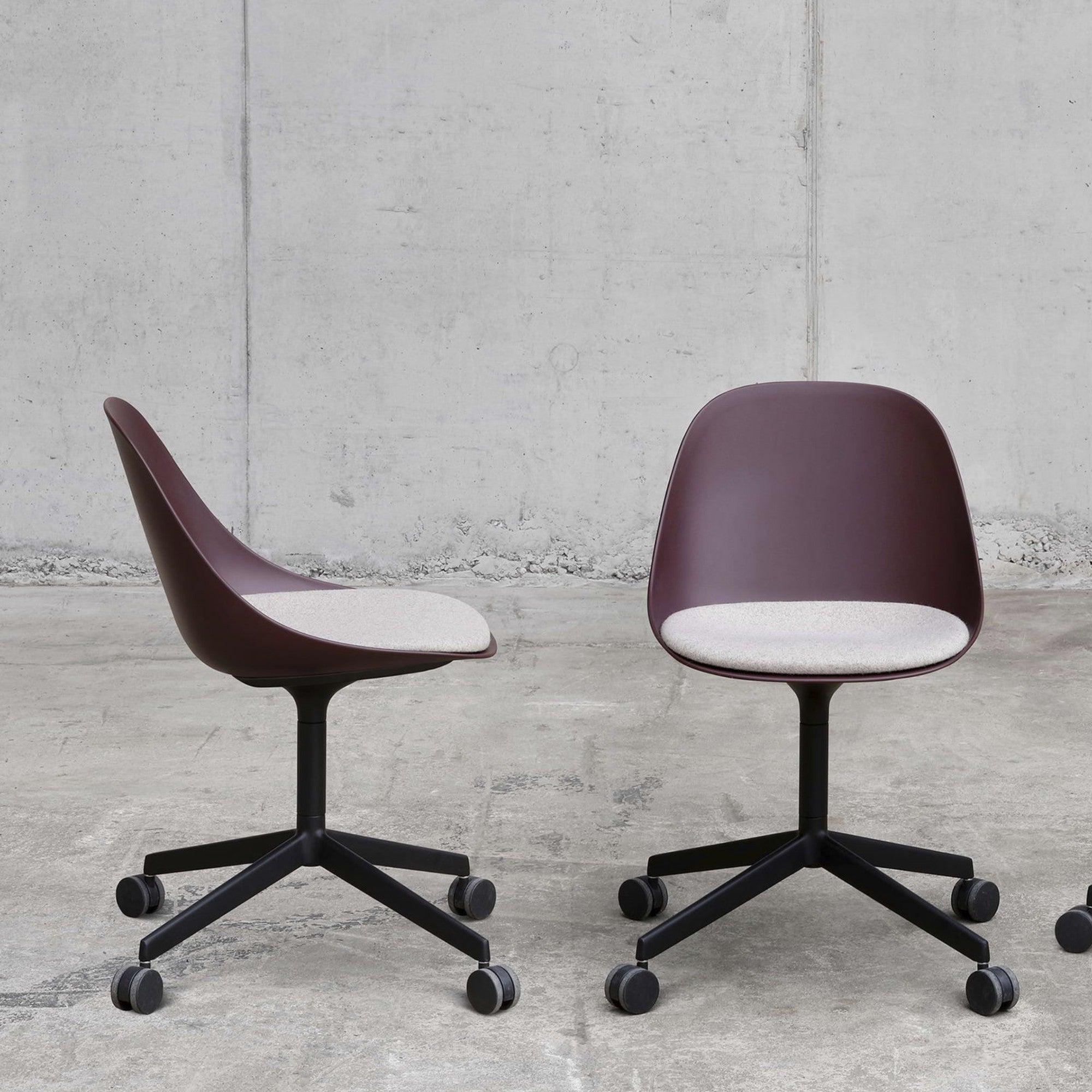 The Mate Chair 5R features a 5-star lacquered aluminum base with wheels and a polypropylene or fully upholstered shell, with optional seat pad. Its ergonomic design, comfort, and modern style make it ideal for dynamic office environments and contemporary workspaces.