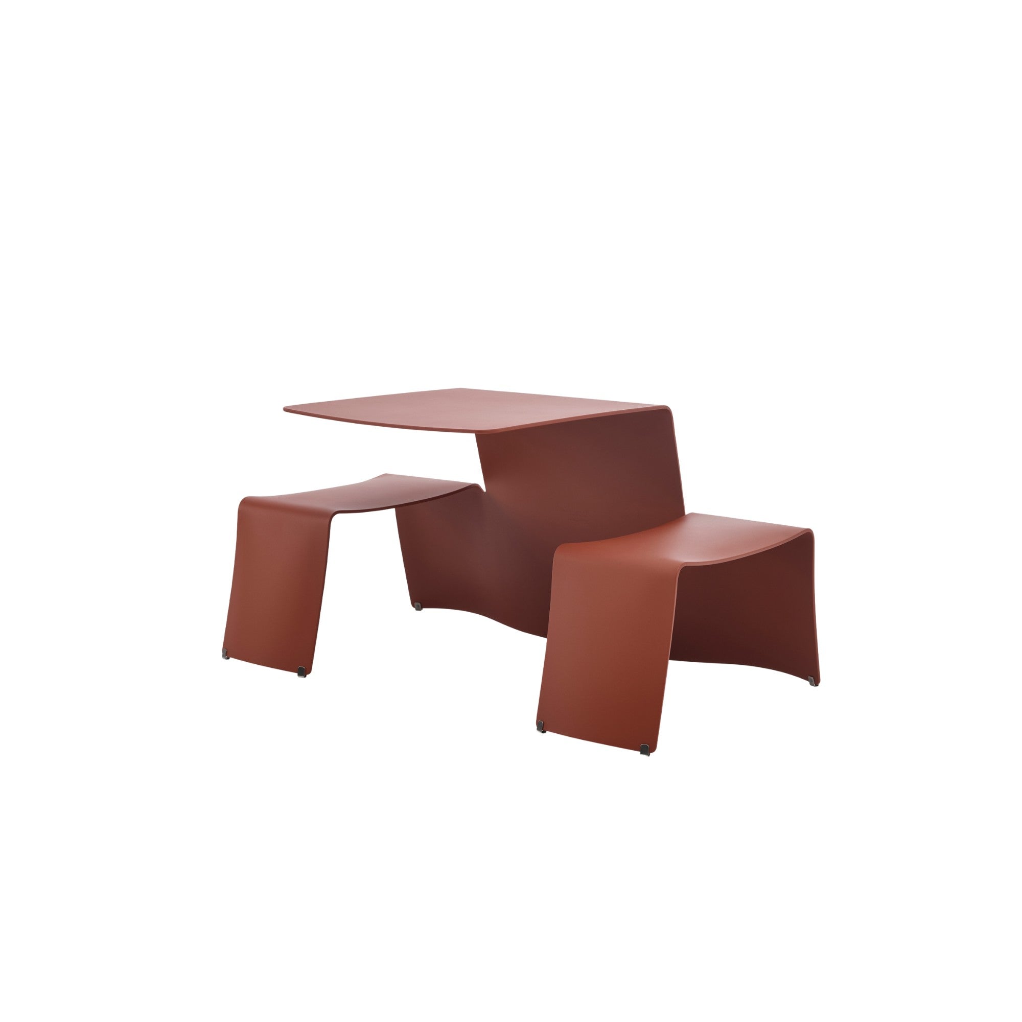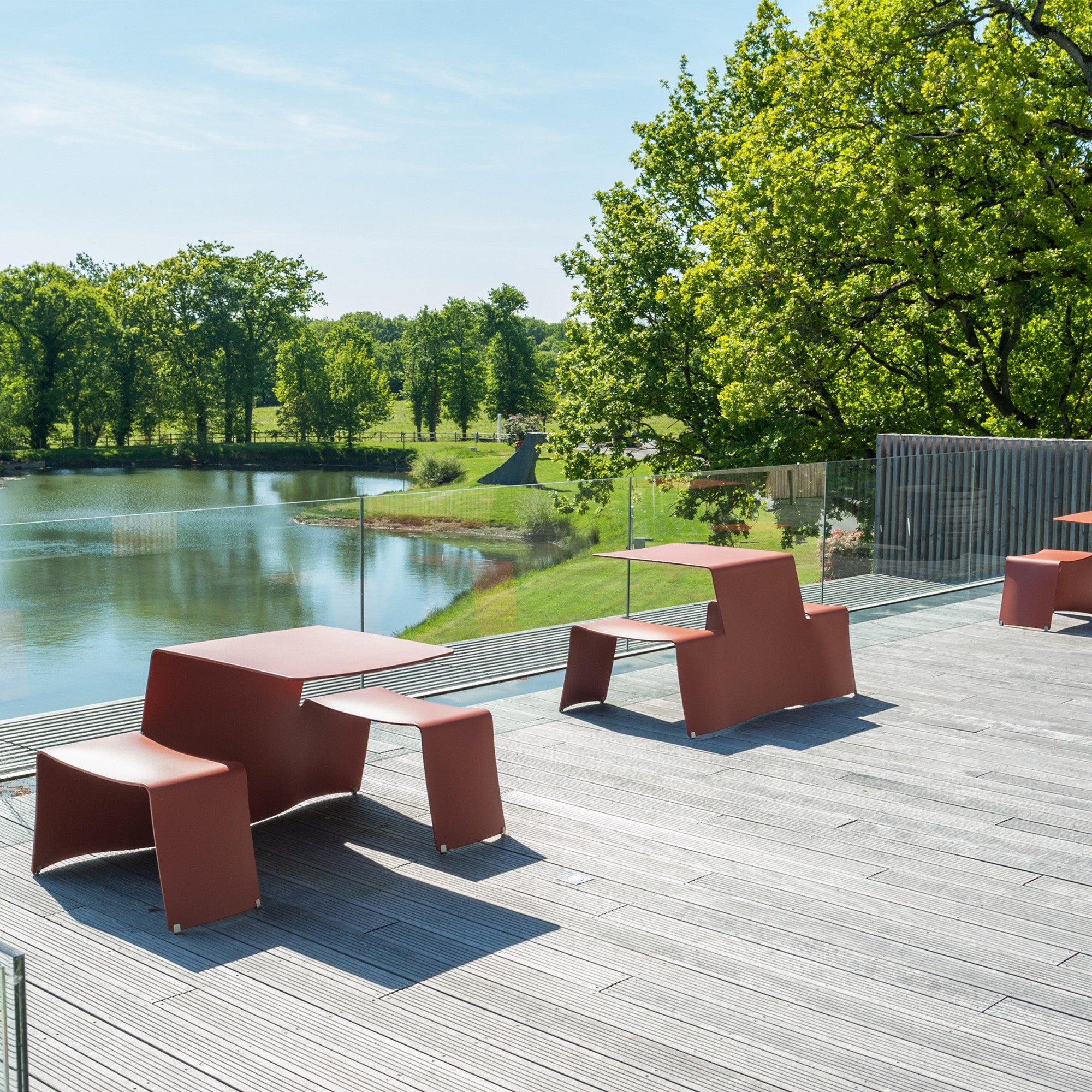 The Picnik Two-Seater by Extremis is an award-winning, sustainable outdoor table crafted from a single aluminum sheet with zero waste. Seating two comfortably, it combines sleek design with durability, making it ideal for terraces, gardens, or patios while exemplifying functional elegance.