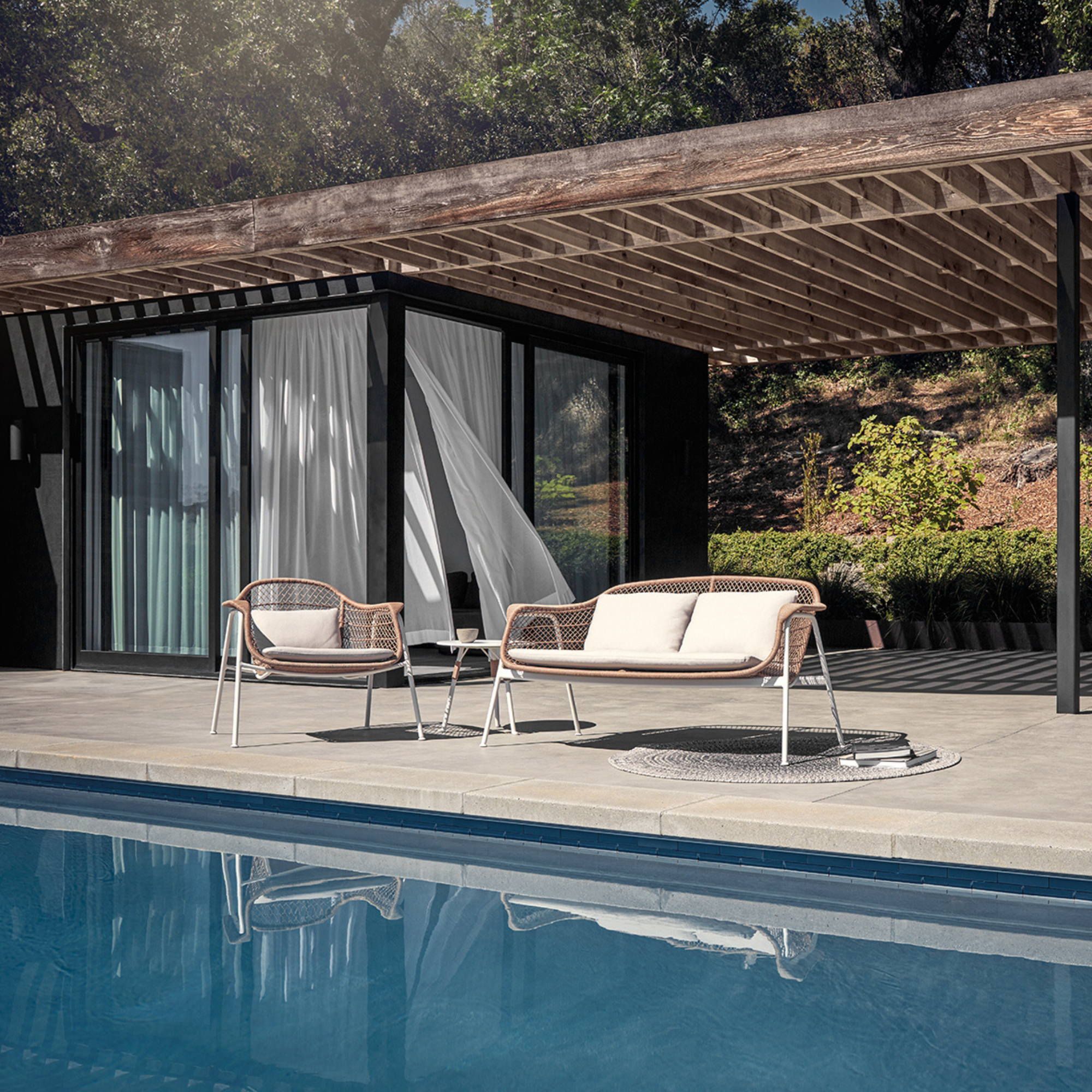 The Gloster Fresco 2‑Seater Sofa features a white powder-coated aluminum frame, wheat-coloured all-weather wicker, and soft Blend Linen cushions — bringing elegant, aerodynamic design and durable comfort to outdoor spaces.