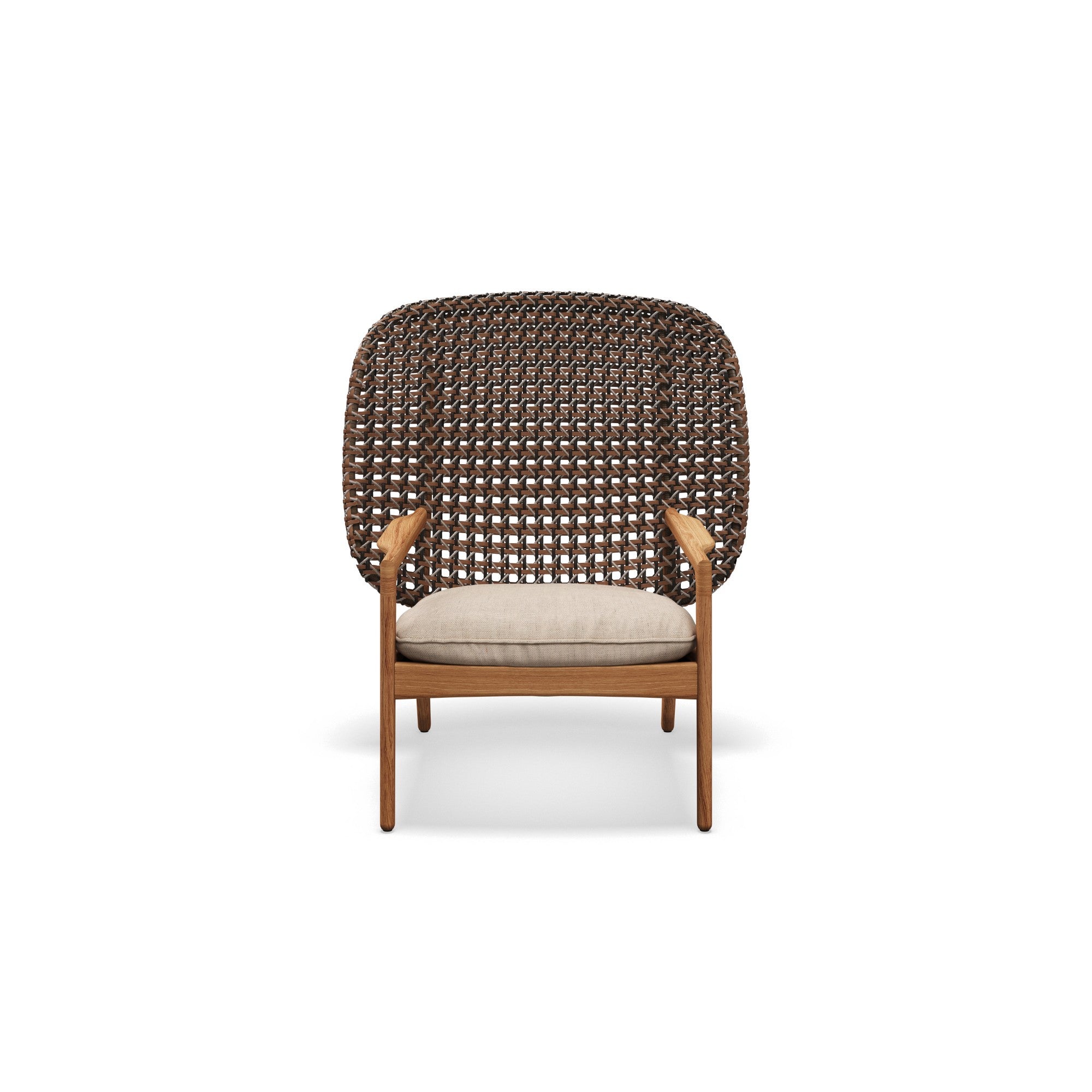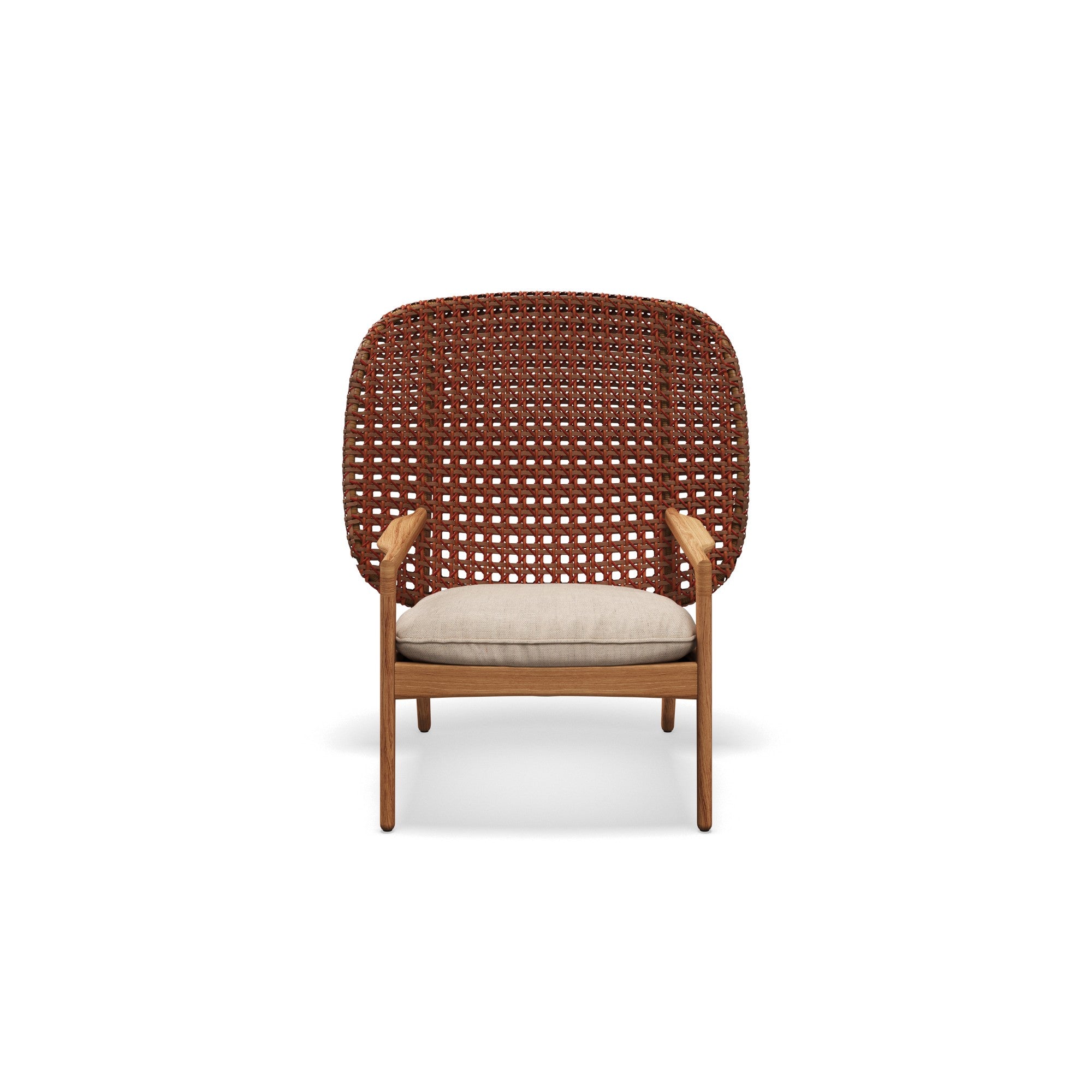 The Kay High Back Lounge Chair by Gloster offers a sophisticated blend of natural teak and woven all-weather wicker, creating a serene and inviting seating experience. Its ergonomic design and premium materials make it a perfect addition to upscale outdoor spaces.