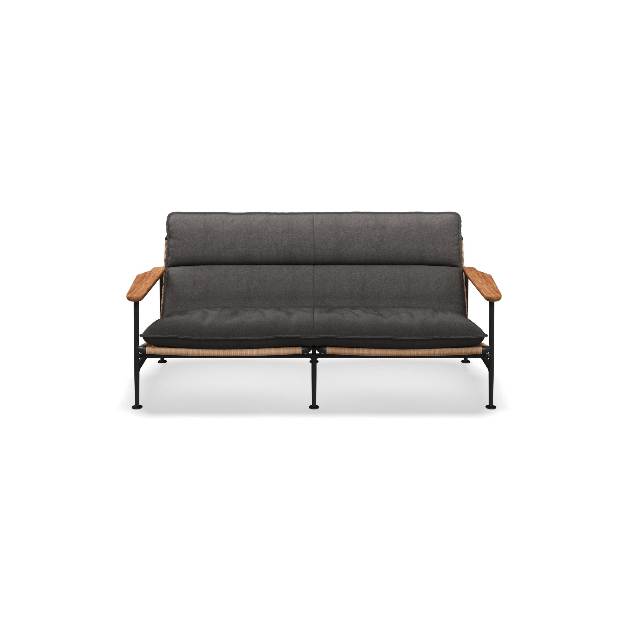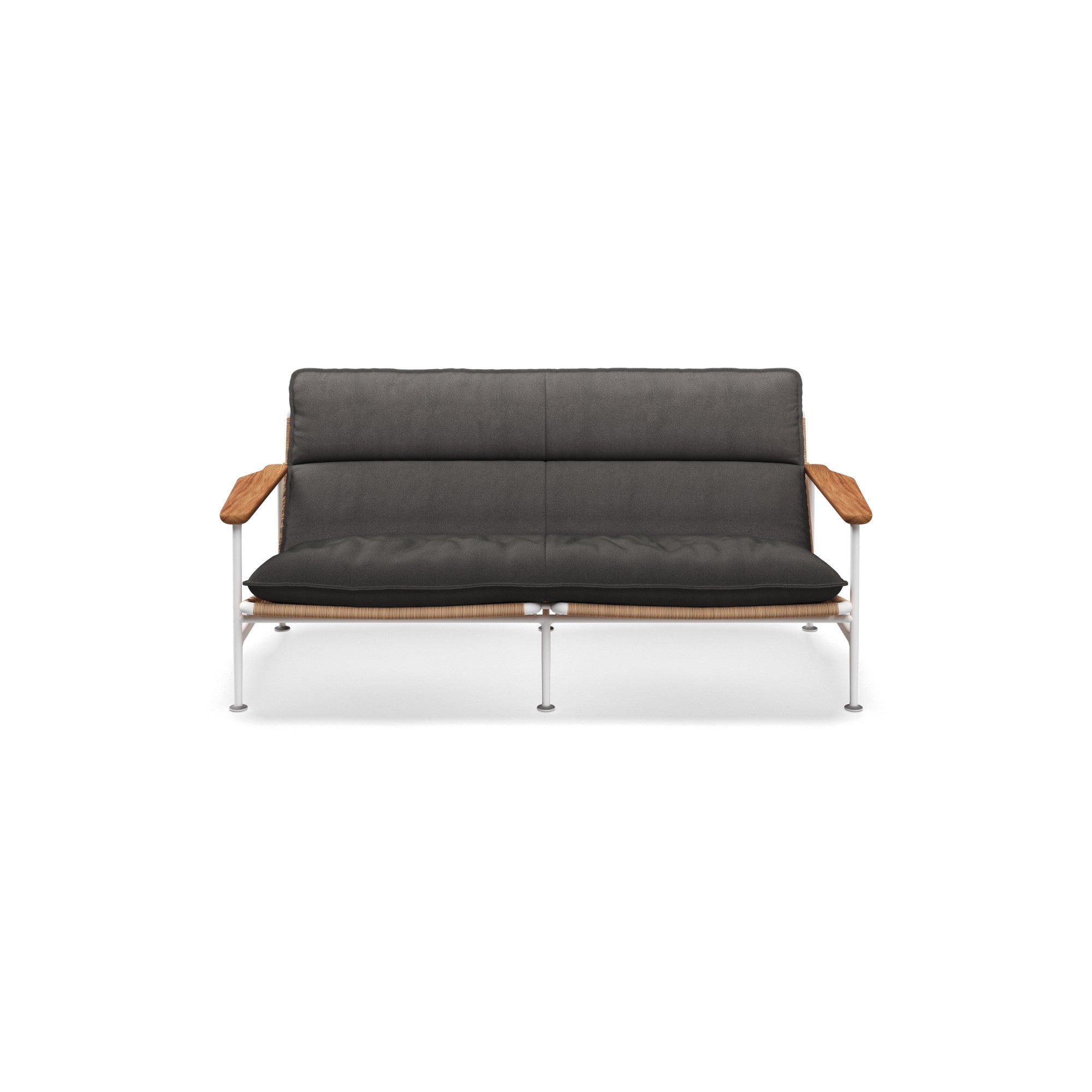 The Zenith 2-Seater Sofa by Gloster exemplifies refined outdoor living with its powder-coated Meteor aluminium frame, natural teak arms, and Wheat woven all-weather wicker panels. Cushions in Blend Coal fabric offer both comfort and durability, making it an ideal choice for luxurious alfresco spaces.