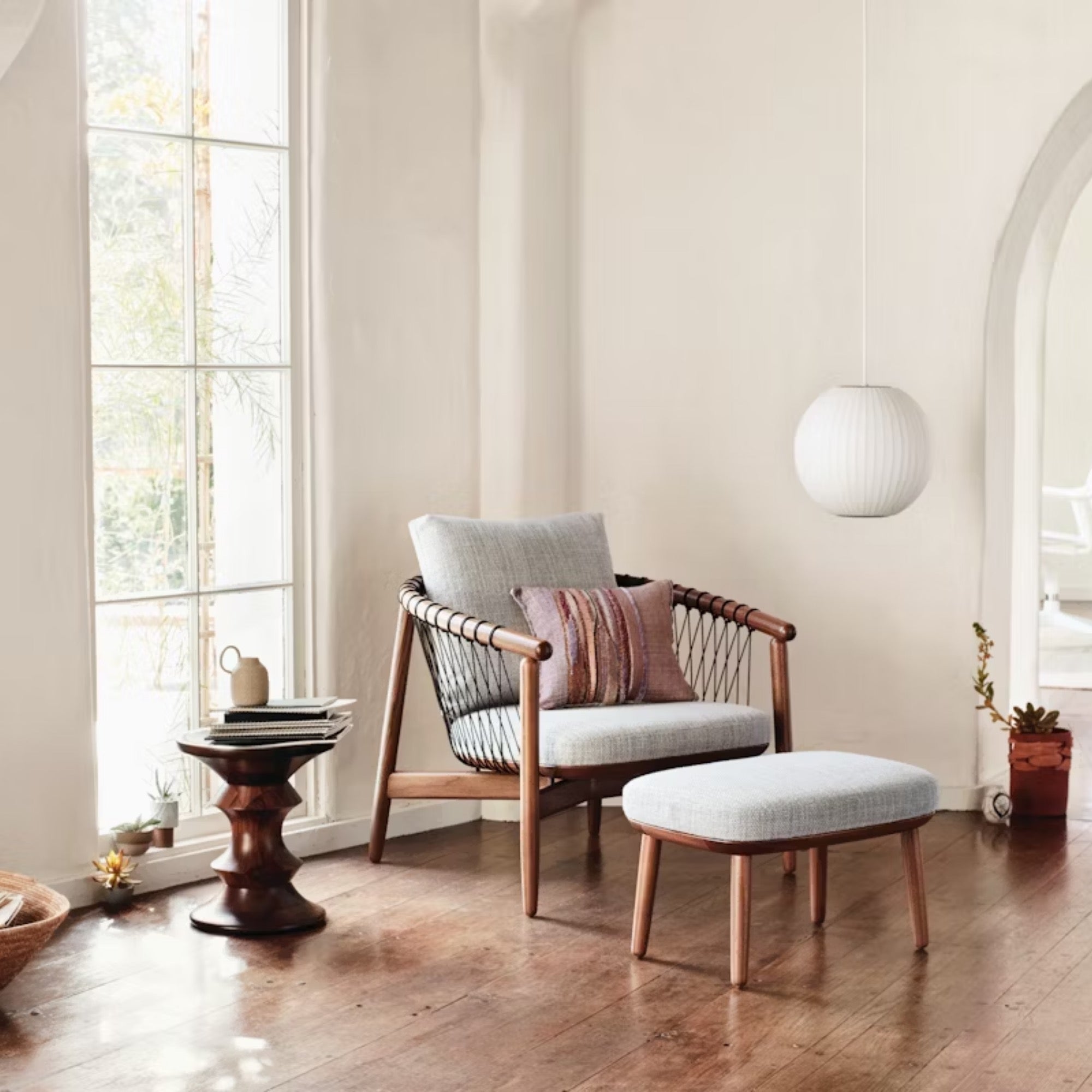 The Crosshatch Chair and Ottoman by EOOS blend craftsmanship with industrial ingenuity. Lightweight yet supportive, its parachute-cord design and elegant wood frame offer refined comfort. Versatile and timeless, this award-winning chair enhances offices, living spaces, and lounges, embodying sophistication, functionality, and modern European design excellence.