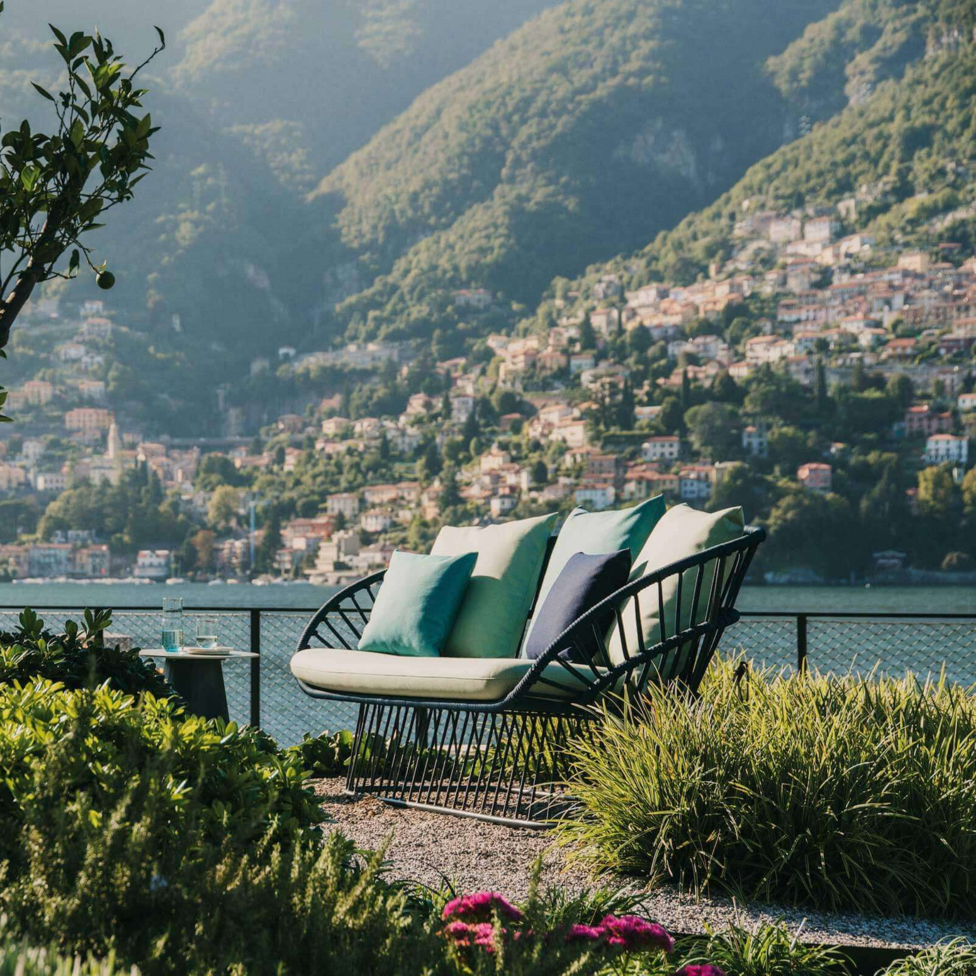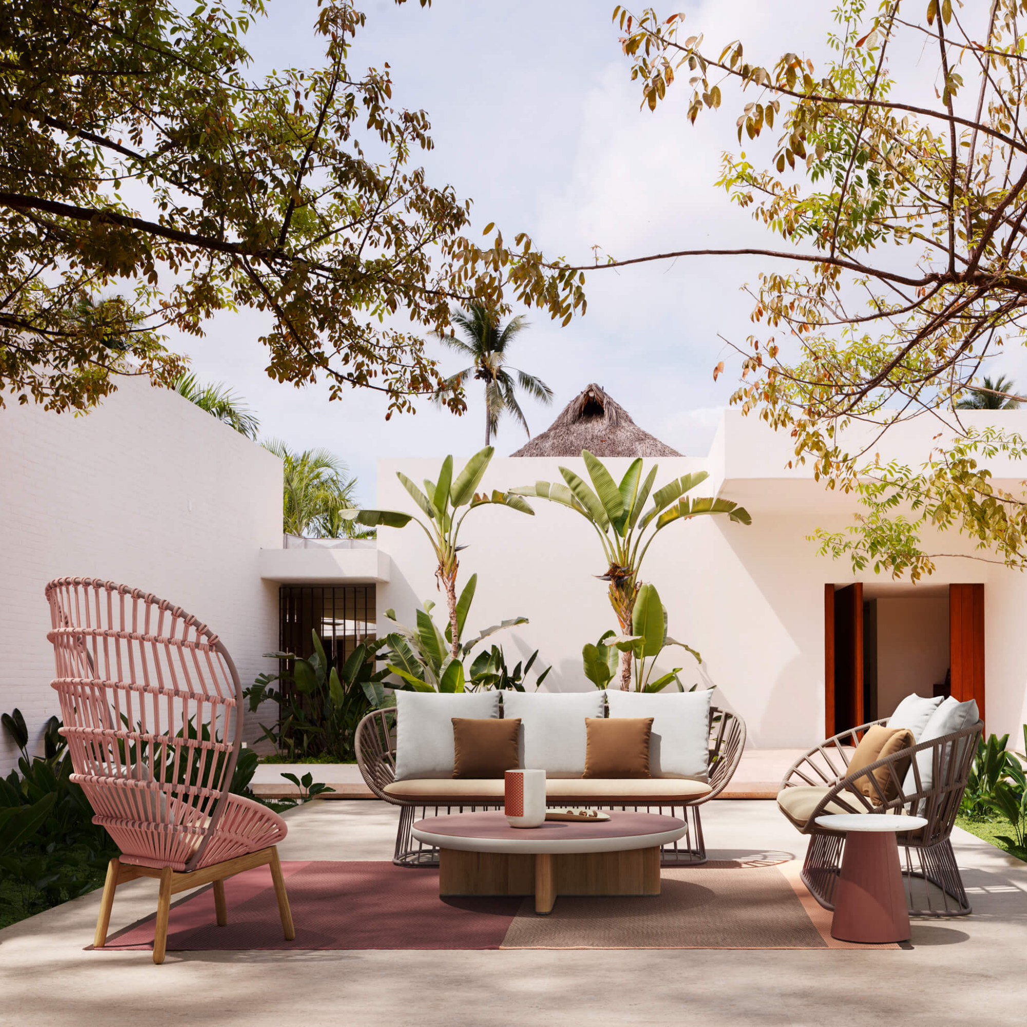 Cala Sofa – Crafted with precision, the Cala Sofa combines a sturdy aluminium frame with an intricately handwoven rope back and armrests. Generous in form and comfort, it features plush cushions and ergonomic support, balancing durability with refined elegance for effortless relaxation indoors or out.