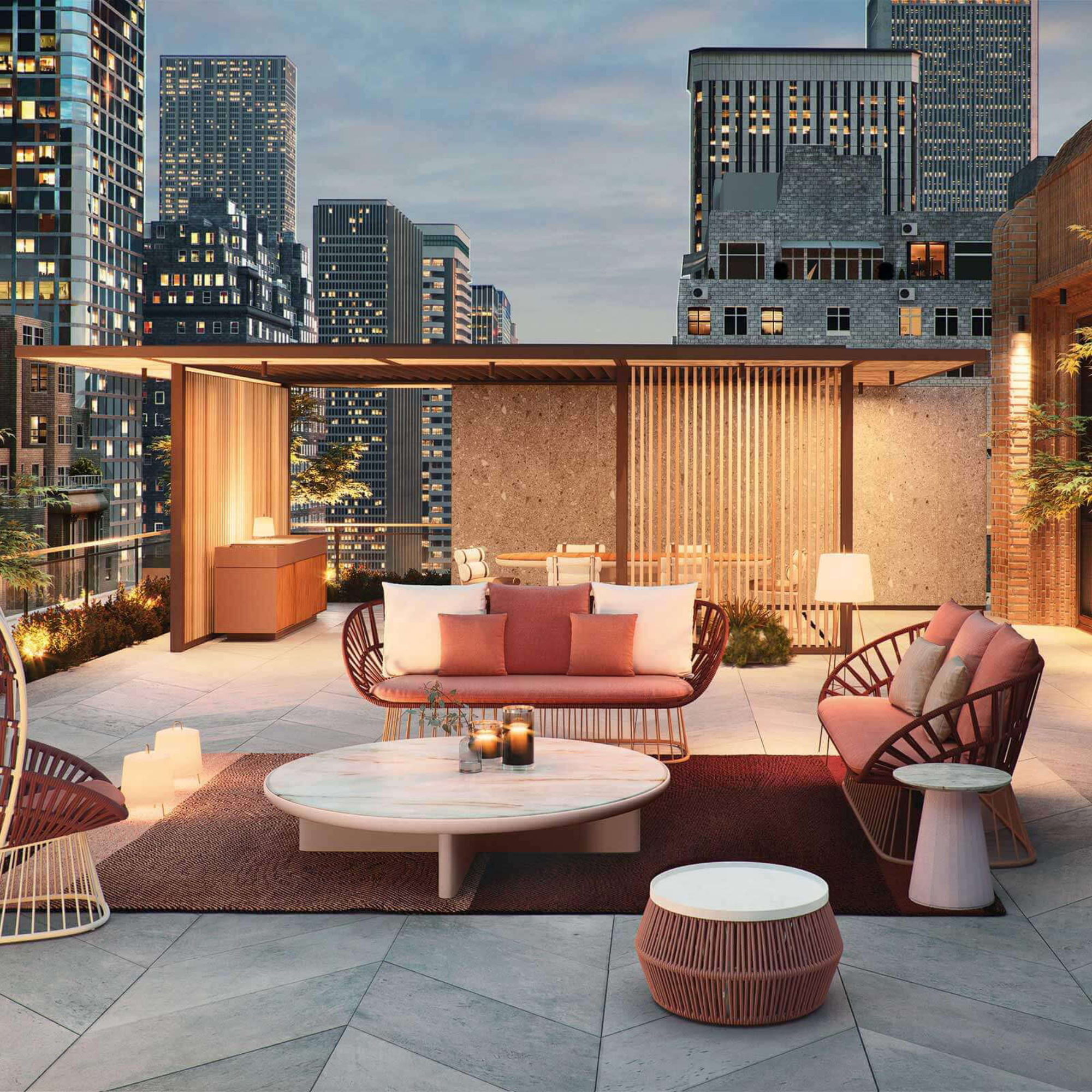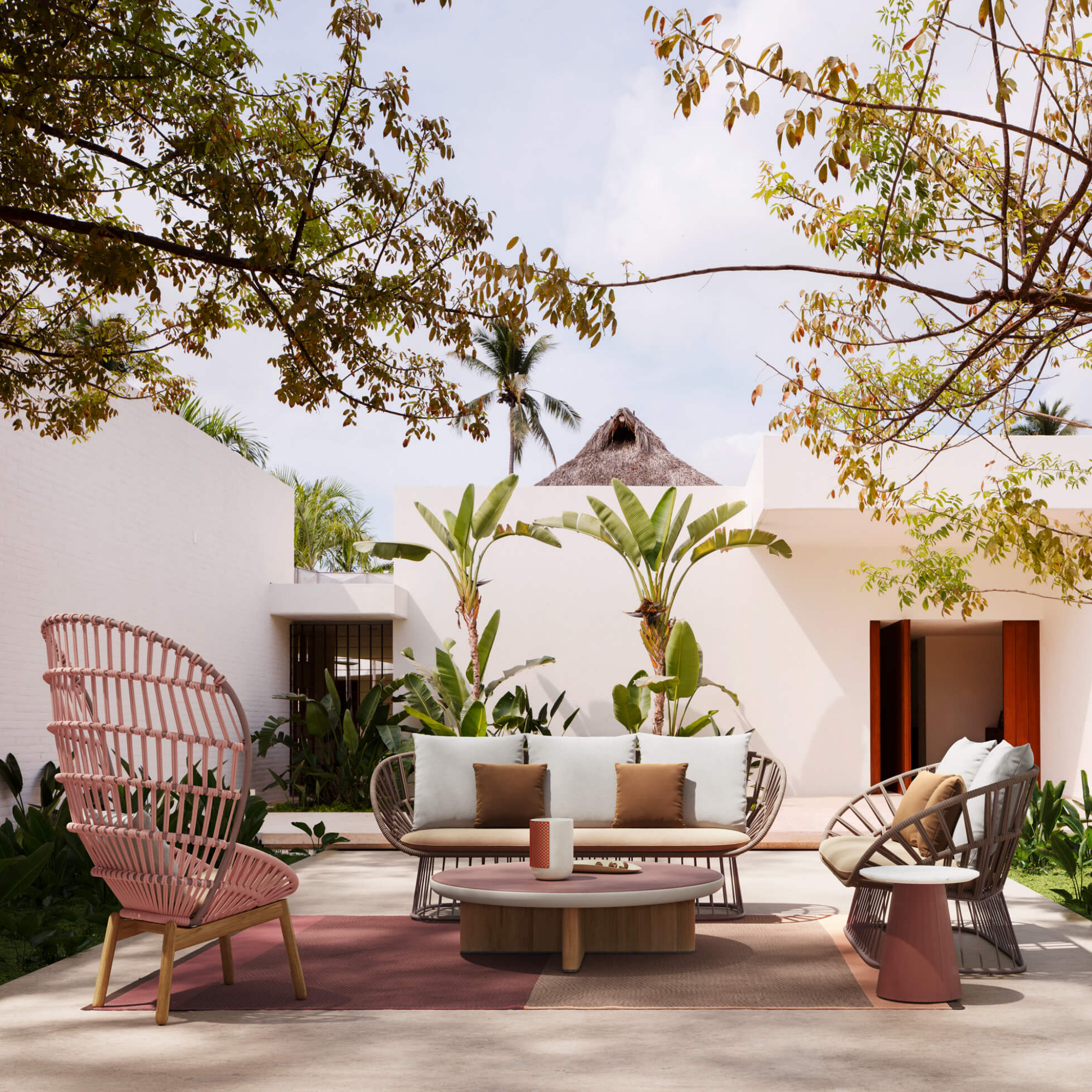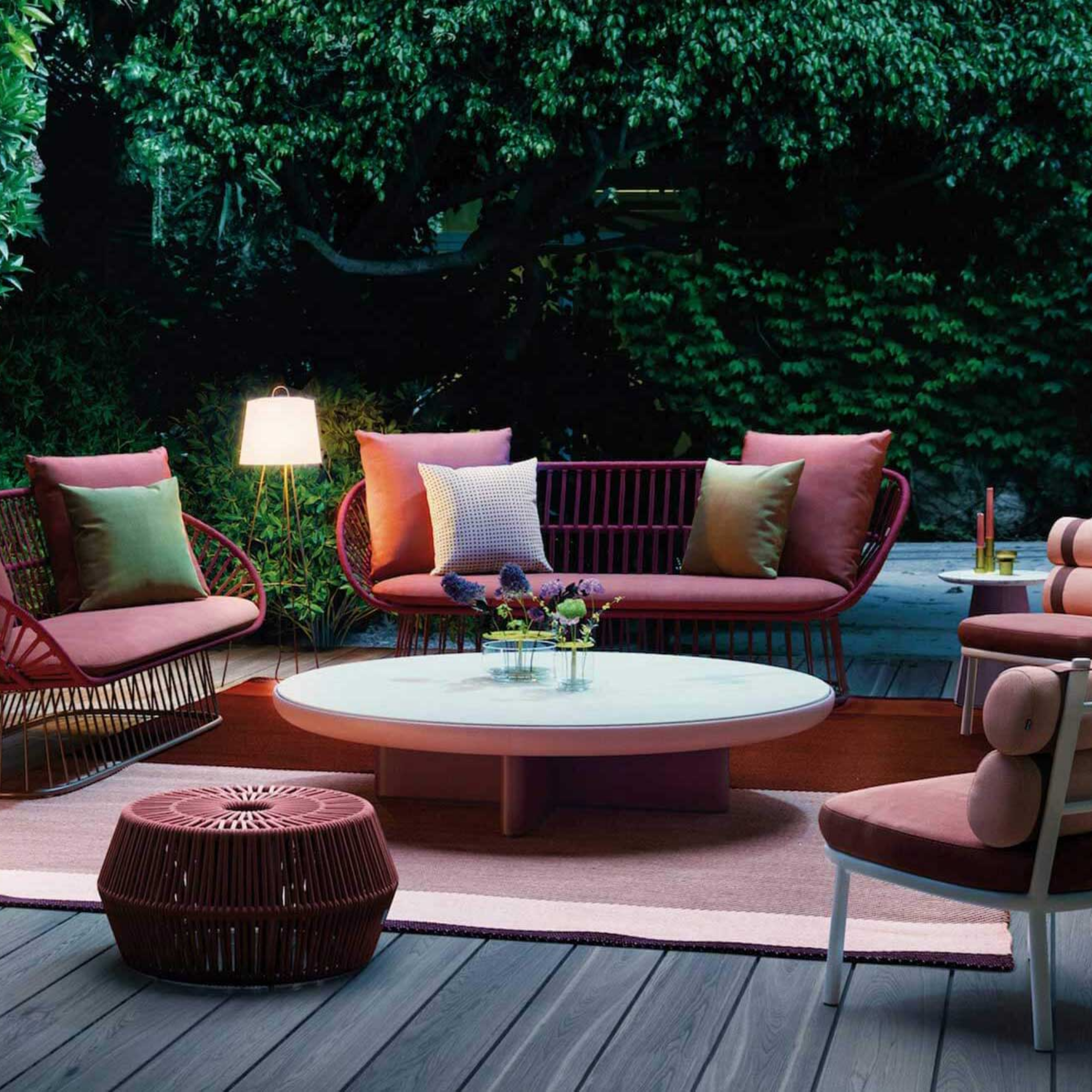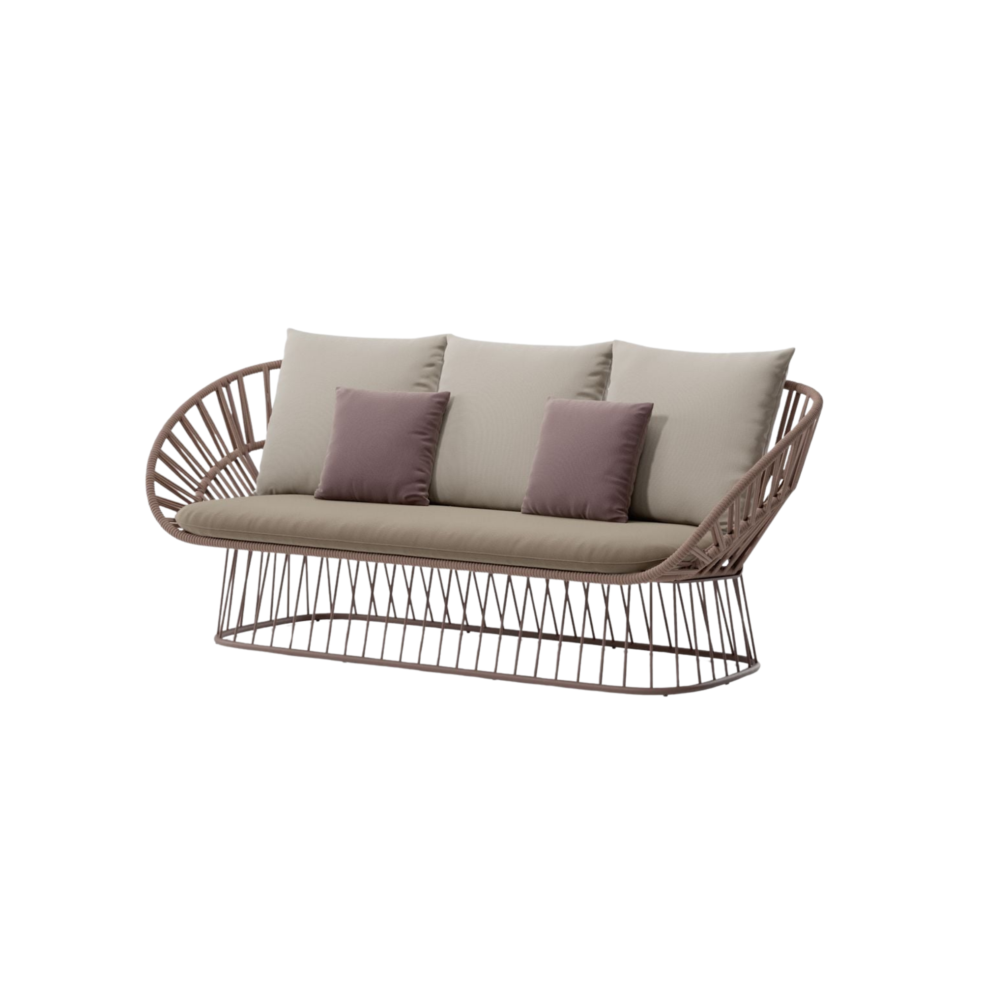Elegant and airy, the Kettal Cala 3-Seater Sofa by Doshi Levien features a high-backed rope weave on a coated aluminium frame, blending visual privacy with natural lightness for refined outdoor lounging.