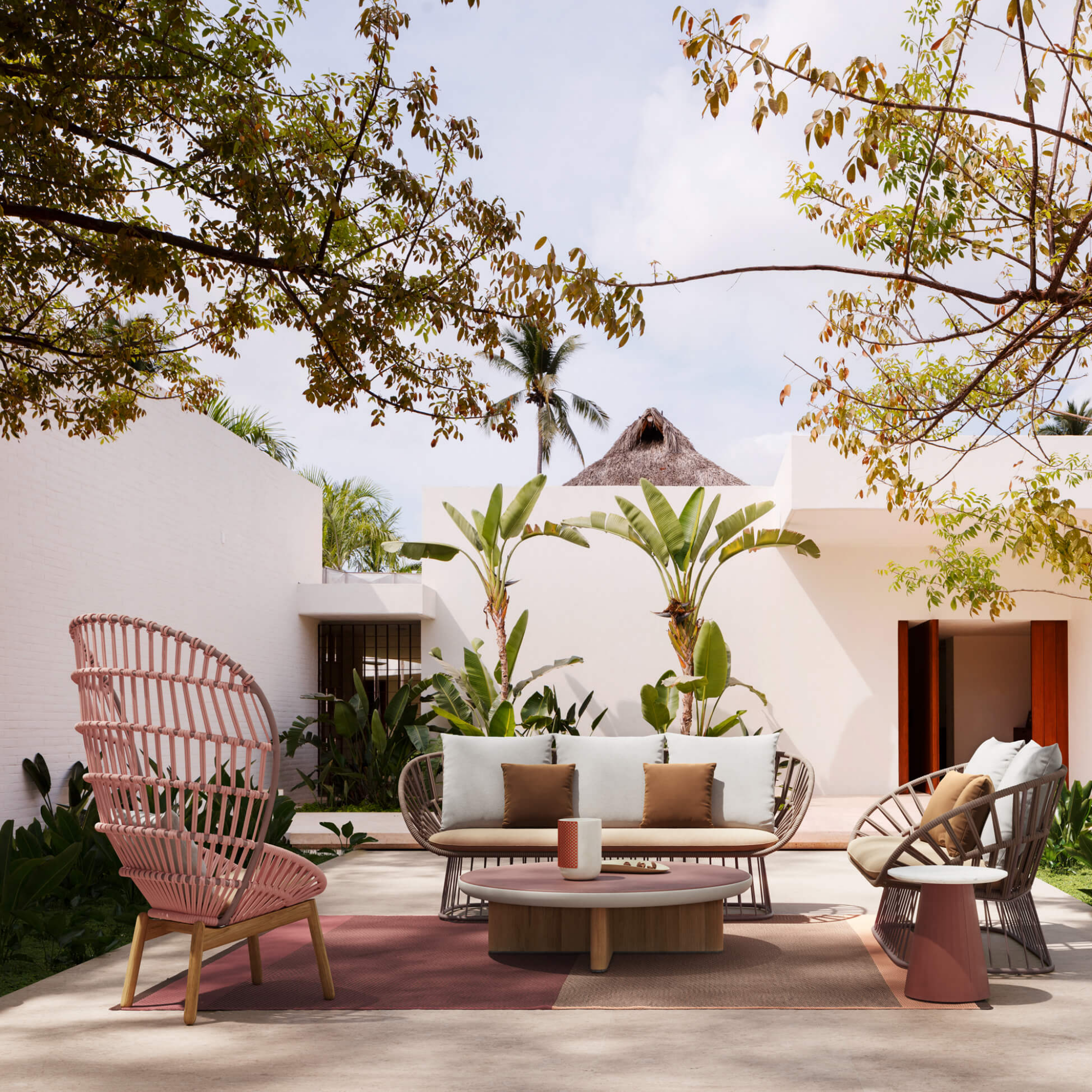 Cala Armchair – Inspired by the iconic Emmanuelle, the Cala Armchair is a high-backed statement piece that exudes elegance and openness. Its intricate rope weave creates a light, transparent structure that balances privacy with connection to the surrounding environment. Designed for both outdoor dining and relaxed lounging, Cala offers versatility through a wide selection of metal finishes, rope colours, and cushion fabrics—allowing each piece to be uniquely tailored to any setting.