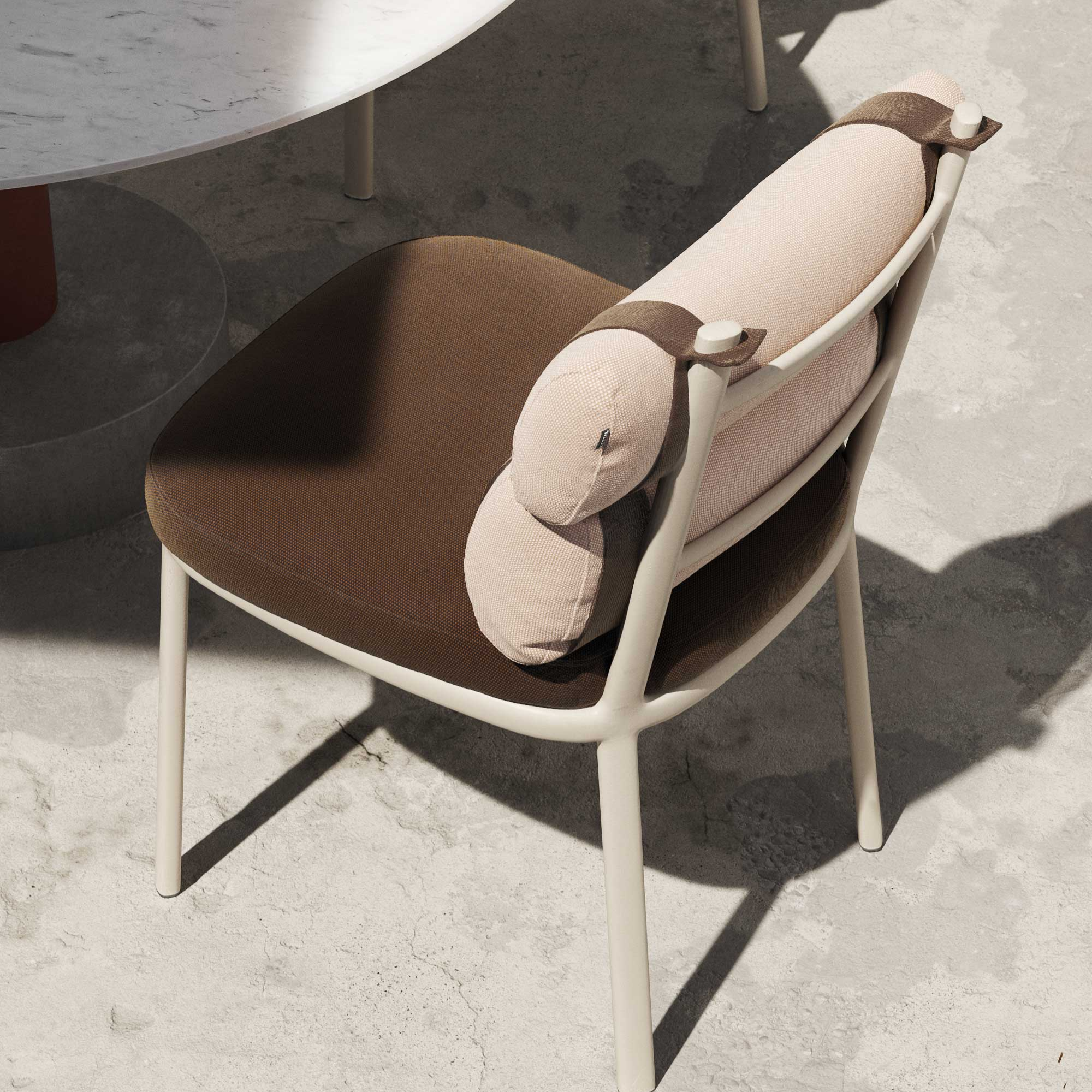 The Kettal Roll Dining Chair, designed by Patricia Urquiola, features a minimalist aluminium frame with distinctive rolled cushions secured by colourful straps. This playful yet sophisticated design offers comfort and versatility, making it suitable for both indoor and outdoor dining spaces.