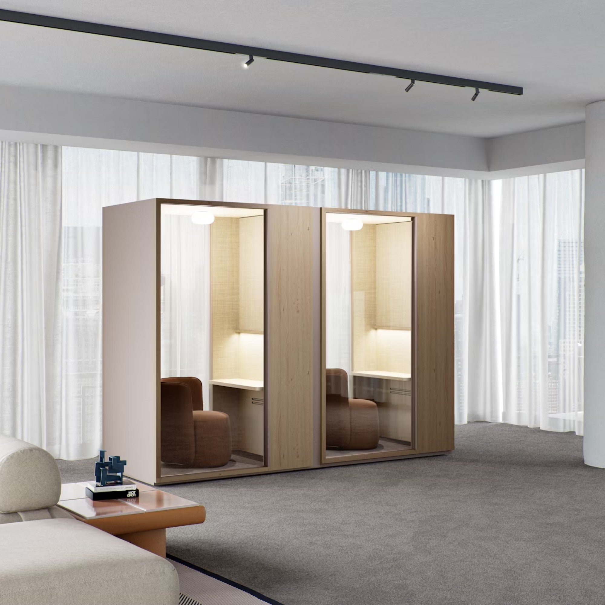 The Kettal Kall M is a modular acoustic phone booth designed for private, comfortable conversations in modern workspaces. Featuring soundproofing up to 35 dB, dimmable 3000K LED lighting, silent ventilation, and optional adjustable desk and stool, it ensures productivity and privacy.