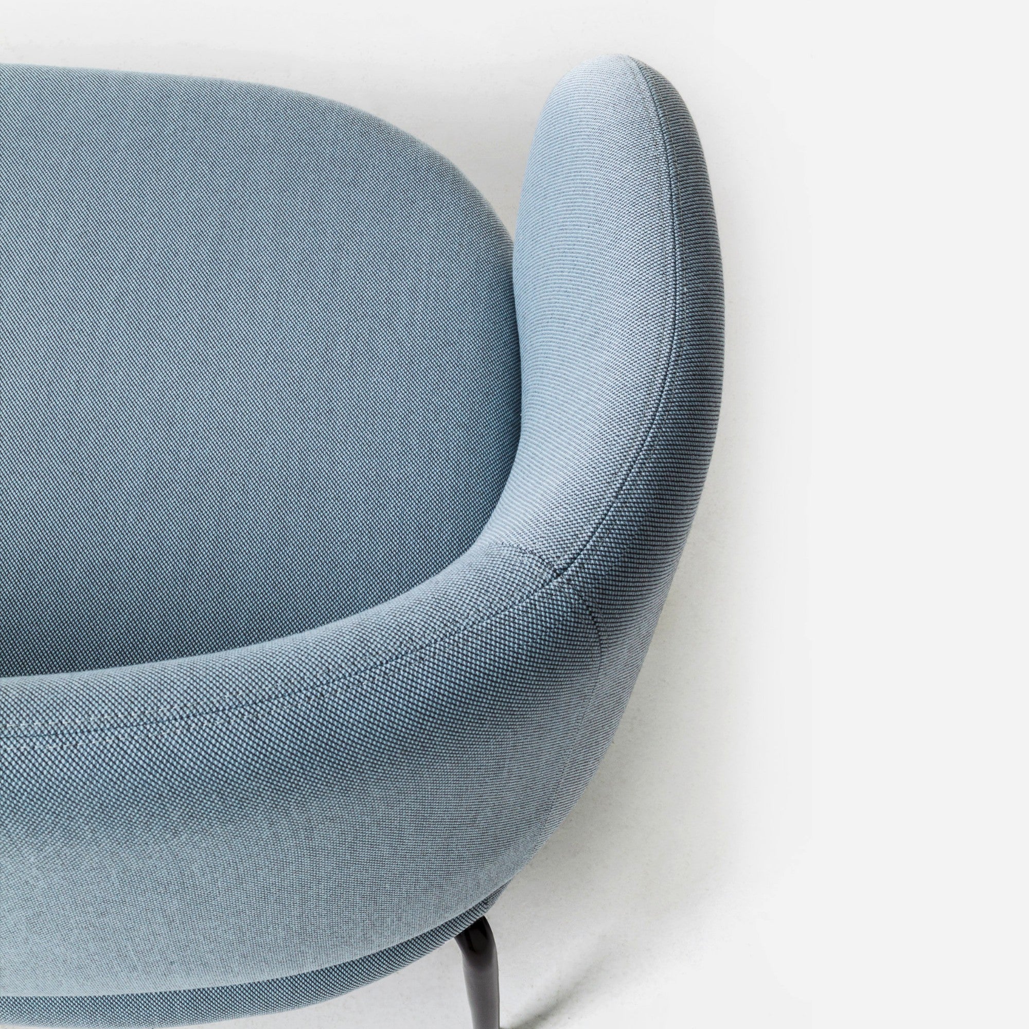 The Soave collection of armchairs and sofas features elegant elliptic forms, layered into seats and backrests—discreet, enveloping, or asymmetrical. Rounded corners and slim metal legs create a soft, airy look. Paired with its small support table, Soave is ideal for contract settings and exhibition spaces.