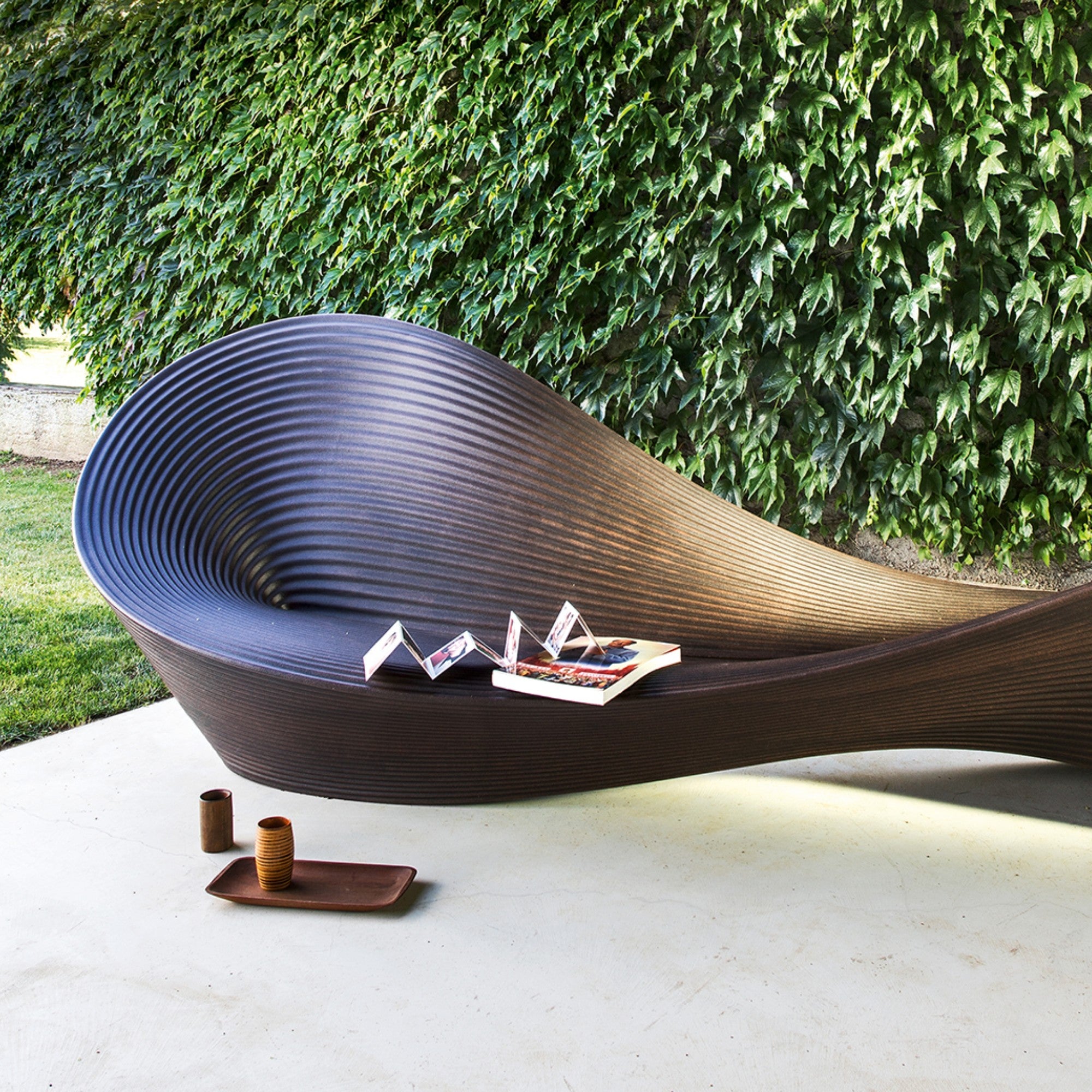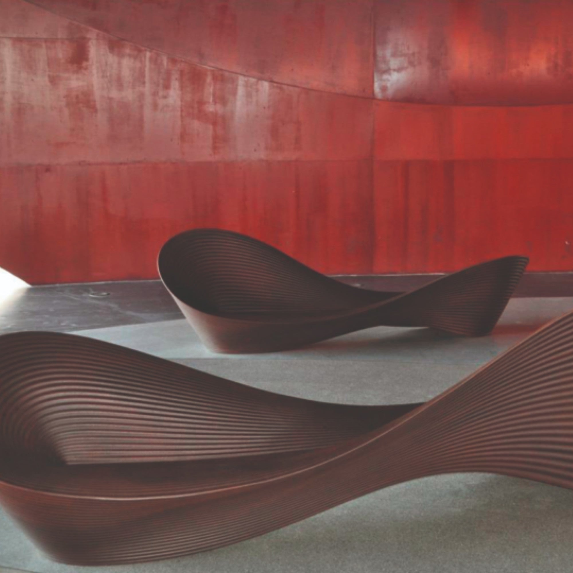 Designed by Ron Arad in 2011, the Folly Bench is a sculptural outdoor seating piece crafted from rotational-moulded polyethylene. Its organic, flowing form accommodates 8–10 people and is available in a rust-brown finish that mimics weathered steel. Ideal for gardens, parks, or public squares, it combines artistic expression with functional comfort.