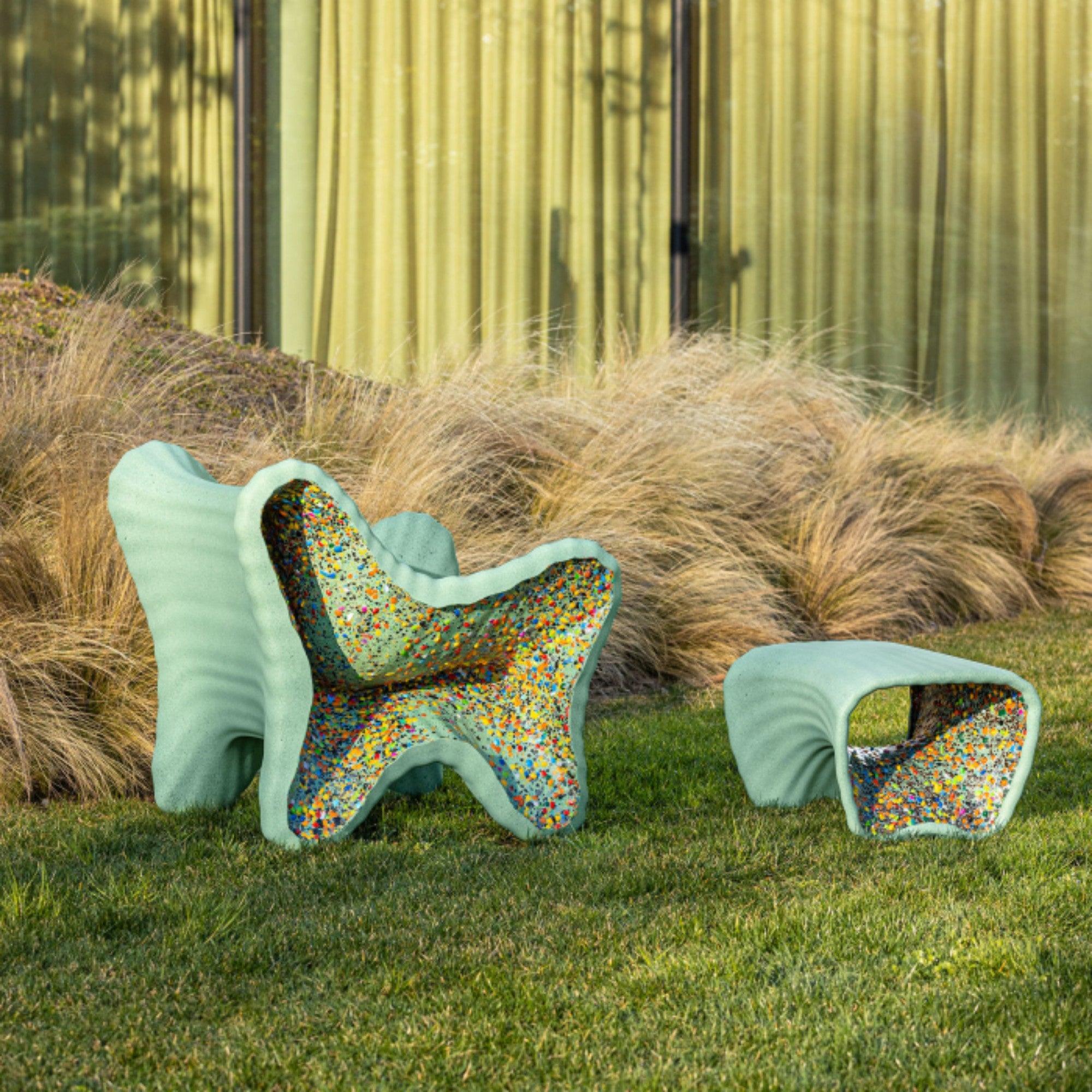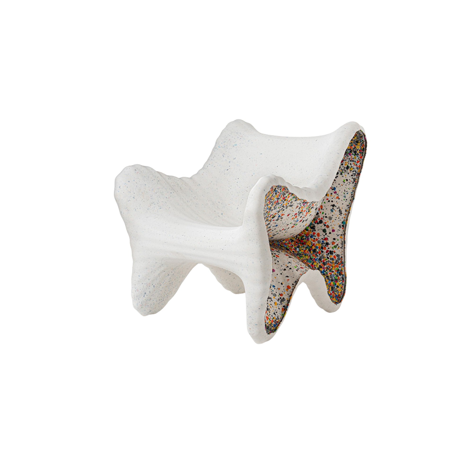 In-Side by Thomas Heatherwick (2024) is a sculptural seat crafted from recycled polyethylene with multicolored flakes, making each piece truly unique. Designed for outdoor use, it embodies sustainable luxury and modern artistry, with an optional cushion for added comfort.