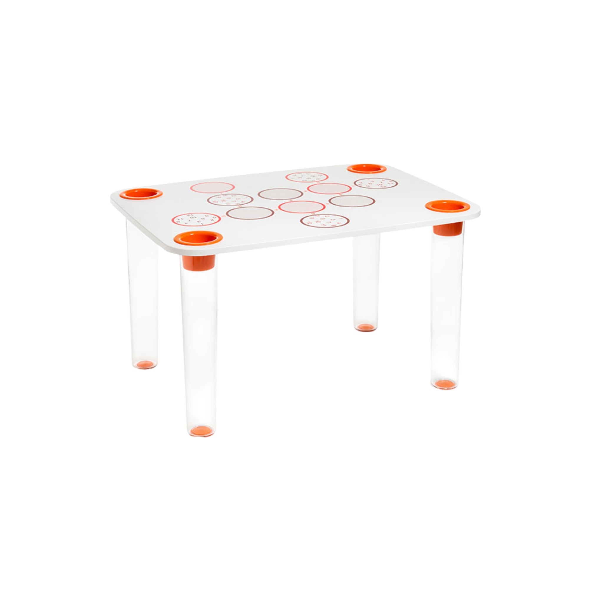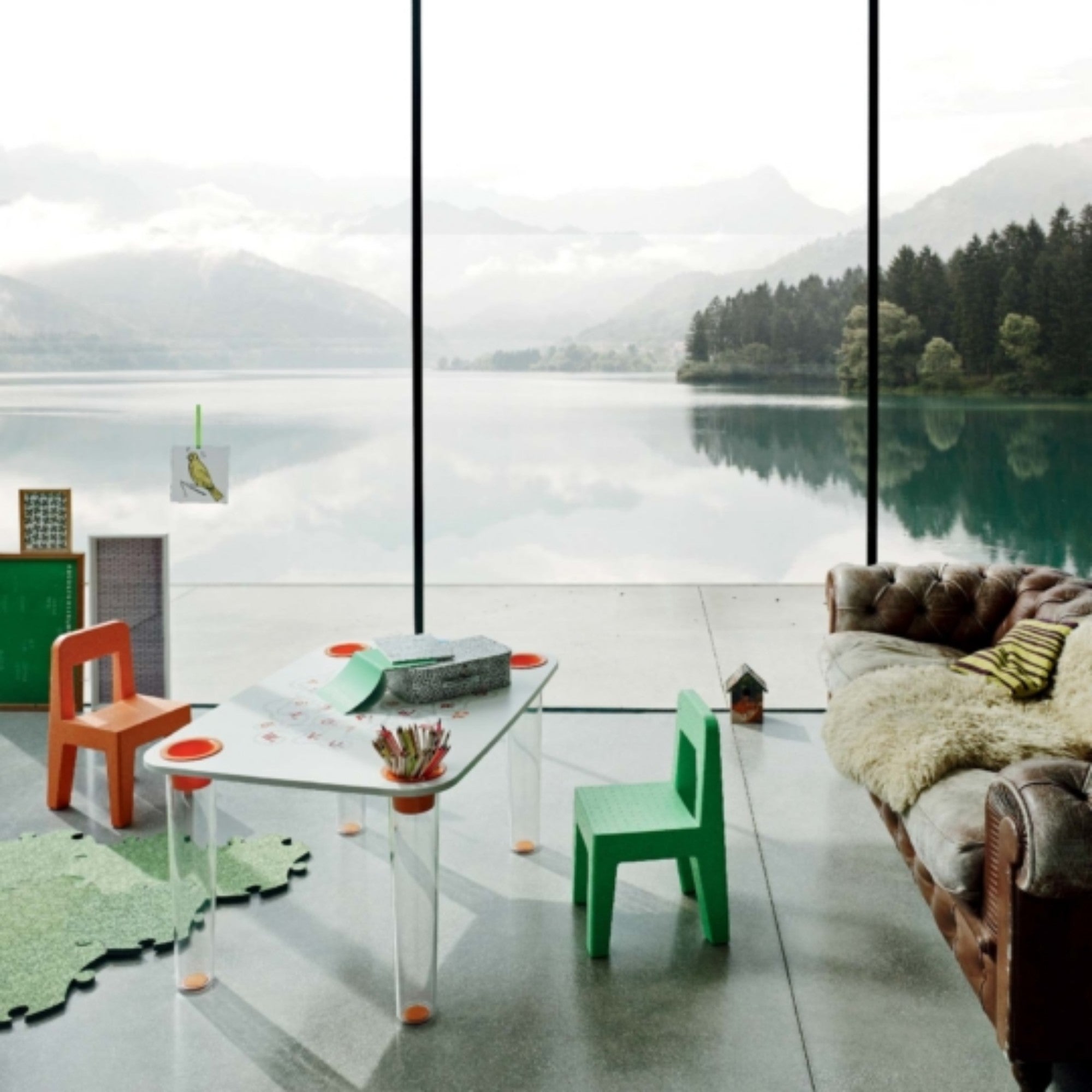 Designed by Marcel Wanders in 2005, the Little Flare Table is a playful and functional children’s table. It features transparent polycarbonate legs, patterned MDF tops with a polymeric cover, and integrated ABS pen holders, combining durability with whimsical, practical design for creative spaces.