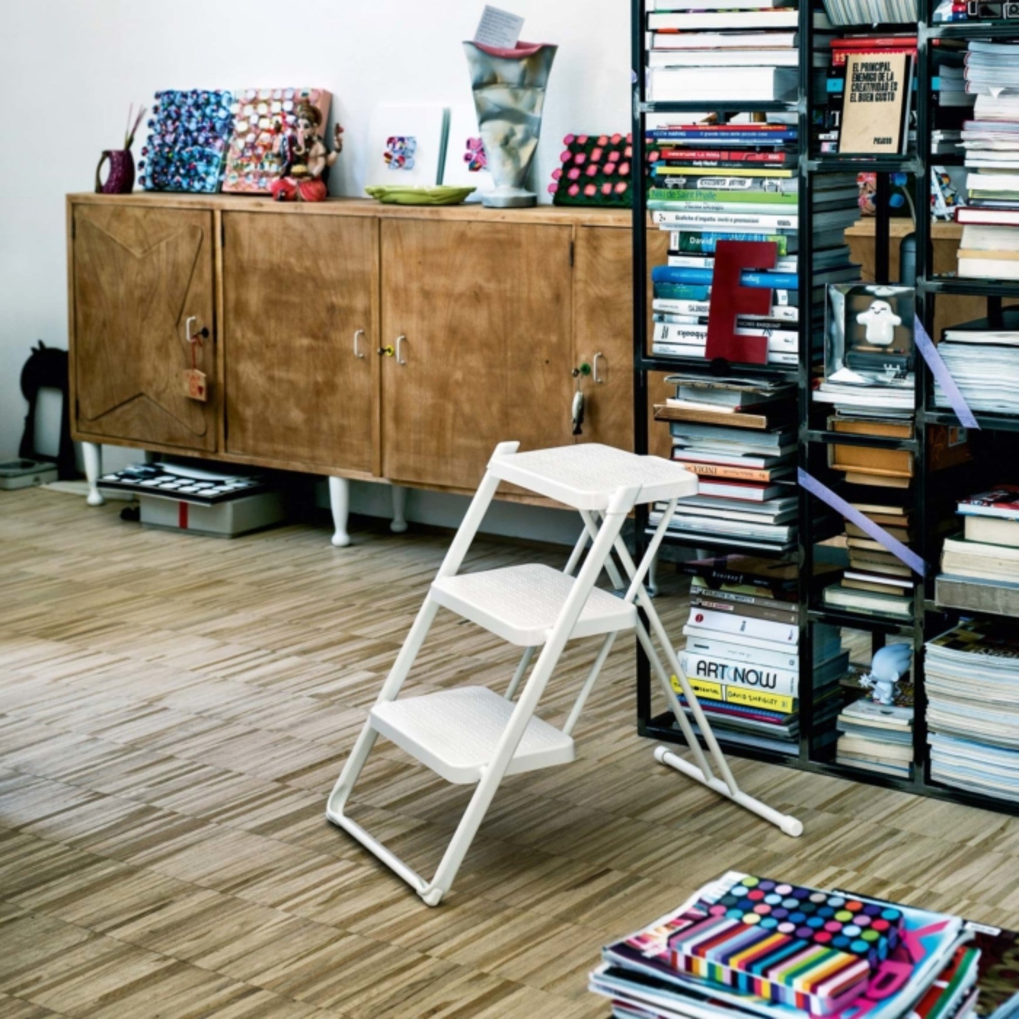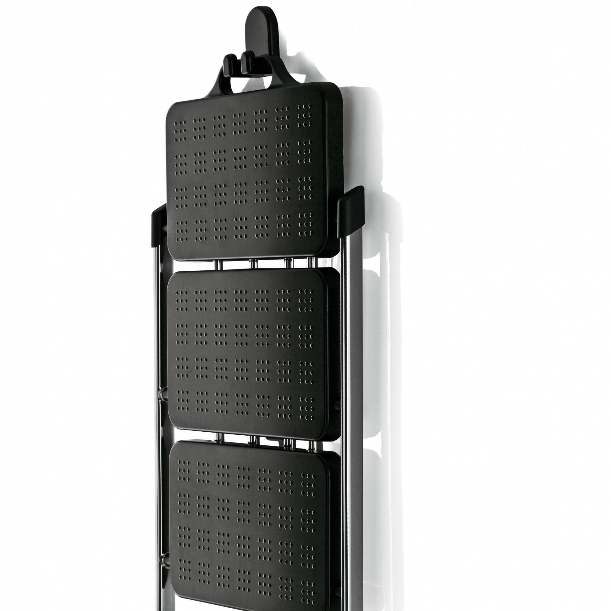 Designed by Andries & Hiroko Van Onck (1984/2003), the Nuovastep is a versatile folding step-ladder. Featuring a chromed or epoxy-painted steel frame, ABS steps, and a die-cast aluminium lock, it includes a wall hook for convenient storage, combining safety, durability, and practical design.