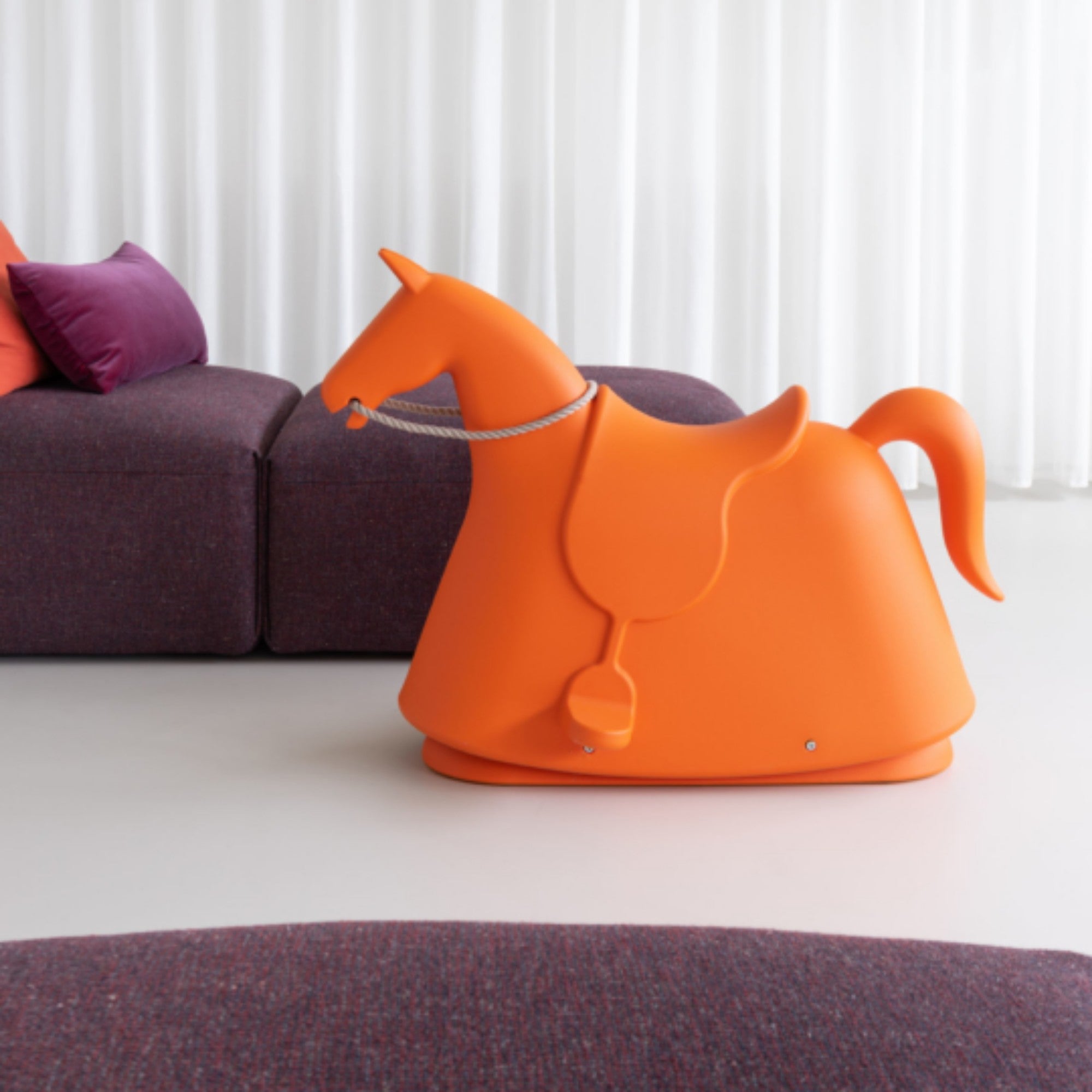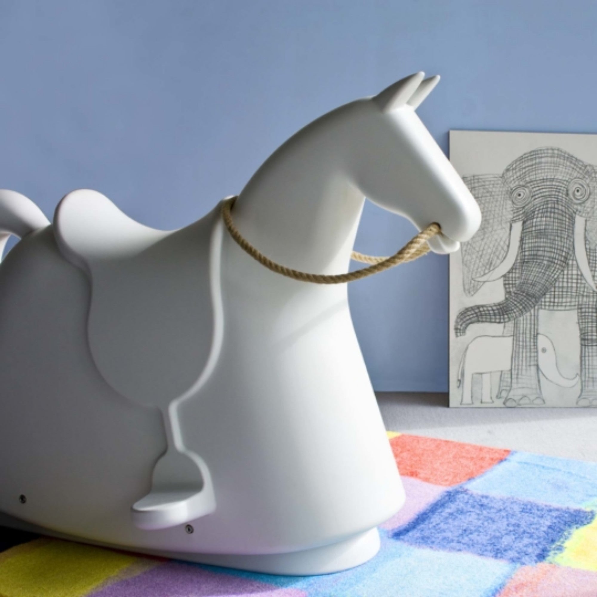 Designed by Marc Newson in 2012, Rocky is a modern rocking horse crafted from rotational-moulded polyethylene. Featuring a natural hemp rope rein, it combines playful design with durability, making it a stylish and functional piece for children’s spaces.