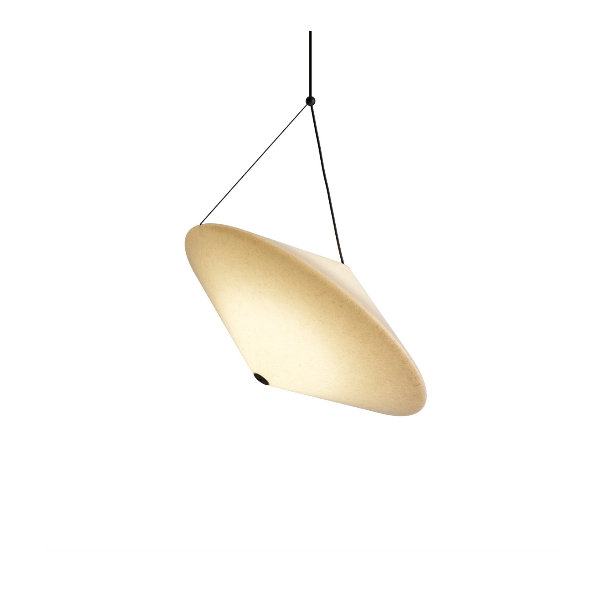 Rificolona pendant blends playful creativity with sustainable design. Crafted from recycled polyethylene, its rotating shade interacts with light, enhanced by a transparent spray. Gracefully adjustable, it hovers above your space, offering dynamic illumination and a delicate, versatile presence for modern, eco-conscious interiors.
