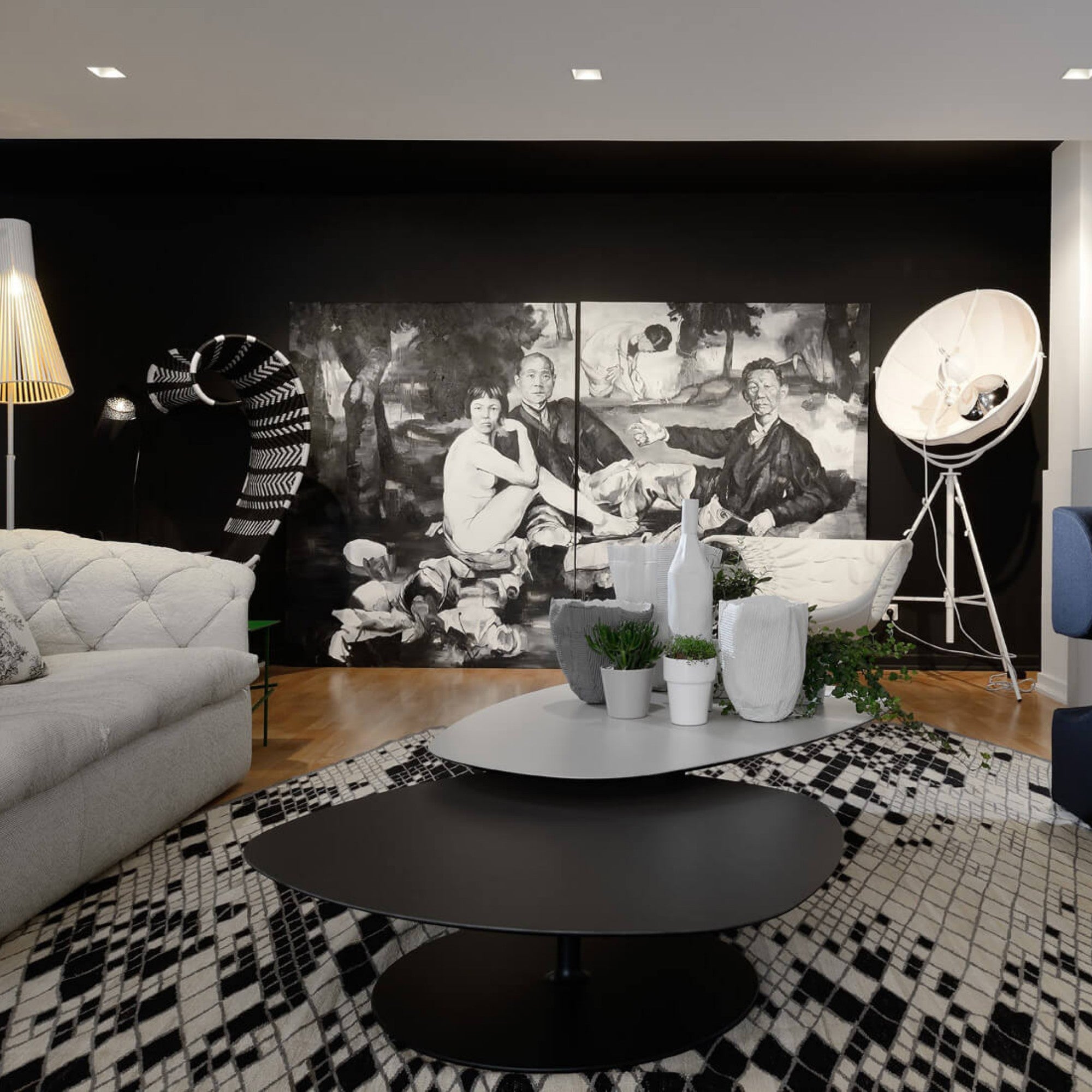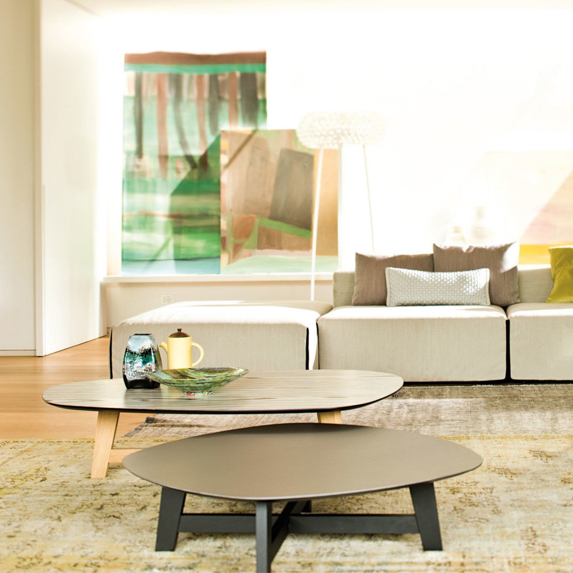 The Phoenix side tables feature ovoid forms that overlap in fluid harmony, creating dynamic compositions inspired by organic shapes and futuristic design. Available with steel or wooden bases in varied heights, and tops in Laminam or Alpi veneer, they bring sculptural elegance to modern interiors.