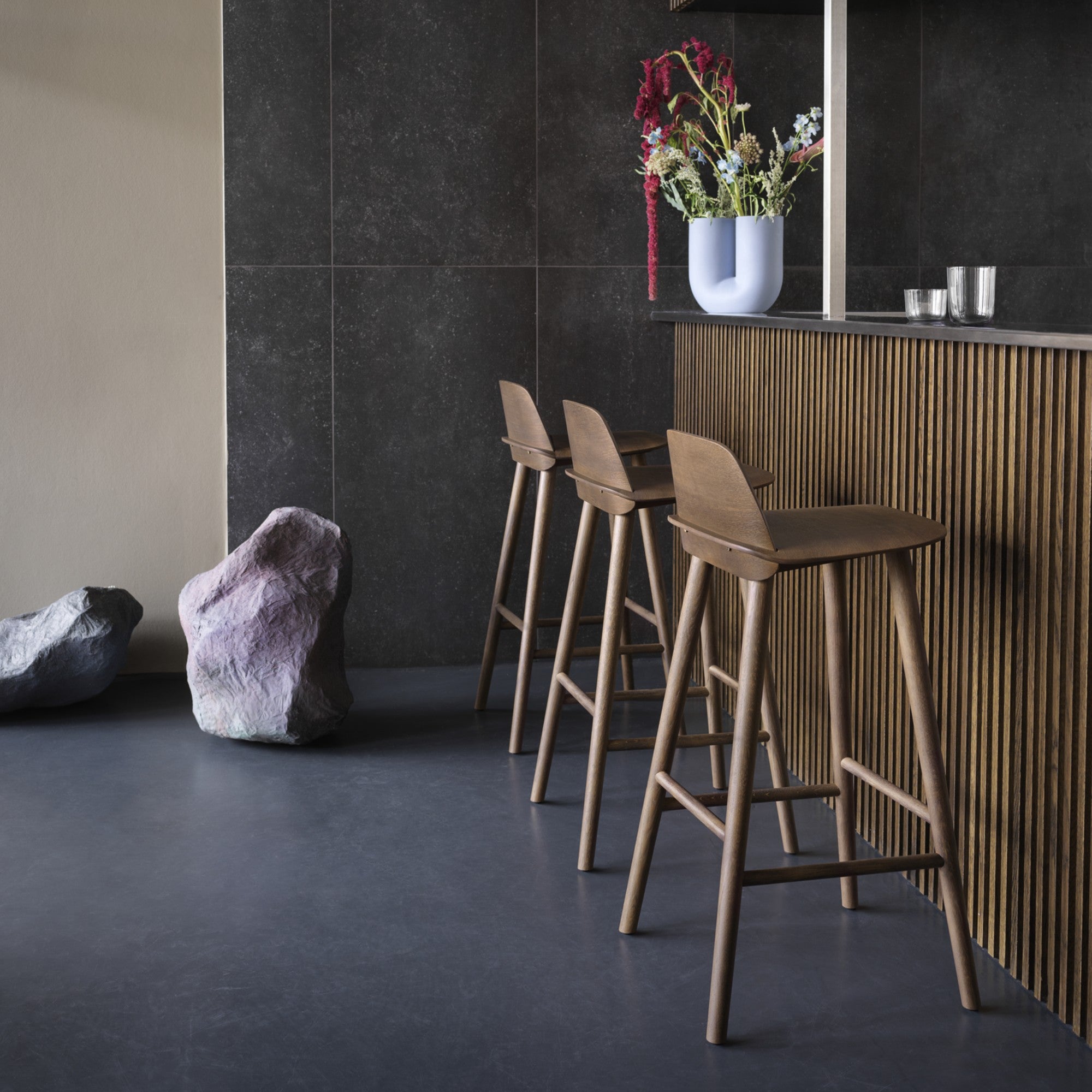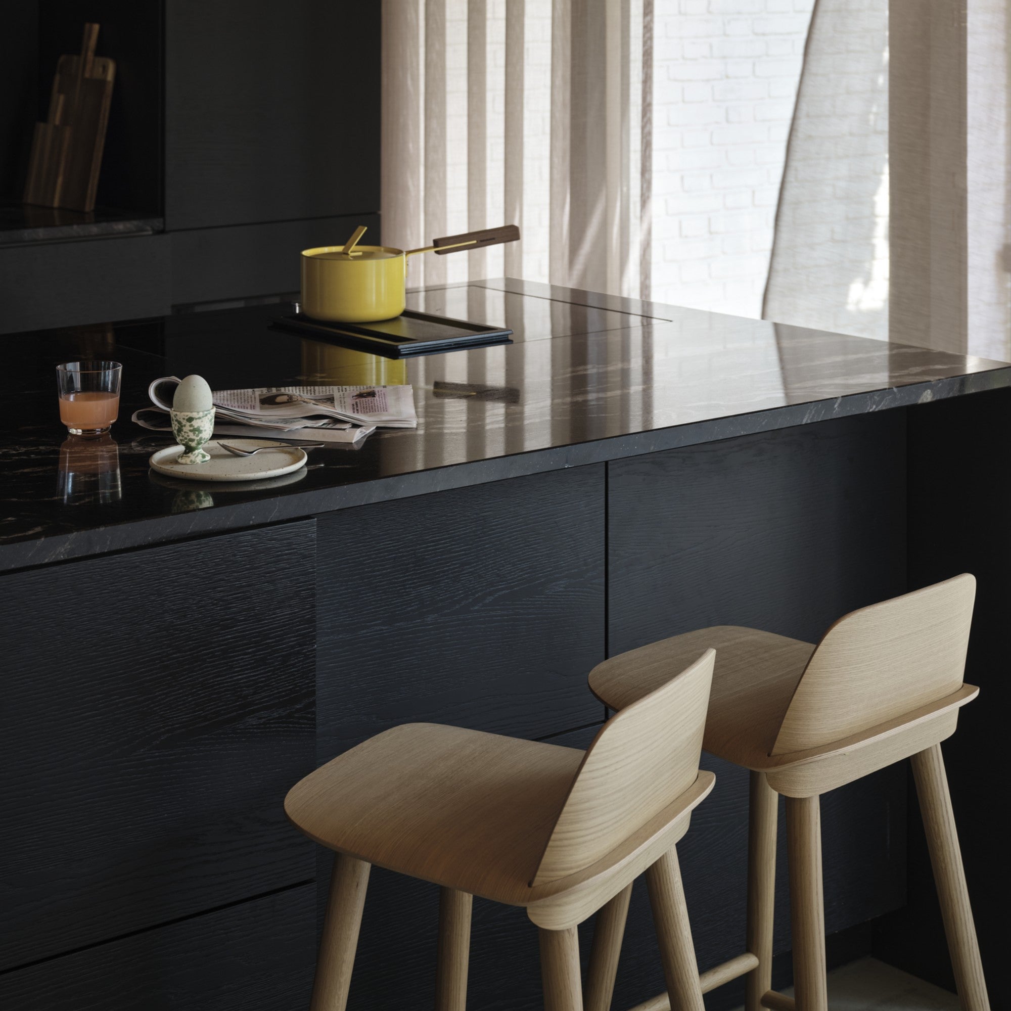 The Nerd Counter Stool blends playful contemporary design with warm Scandinavian wood. Its seamless back-to-seat integration and gently curved edges create a distinctive, characterful look, offering both style and comfort for modern kitchens, bars, or dining areas.