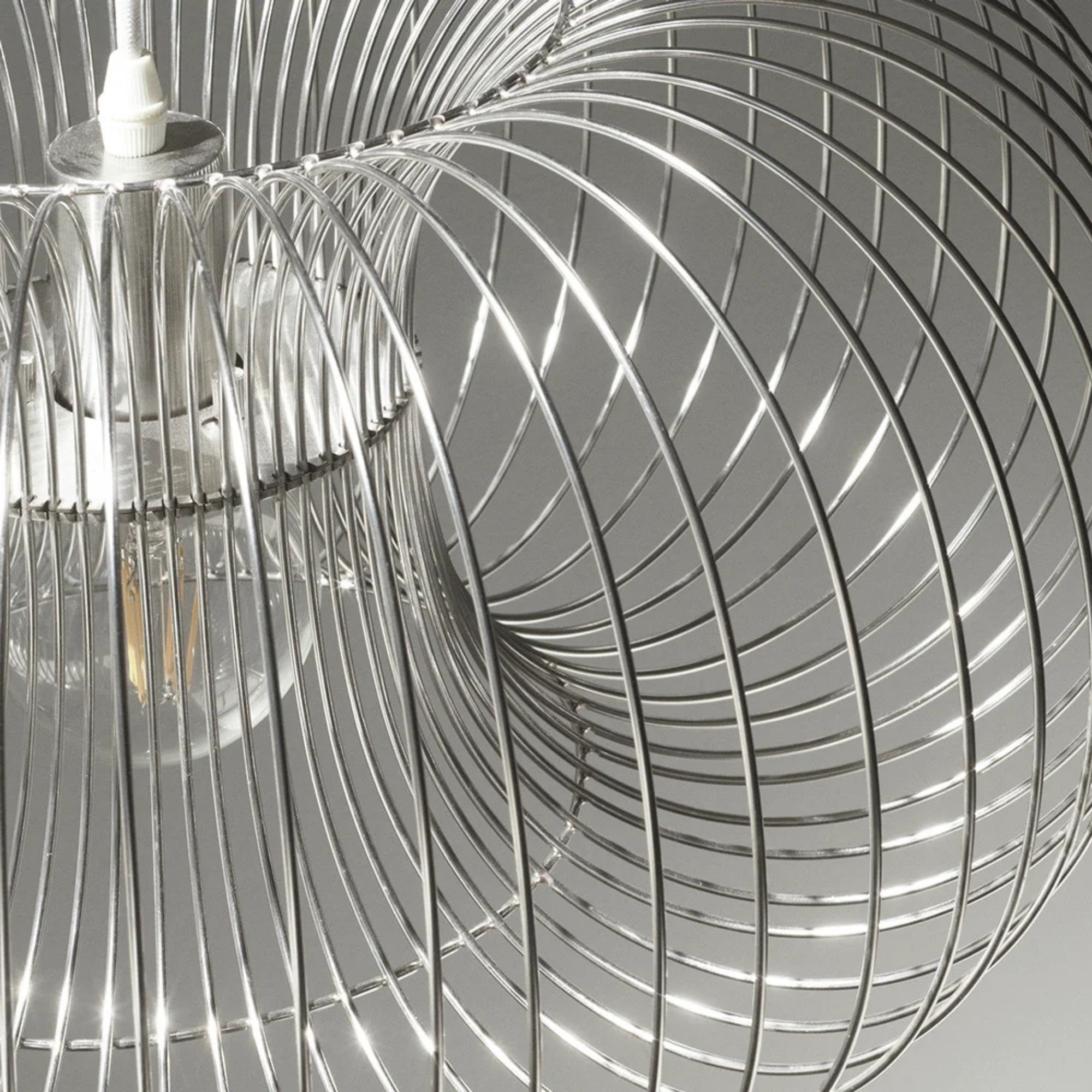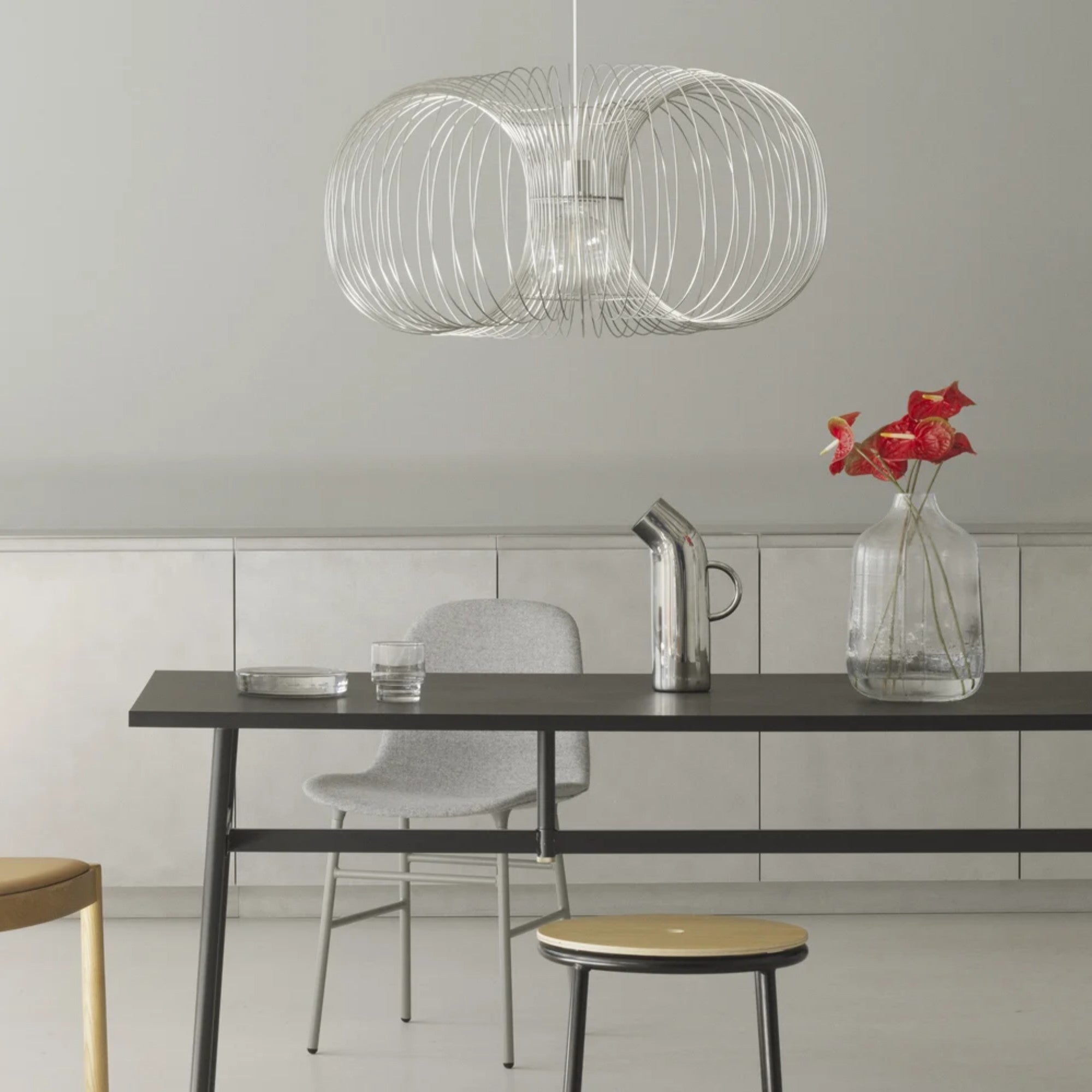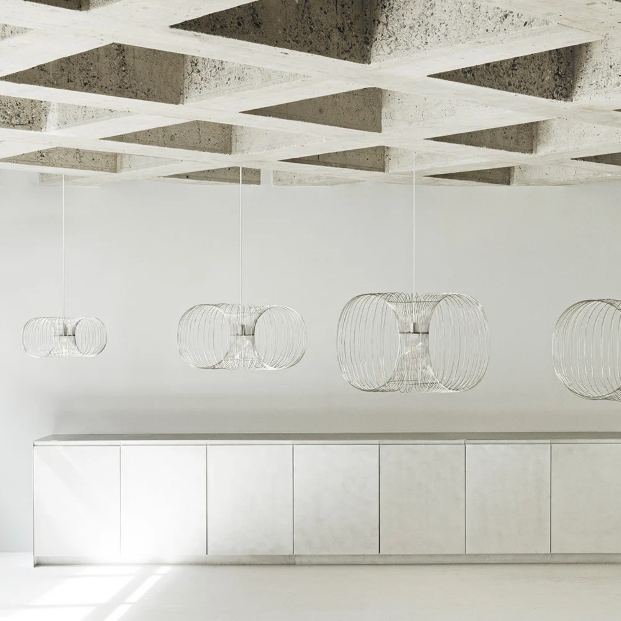 The Coil Pendant Lamp features a sleek, rounded rectangular form crafted from curved stainless-steel wires. Its minimalist design creates a striking focal point, available in four versatile sizes to suit both intimate interiors and expansive spaces with refined, sculptural elegance.