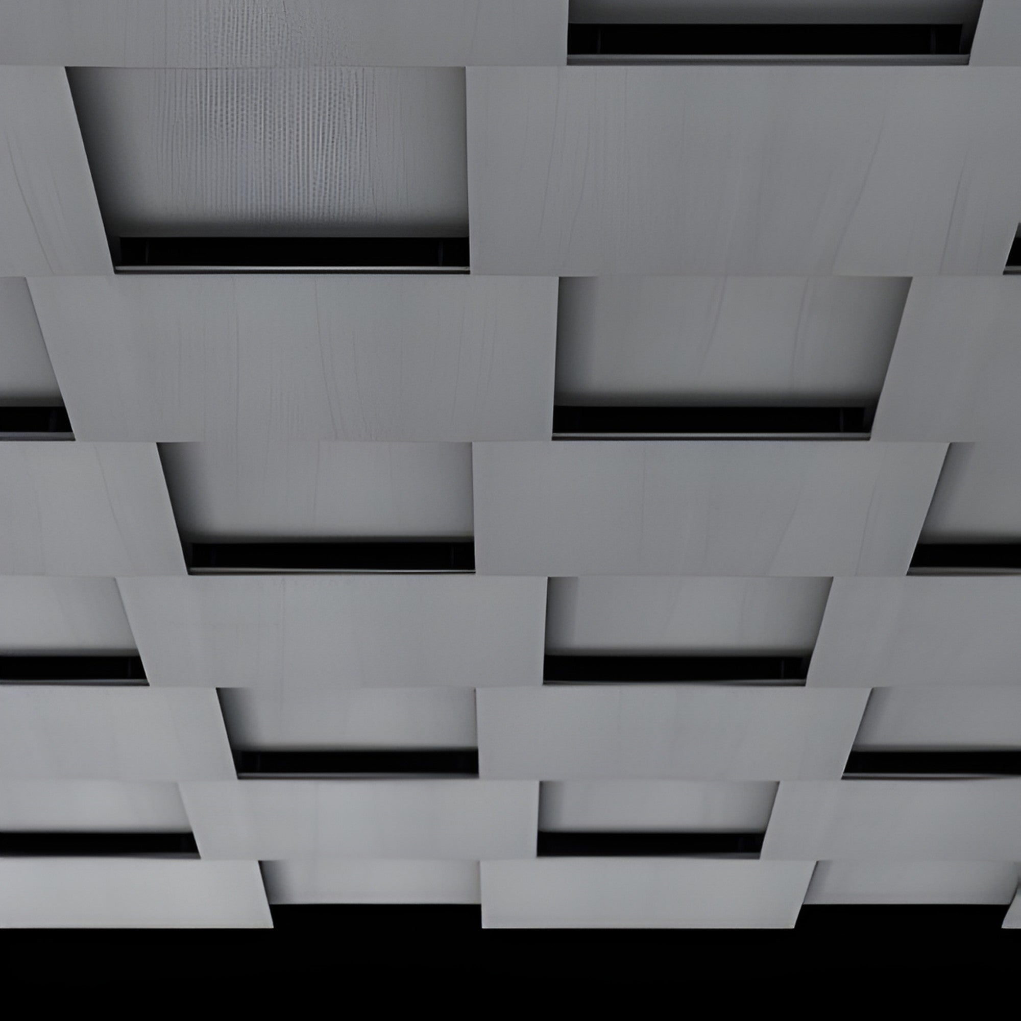 The Tectonique 5.5 suspended‑ceiling system by Ober‑Surfaces (Studio 5•5) features wood, metal or coloured‑paper tiles in modules up to 2400 × 6000 mm, 32 mm thick and rated B s2 d0—ideal for warm, layered overhead surfaces in premium commercial interiors.