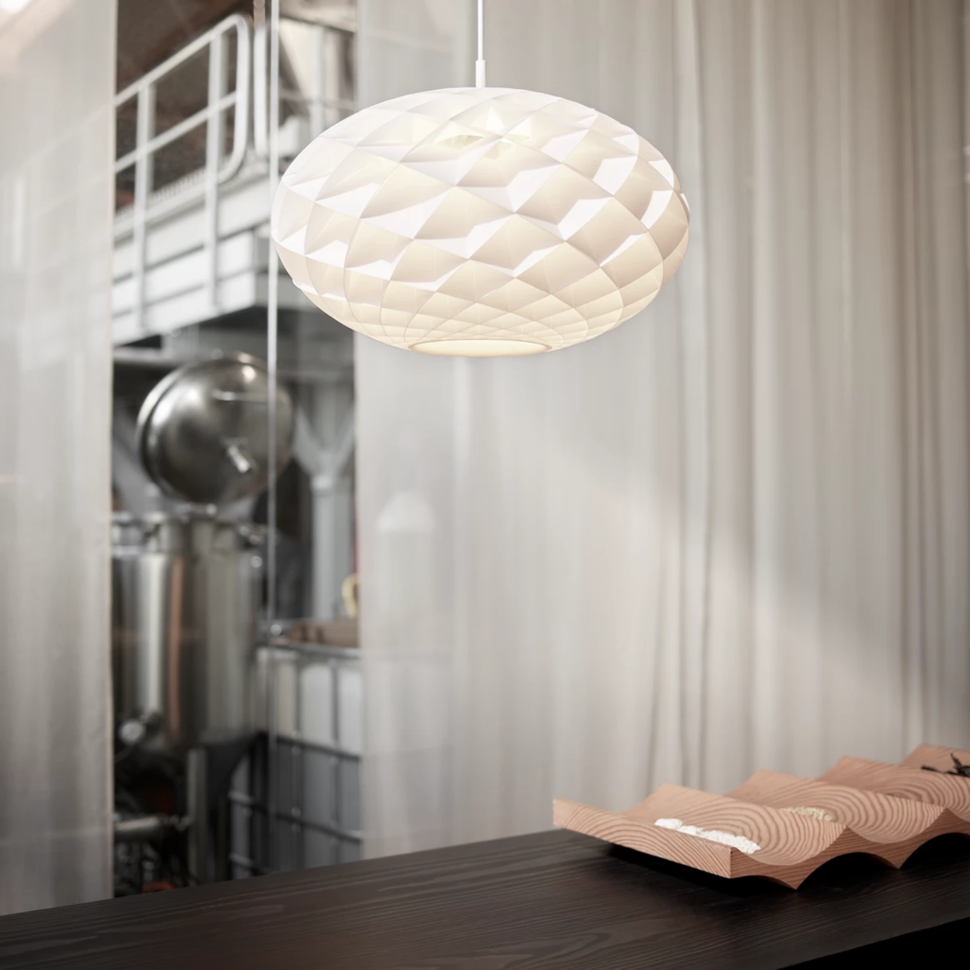 The Patera Oval Pendant by Øivind Slaatto for Louis Poulsen (2015) reinterprets the classic chandelier with a hand-braided, ellipsoid-inspired design. Its flat, minimalist form provides glare-free, 360° illumination, ideal for low ceilings, dining areas, or high-hanging installations, combining mathematical precision with timeless, contemporary elegance.