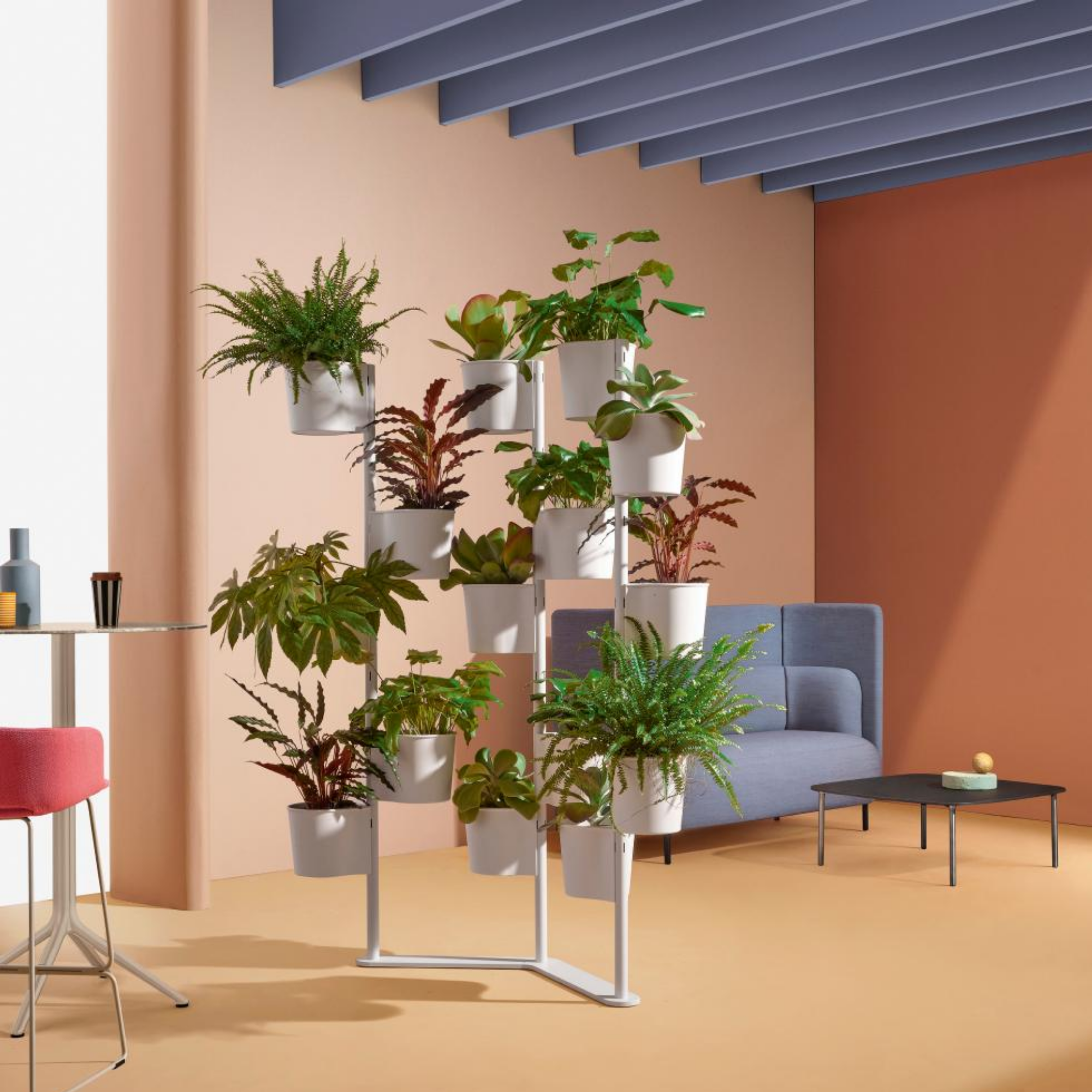The Hevea Partition is a versatile green wall system for offices and hospitality spaces. Featuring a steel frame with fifteen polypropylene pots, it allows customizable layouts, easy attachment, and simple cleaning. Sustainable and modular, additional pots can be added for enhanced greenery and design flexibility.