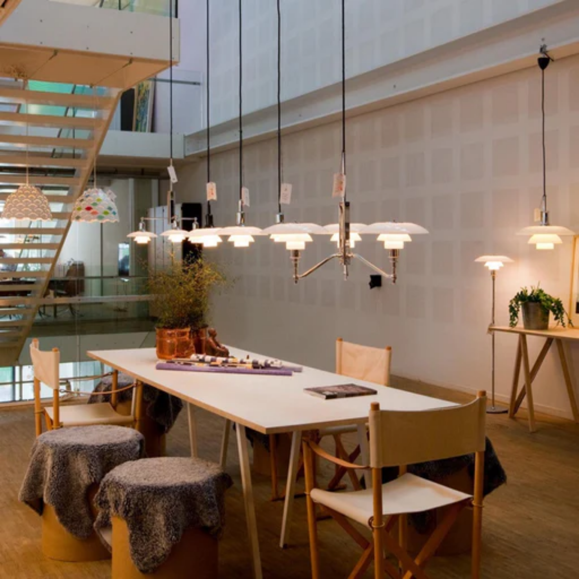 Poul Henningsen’s PH 3/2 Academy Pendant, part of the iconic three-shade system, delivers glare-free, evenly distributed light using the logarithmic spiral design. Launched in 2000, its hybrid shade configuration allows lower mounting heights, combining scientific precision with timeless Danish elegance for versatile, harmonious illumination.