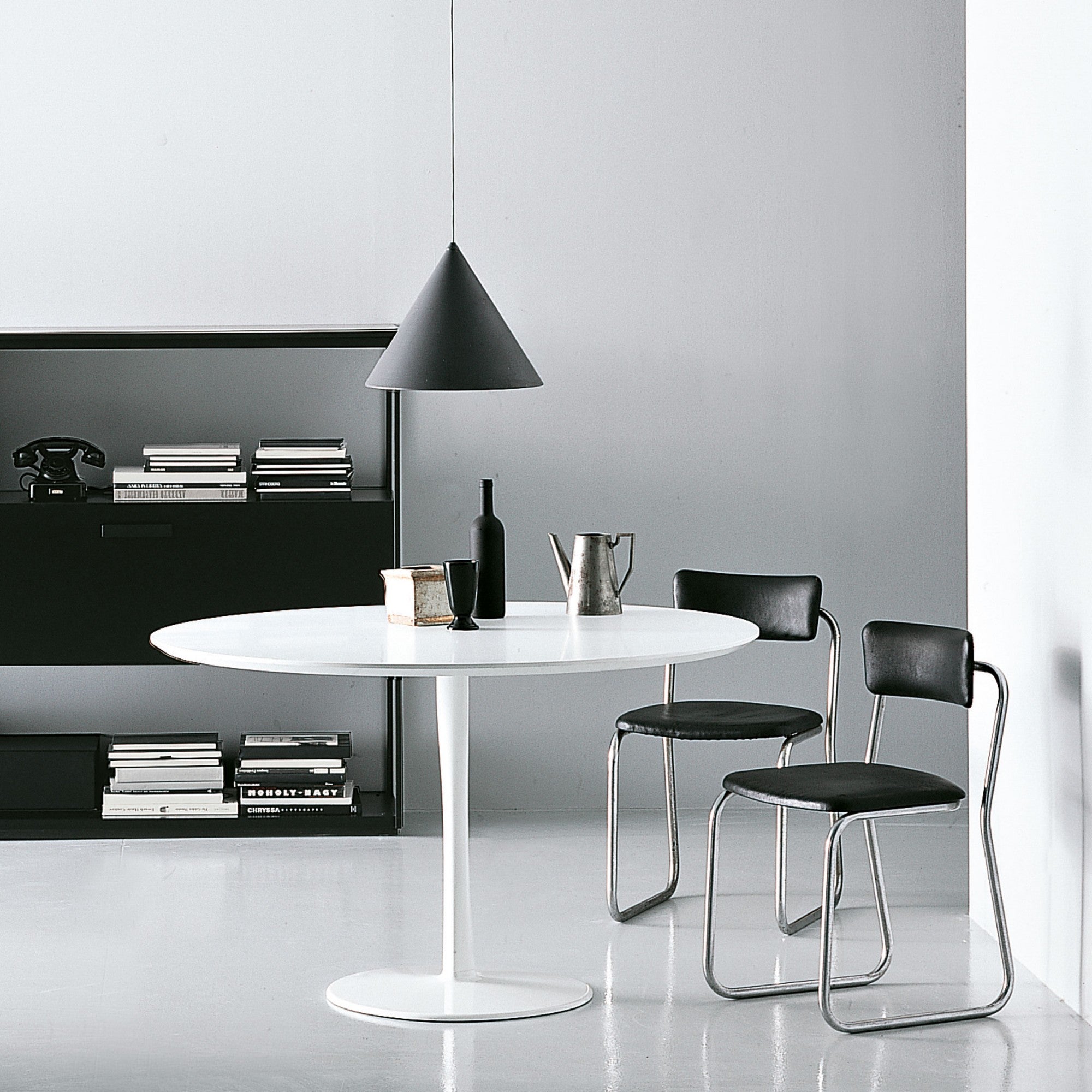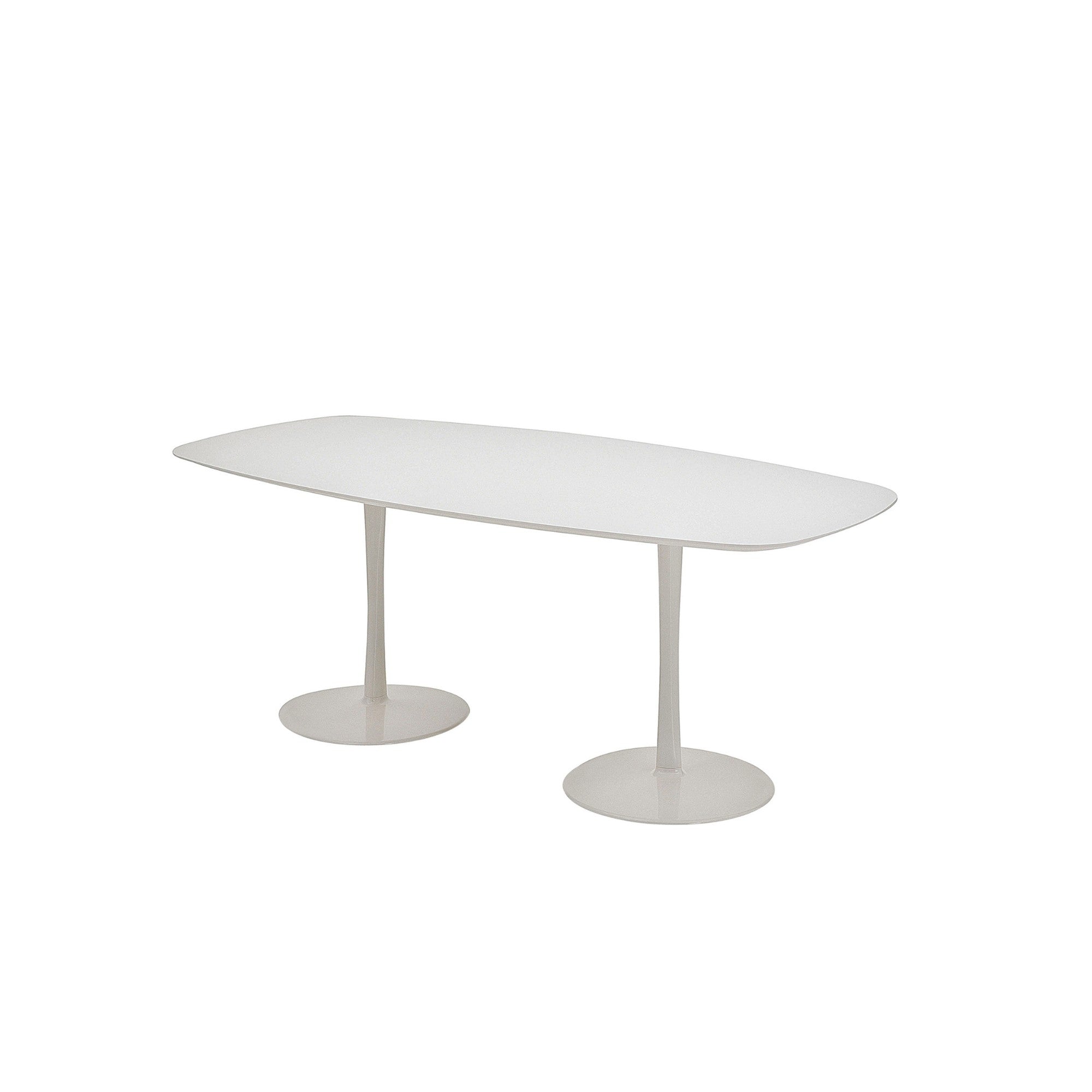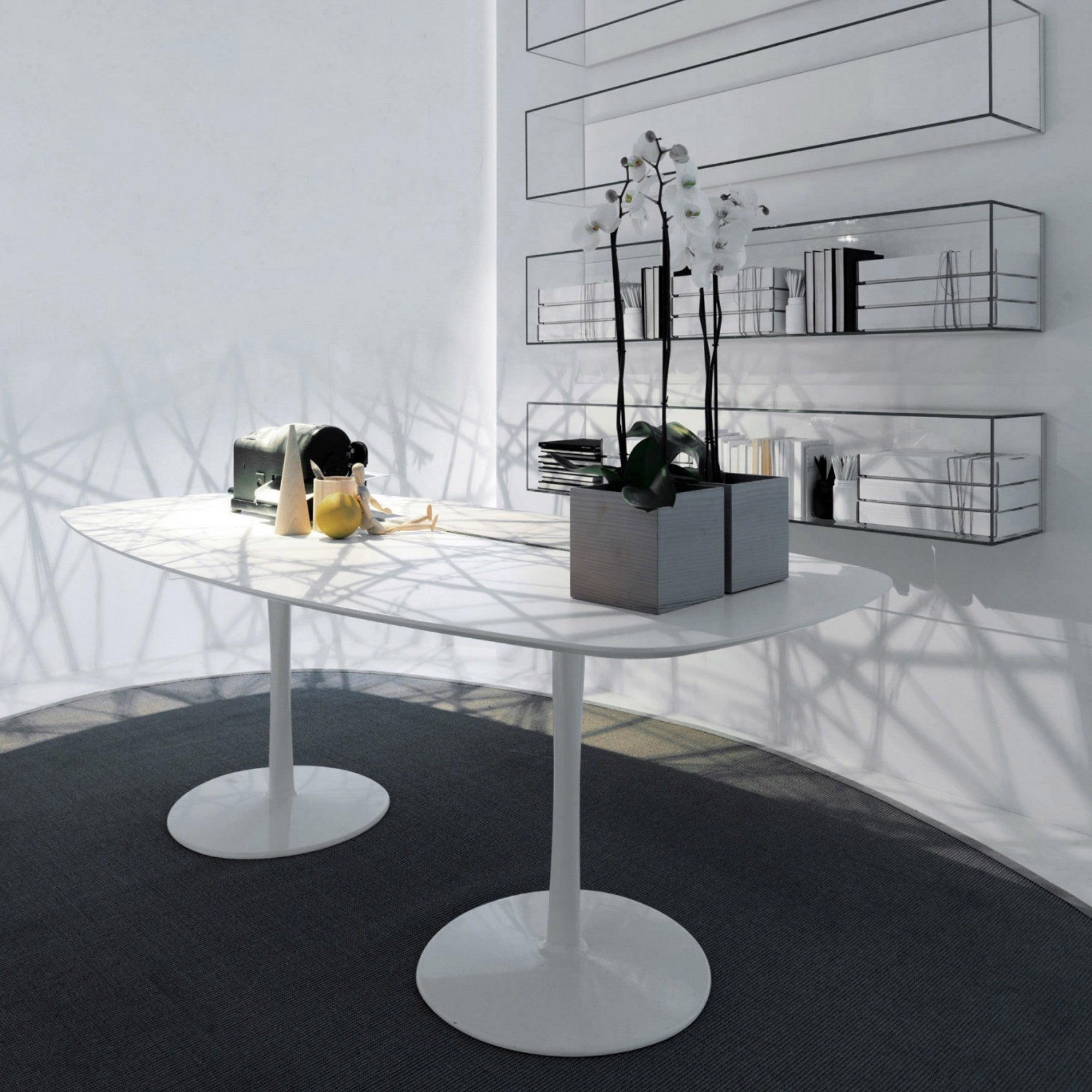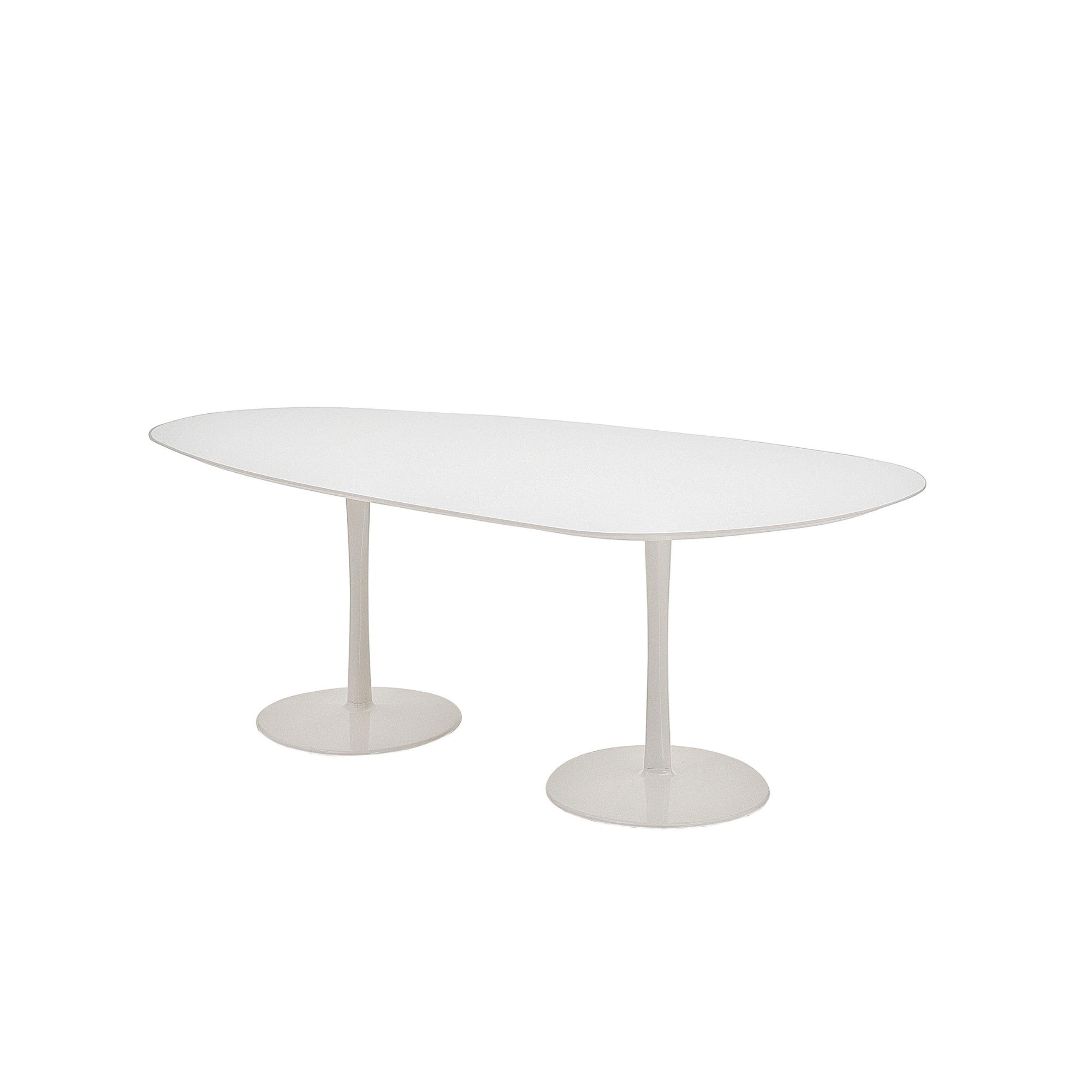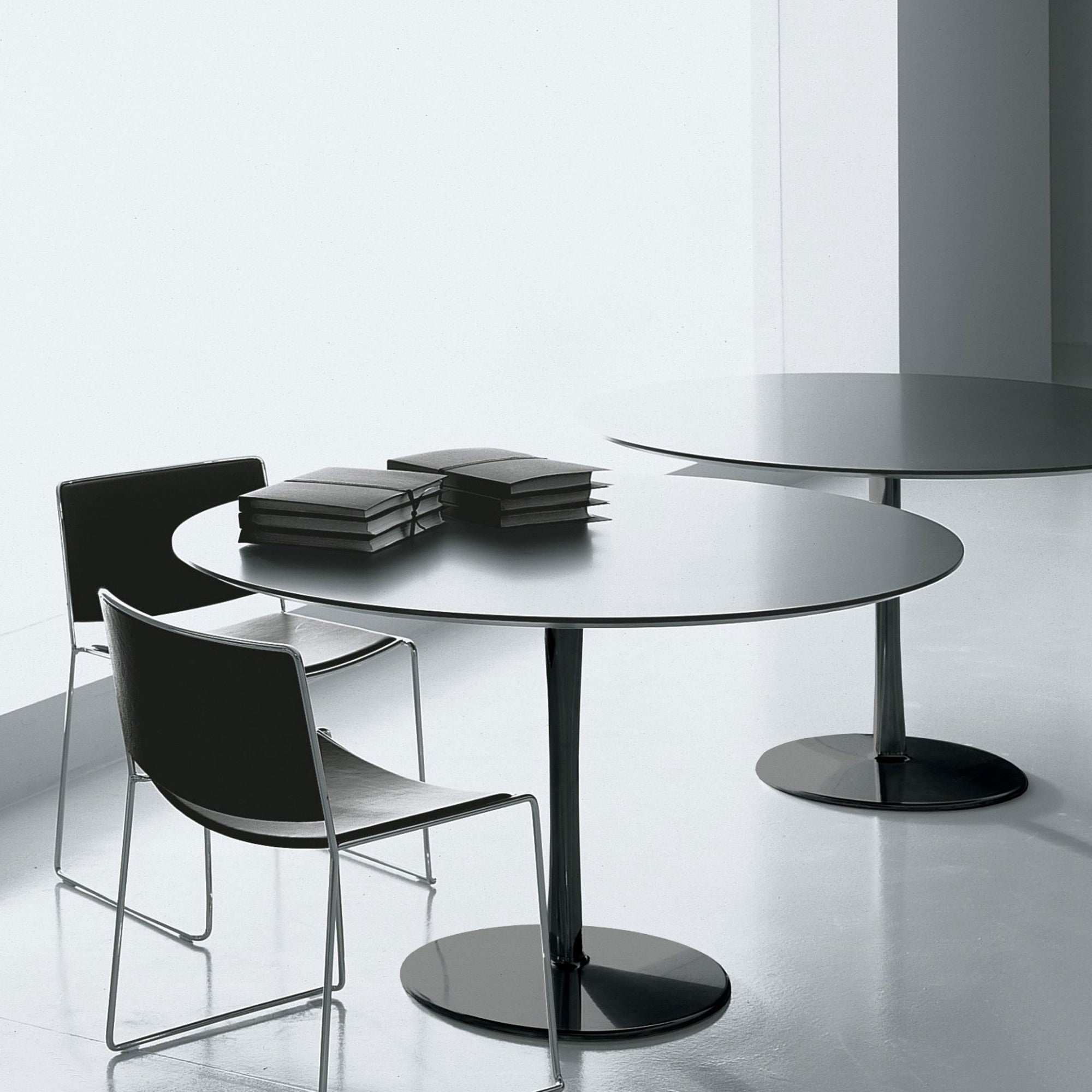 Join by Decoma Design is a versatile table with circular, oval, square, or irregular tops, supported by a sculptural drop-shaped leg. Available in multiple sizes and lacquer finishes—matte or glossy in a full colour range, with high-resistance white or black—the table suits both private and public spaces with elegant geometric presence.