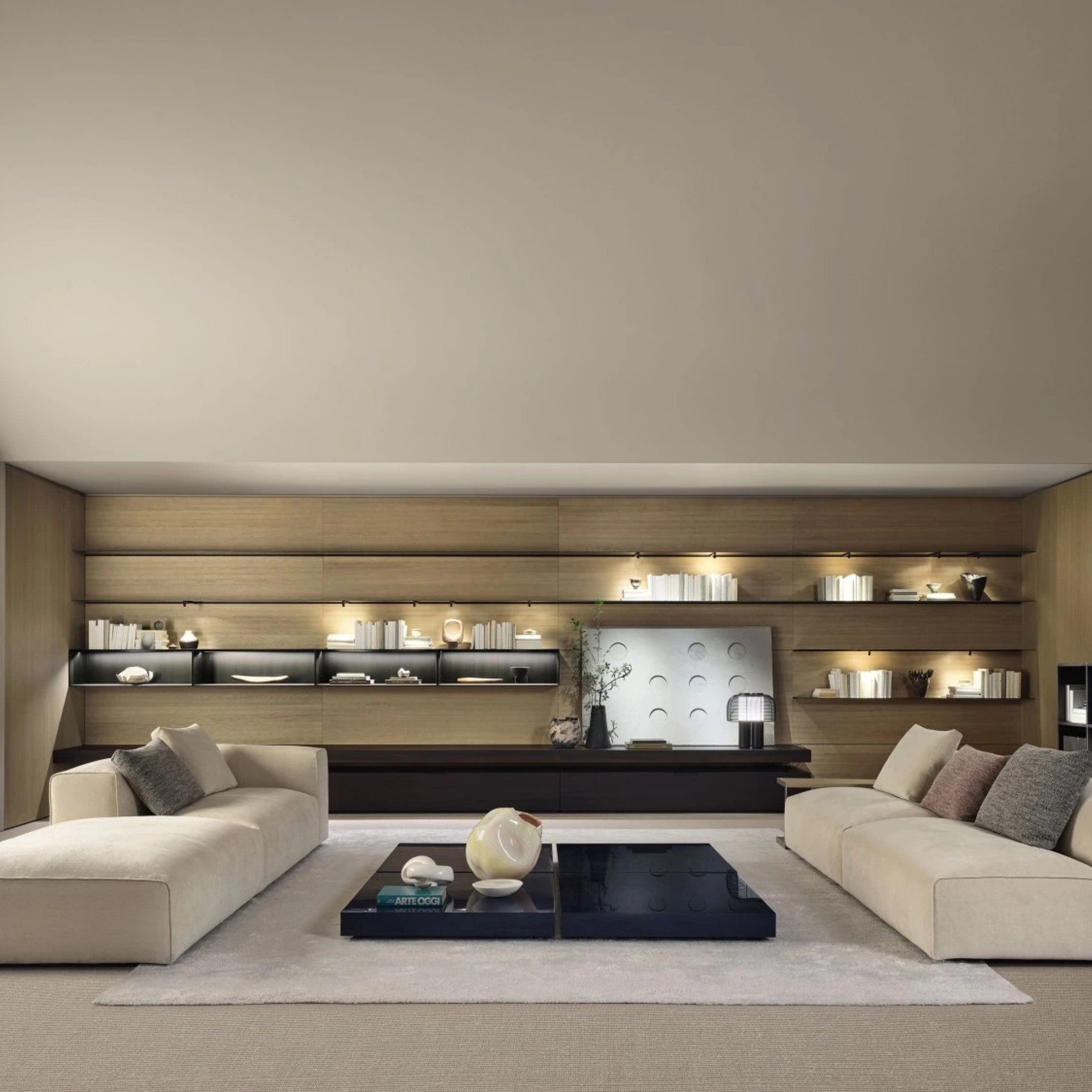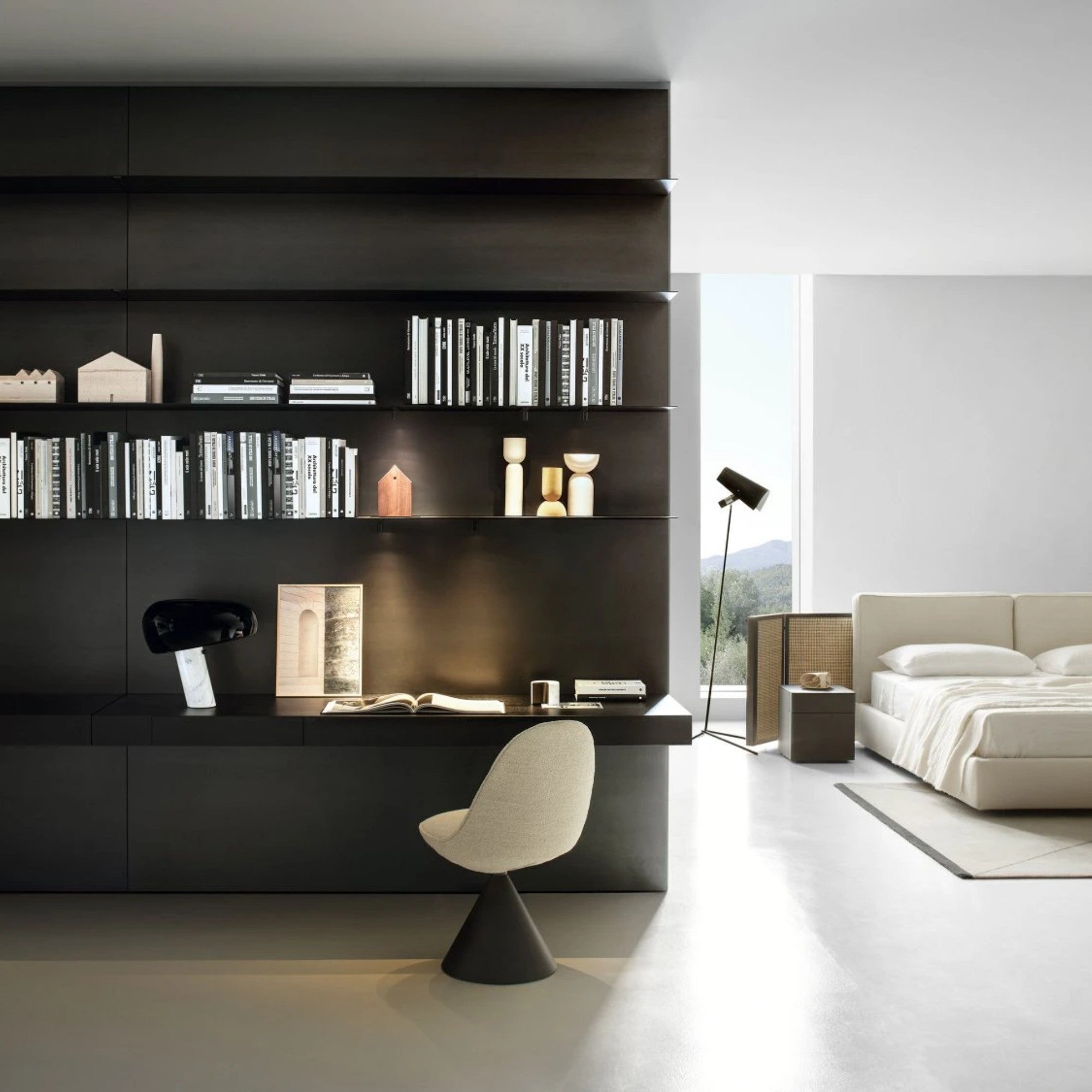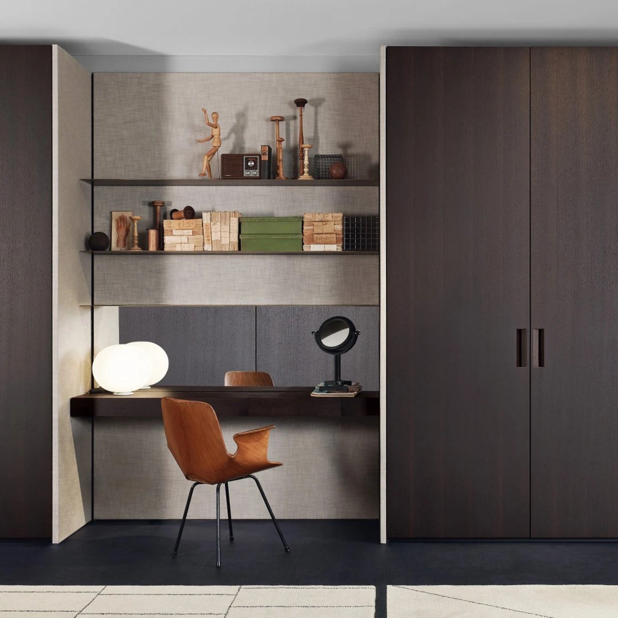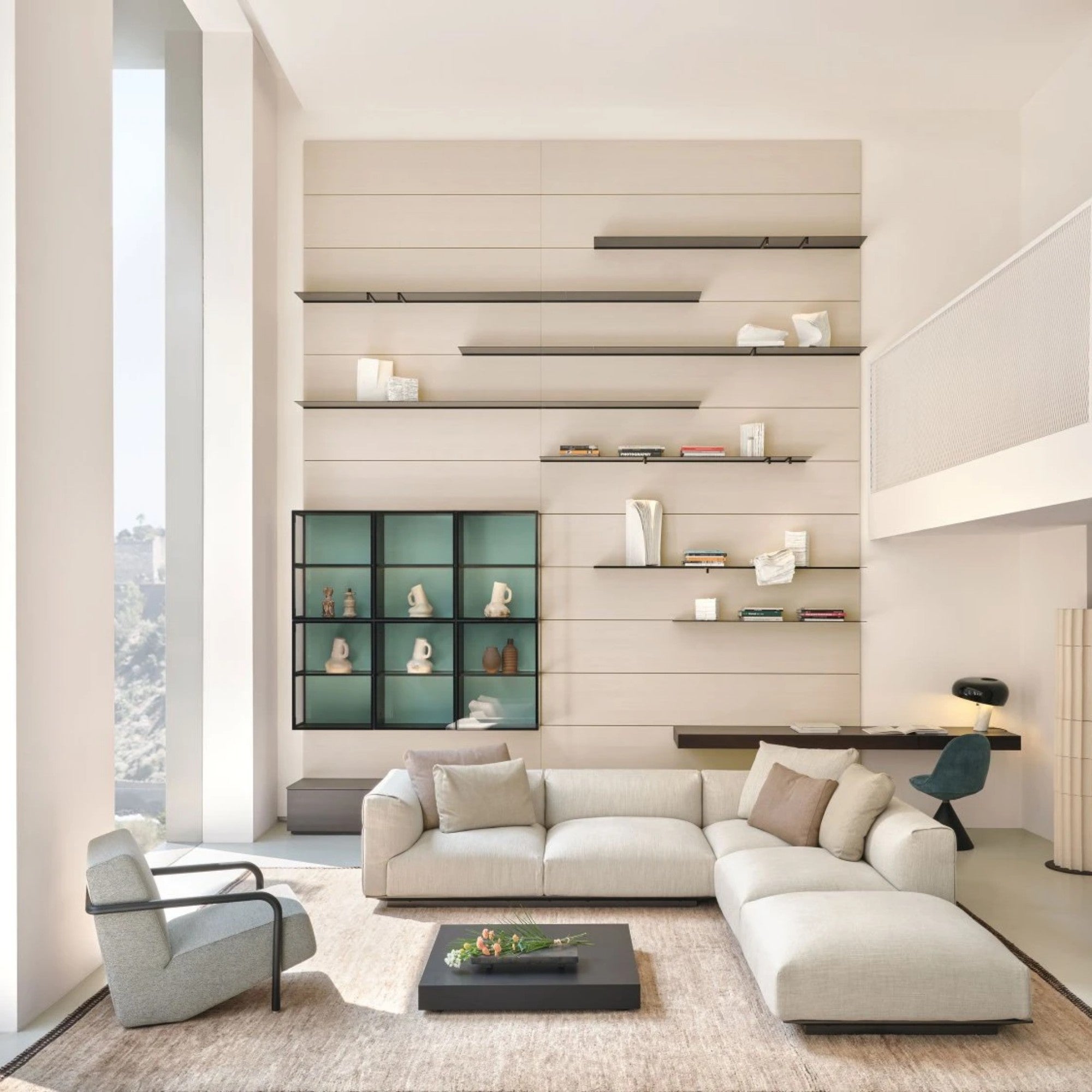 Load-it is a versatile shelving system featuring slim L-shaped steel shelves and customisable wall panels in lacquer, wood, metal, mirror, or fabric finishes. Available in multiple sizes and colours, it integrates seamlessly with the Modern system, offering endless modular compositions for stylish, functional storage.