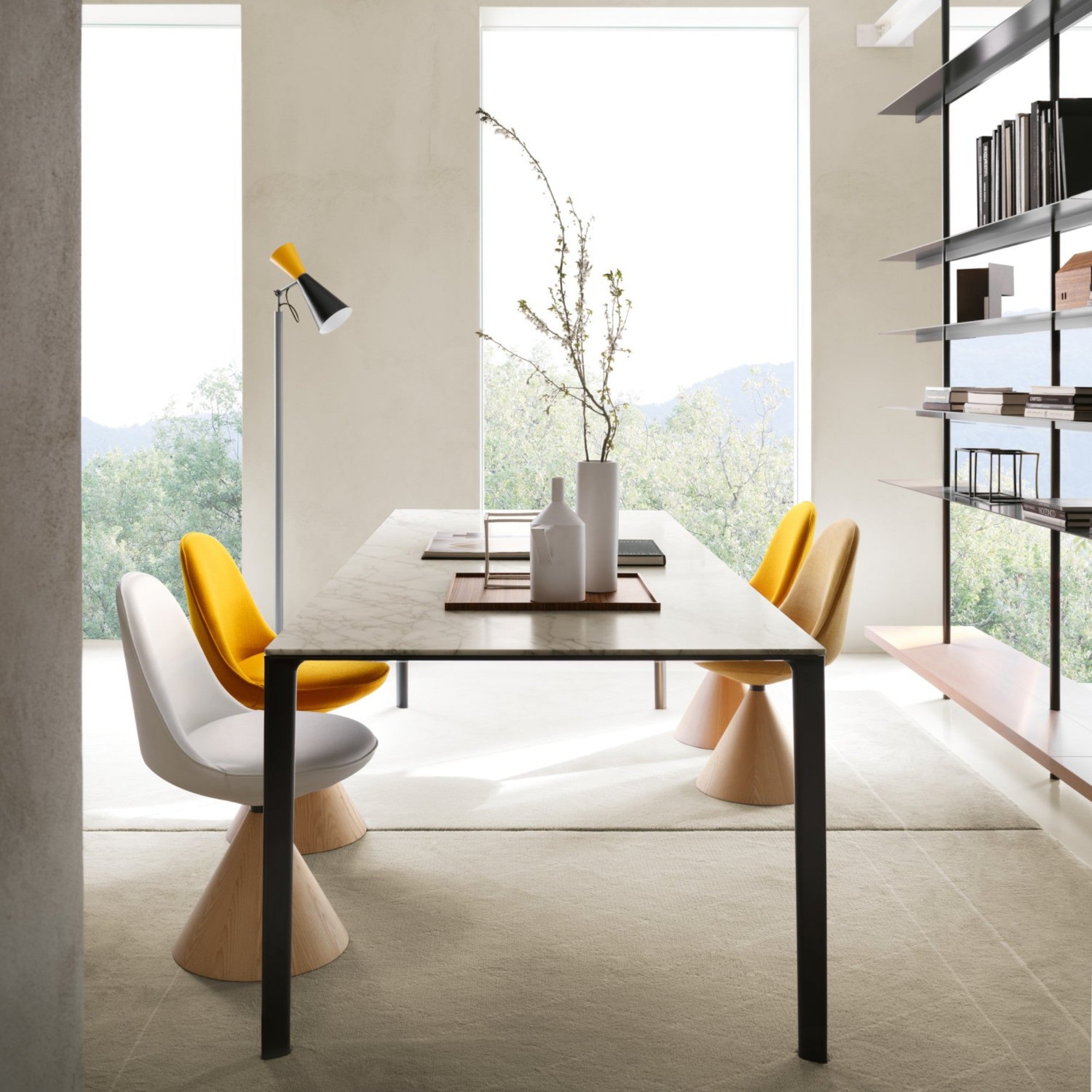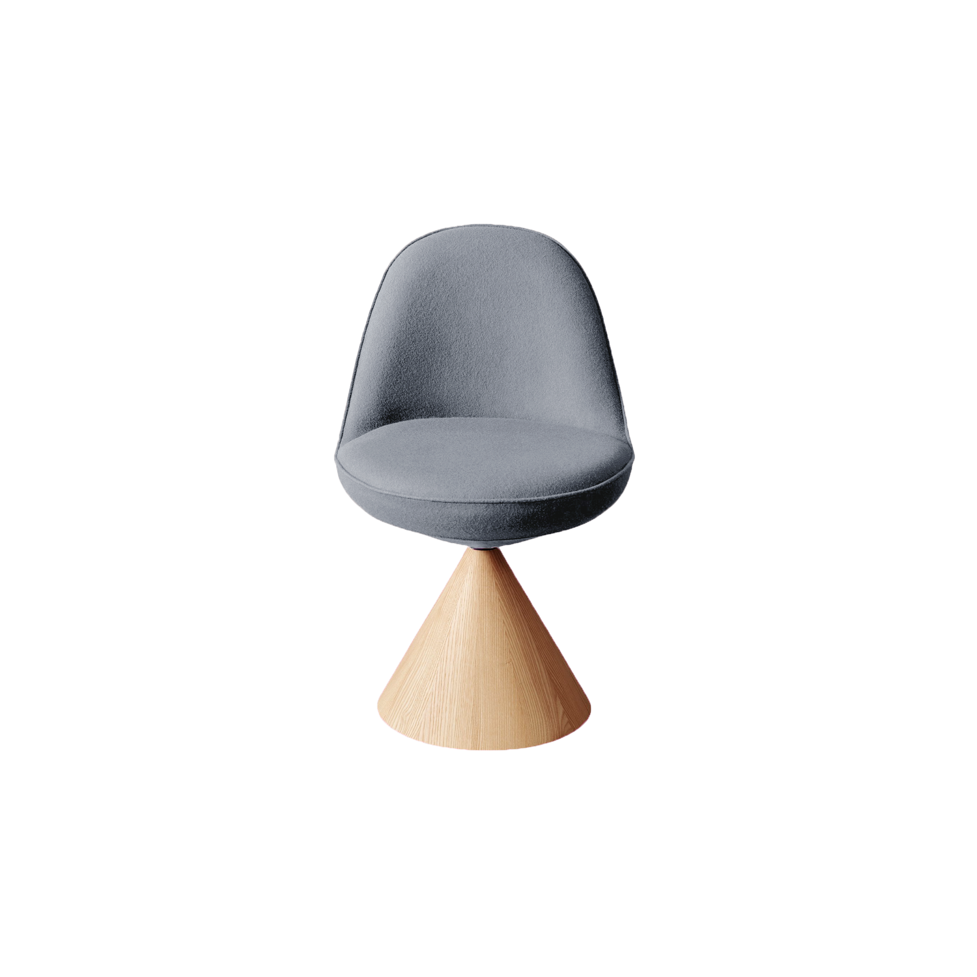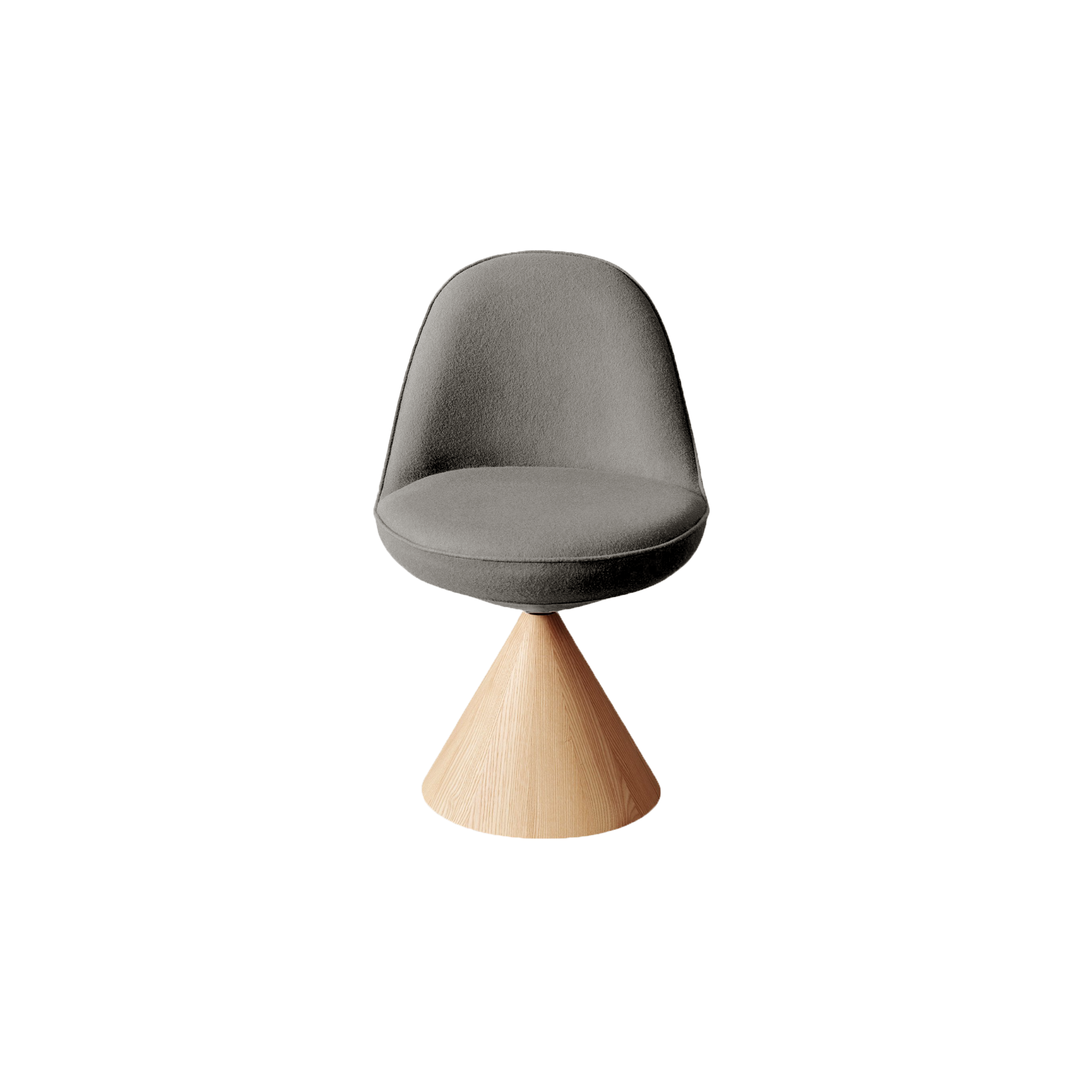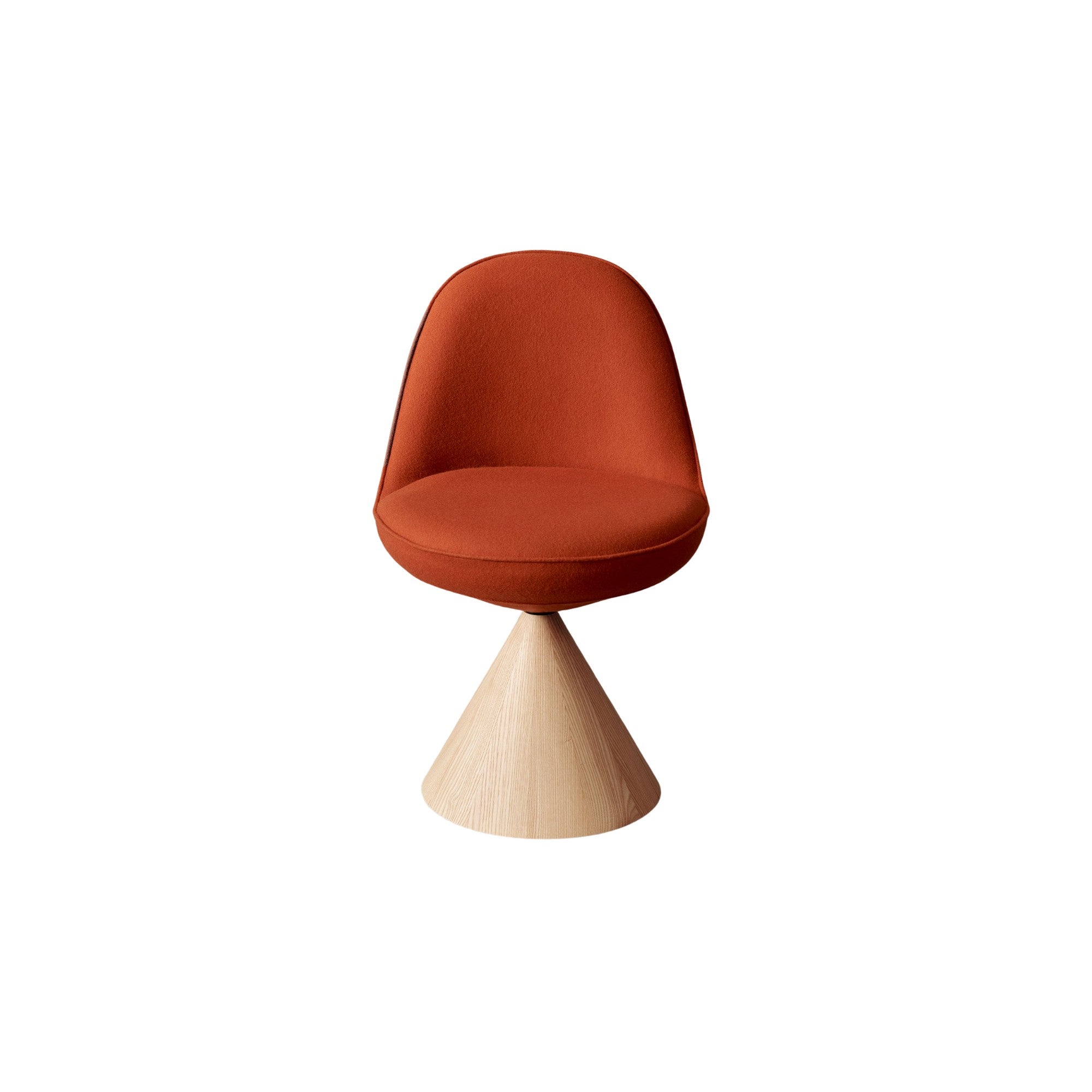 The Romby Chair combines geometric elegance with retro charm, featuring a cocoon-like swivel seat on a truncated conical base of natural or black-stained ash. Its moulded, upholstered shell offers comfort and lightness, while the Romby Armchair adapts the design with expanded armrests and four wooden legs, perfect for home or contract spaces.