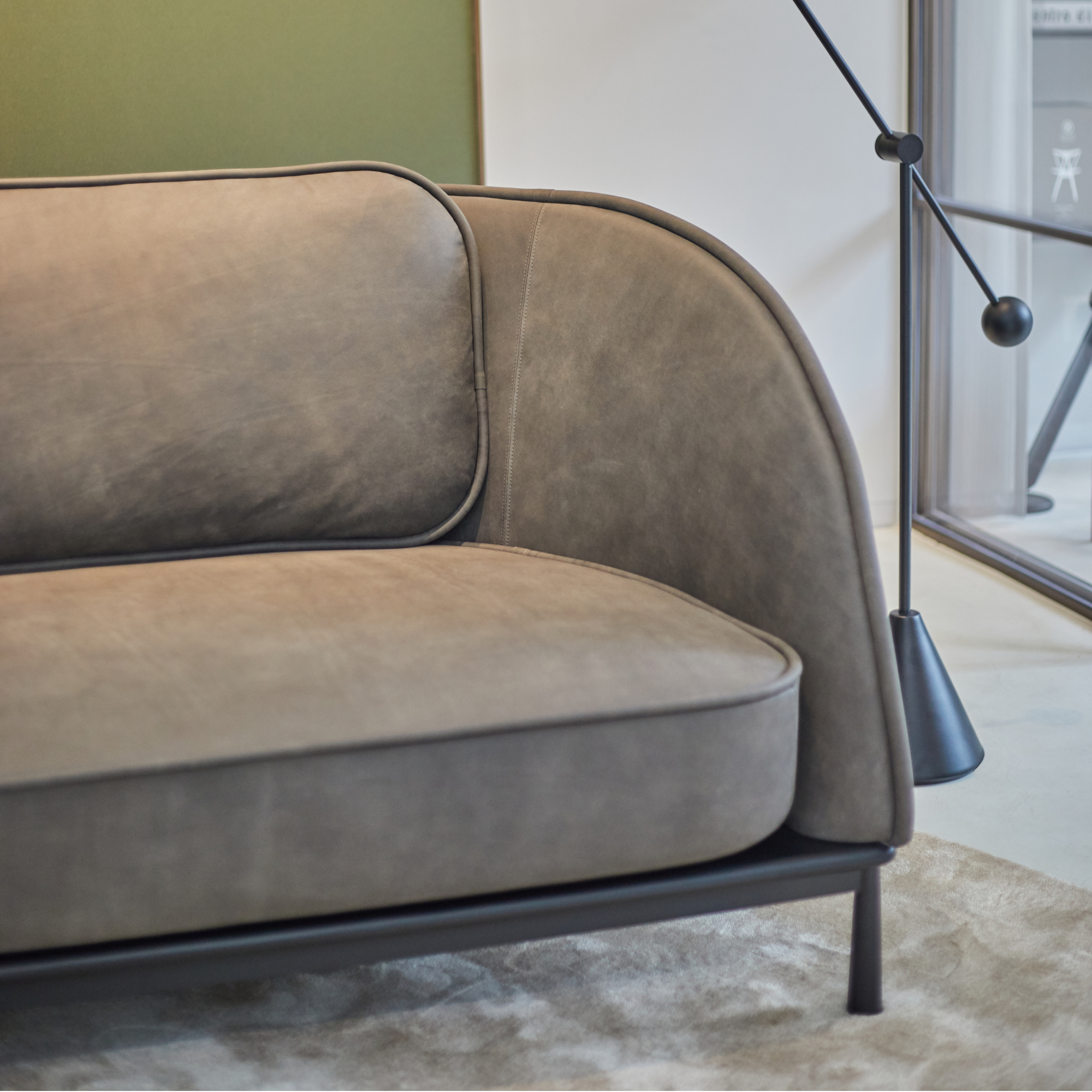 The Arc Sofa Love Seat by Hallgeir Homstvedt features a wood‑veneer base, black steel legs, and a soft, sculptural curved form with a thick seam that contrasts its structured exterior and inviting interior—perfect for home-like coziness in modern workspaces.