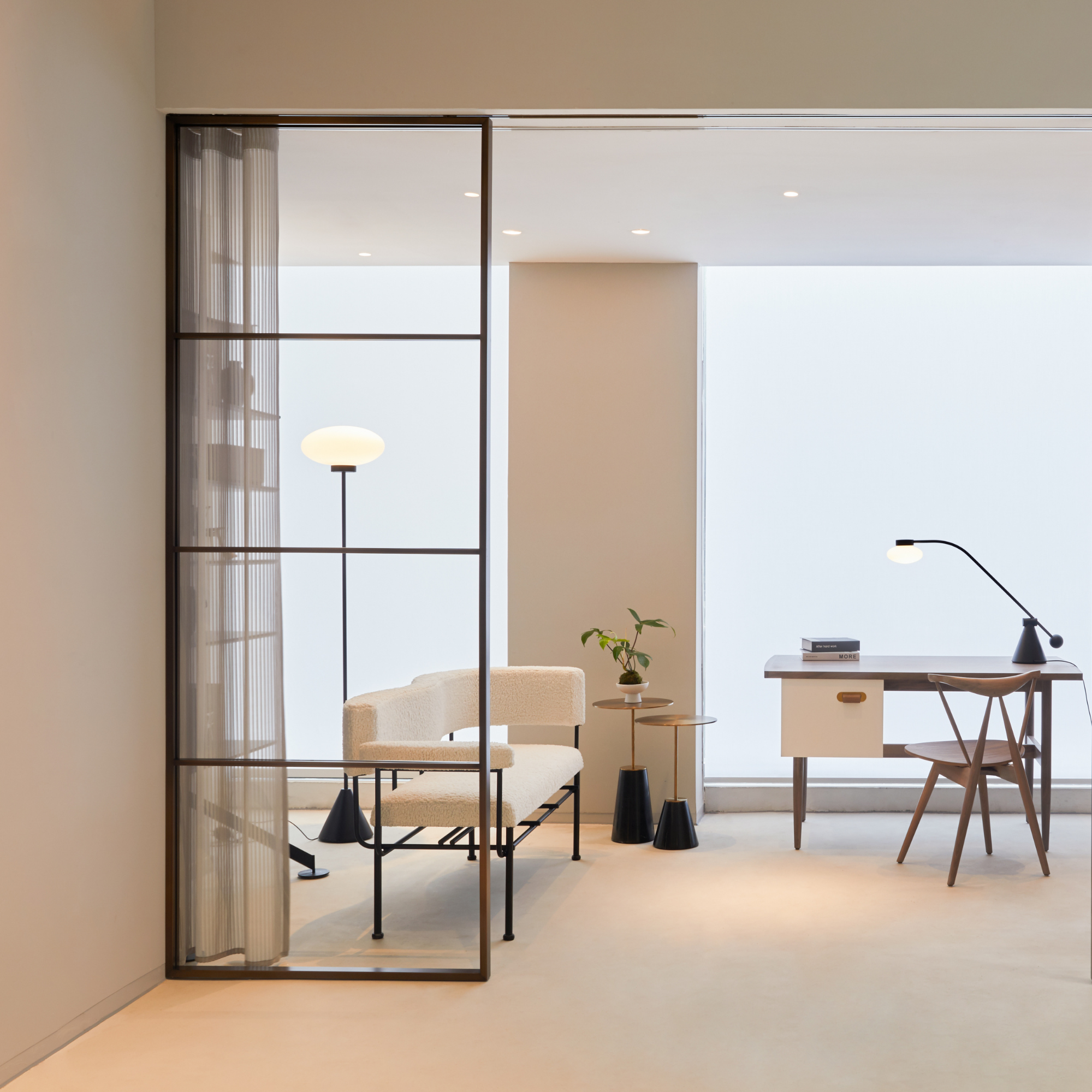 The Stellar Works Bund Side Table H560 (design by Neri & Hu) features a hairline aged-gold stainless steel top and marble base, inspired by Shanghai’s Bund and Art Deco elegance.