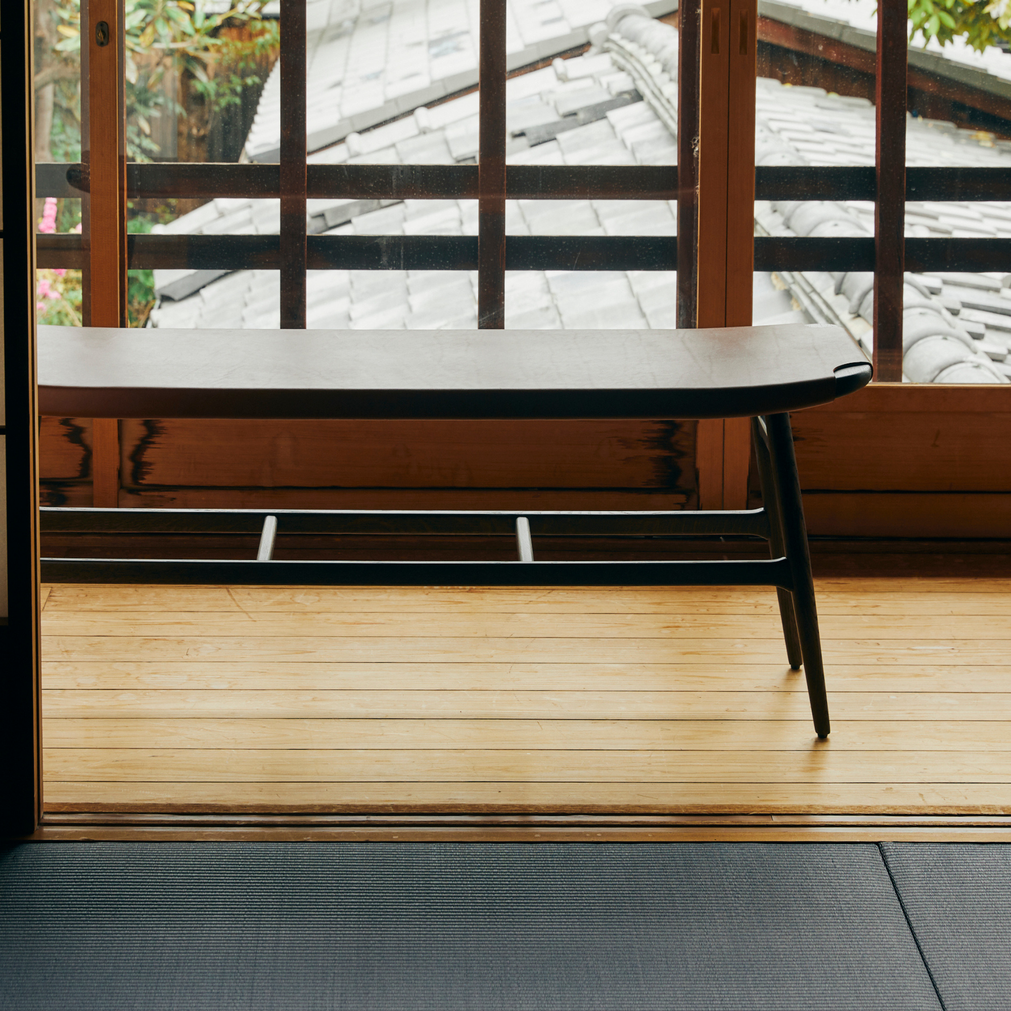 The Freja Bench (Leather Seat) by Space Copenhagen for Stellar Works features a sculptural solid wood frame and a saddle leather seat, merging Scandinavian minimalism with Japanese-inspired simplicity—characterised by a trellis-like leg structure that makes the seat appear to float.