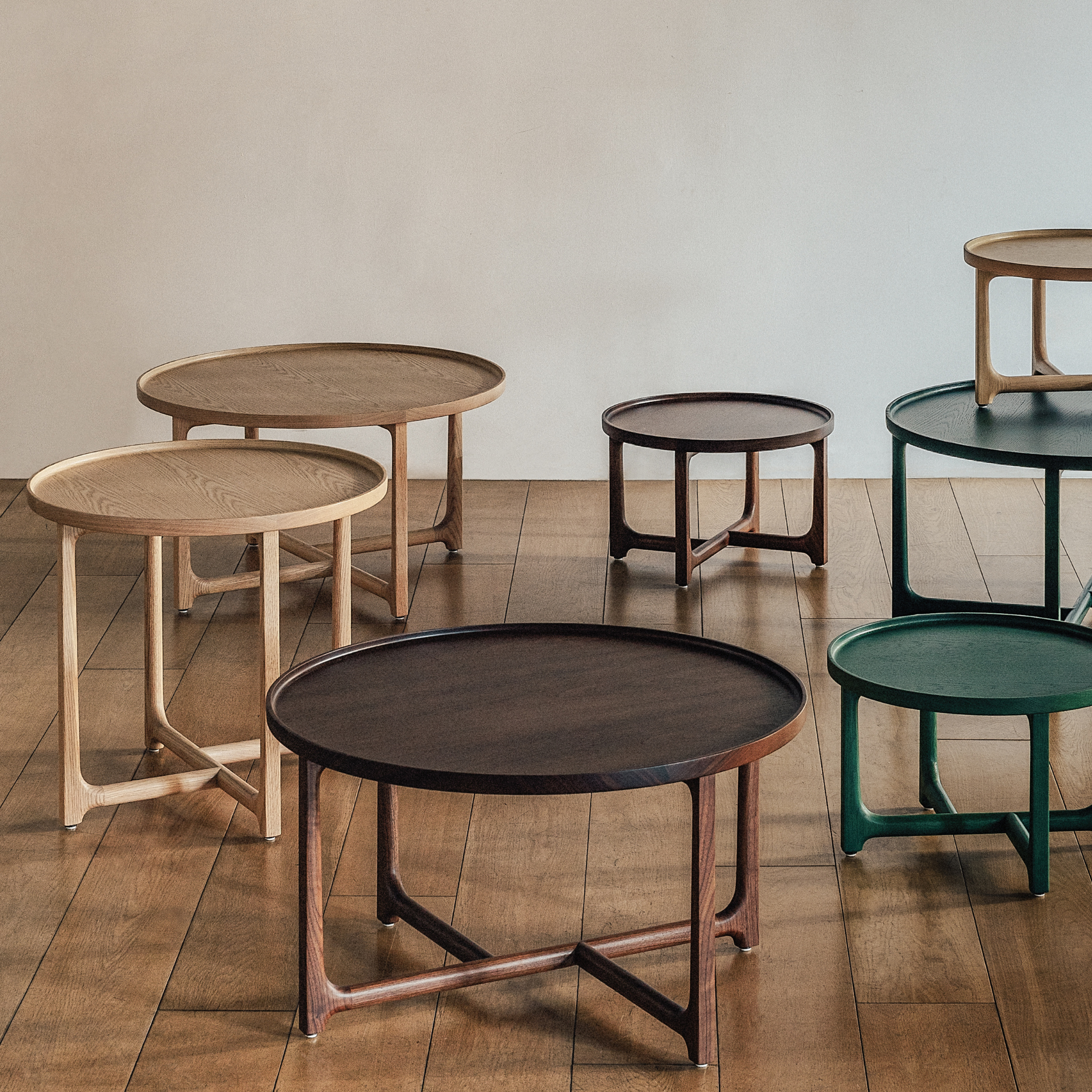 The Lyrical High Side Table by Stellar Works (designed by Neri & Hu) features a round wood‑veneer top and solid wood legs with a gently curved edge and offset supports—showcasing refined craftsmanship and minimalist sophistication.
