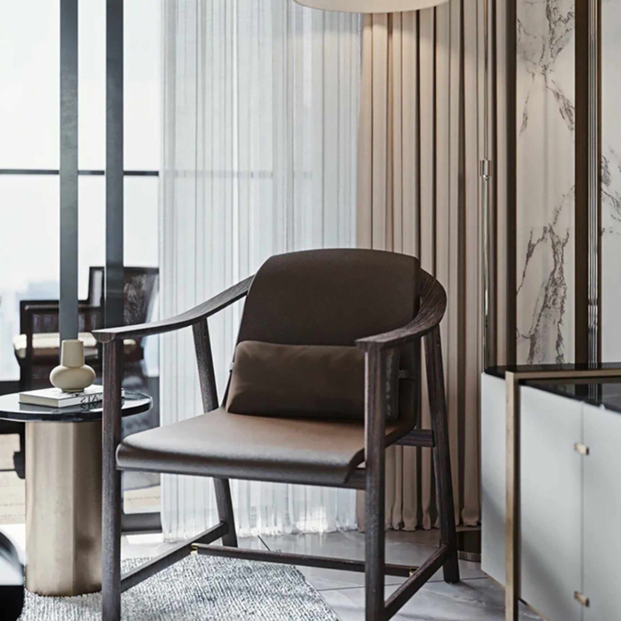 The Mandarin Lounge Chair by Neri & Hu for Stellar Works features a solid-wood frame, stainless-steel gold detailing, and a curved, upholstered seat shell. It elegantly fuses classical Asian temple geometry with mid-century form for refined, sculptural relaxation.