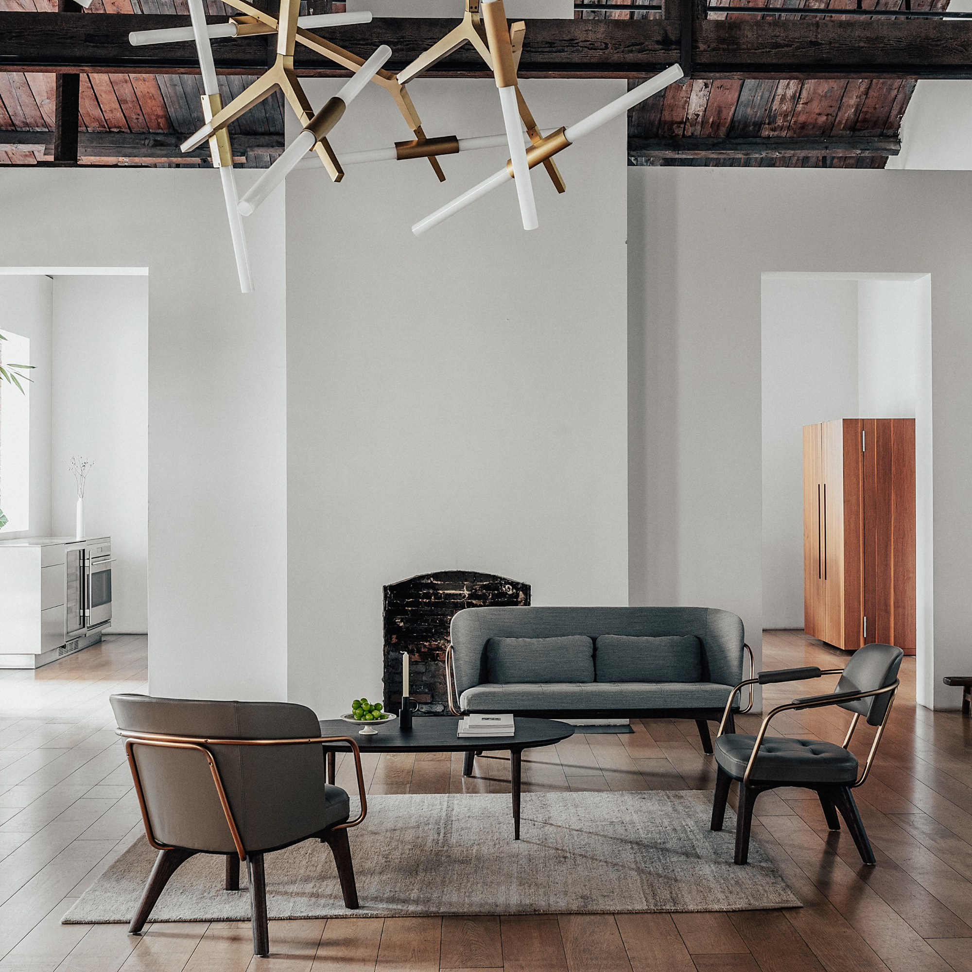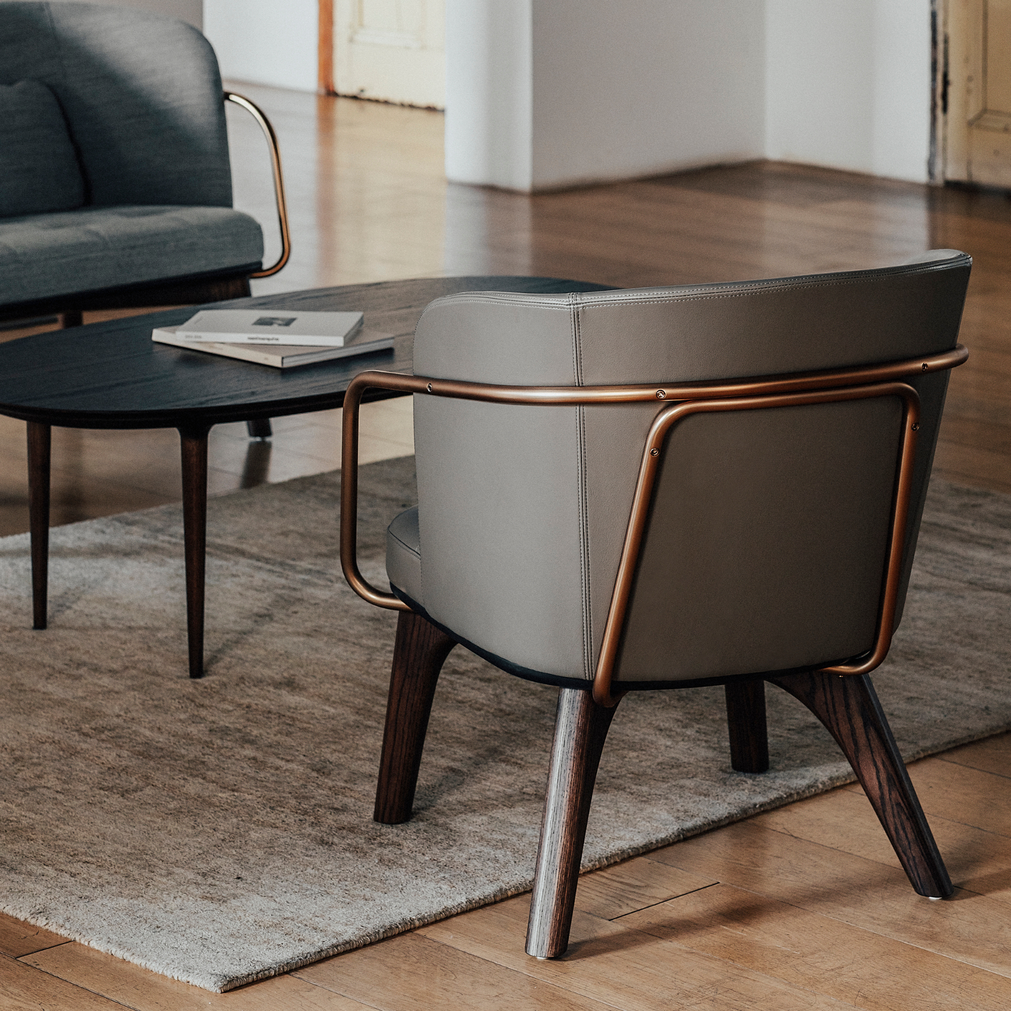 The Stellar Works Utility Lounge Chair (Full Back) by Neri & Hu features solid wood legs, an aged-gold steel frame, and a fully upholstered seat and back. It brings industrial strength, refined comfort, and timeless elegance to hospitality and modern interiors.