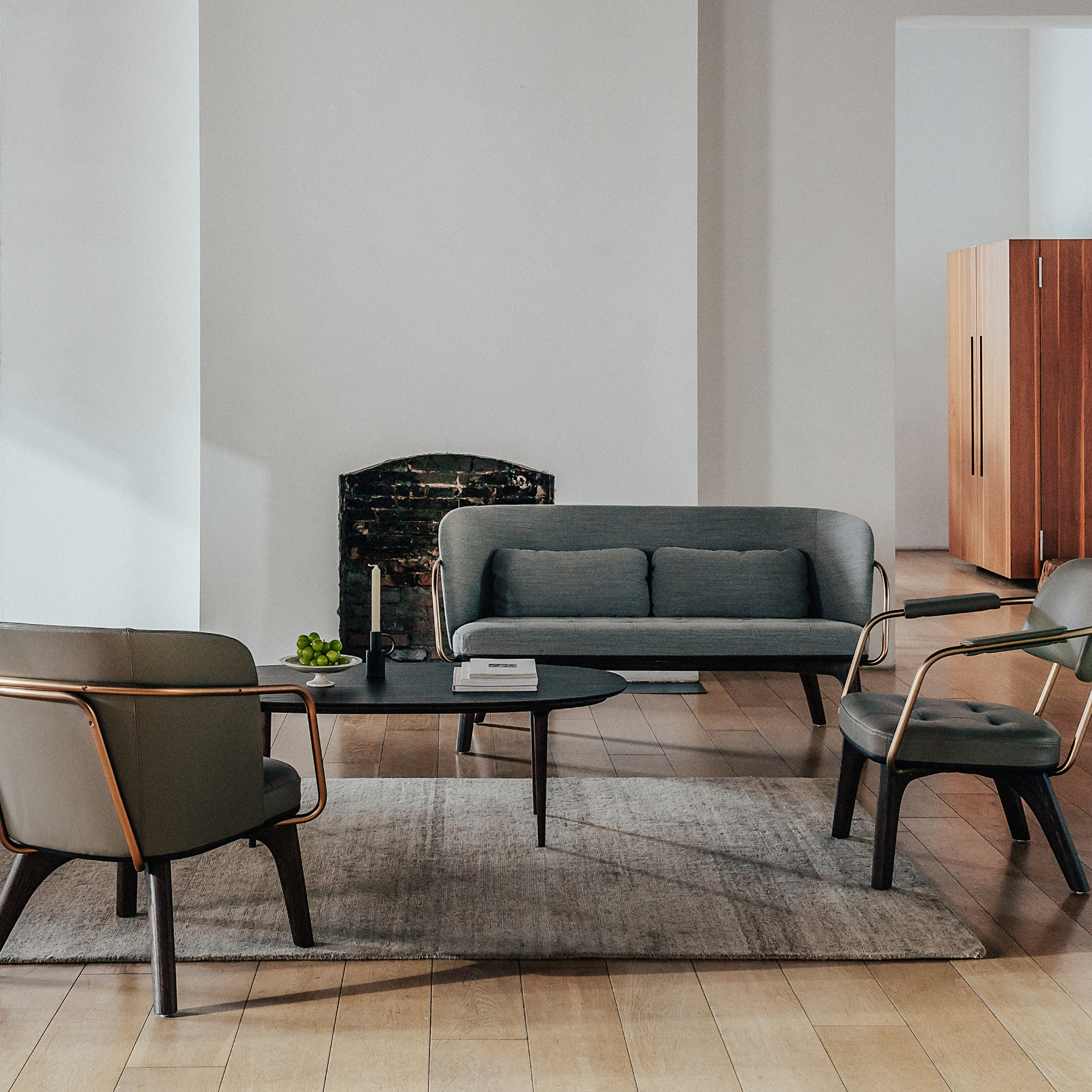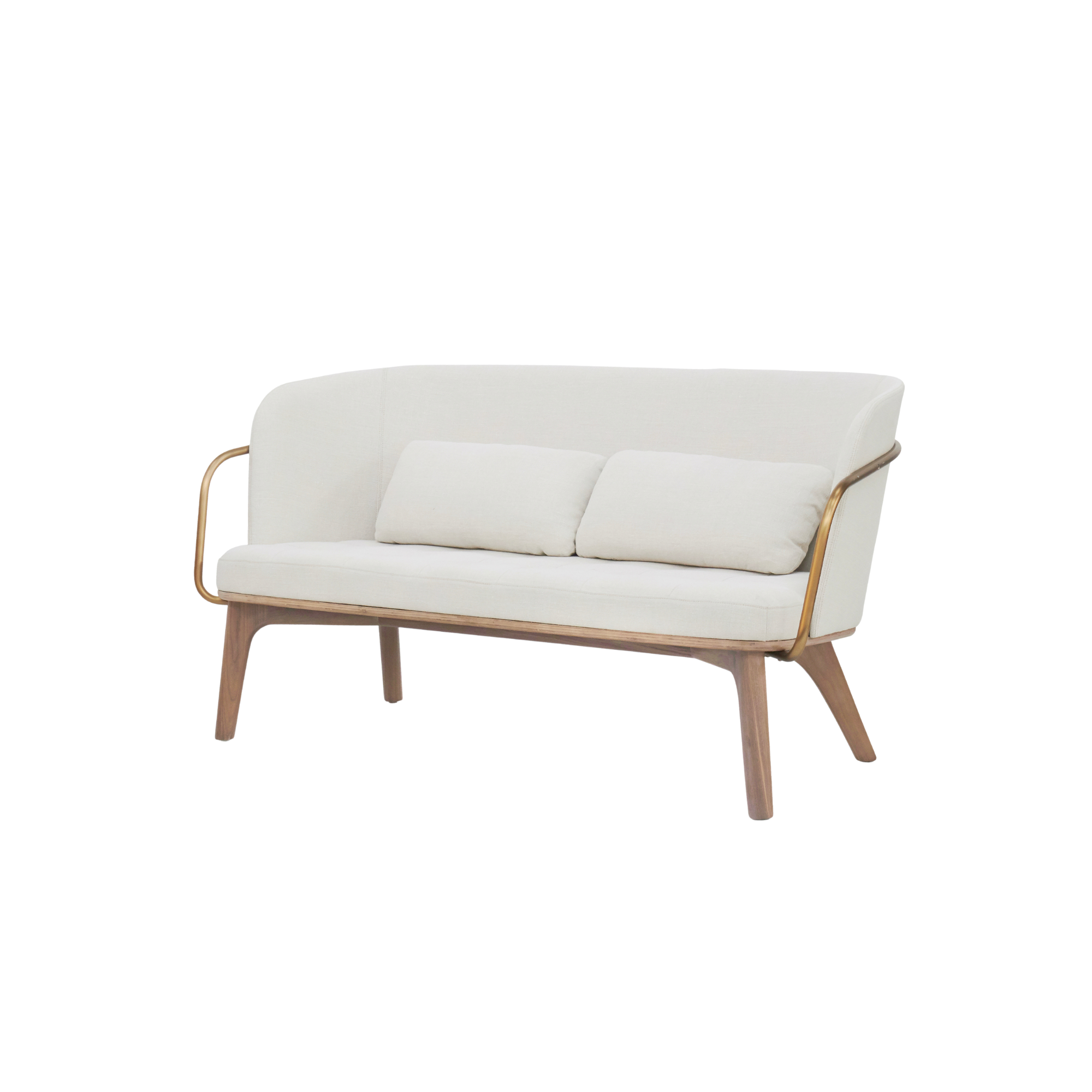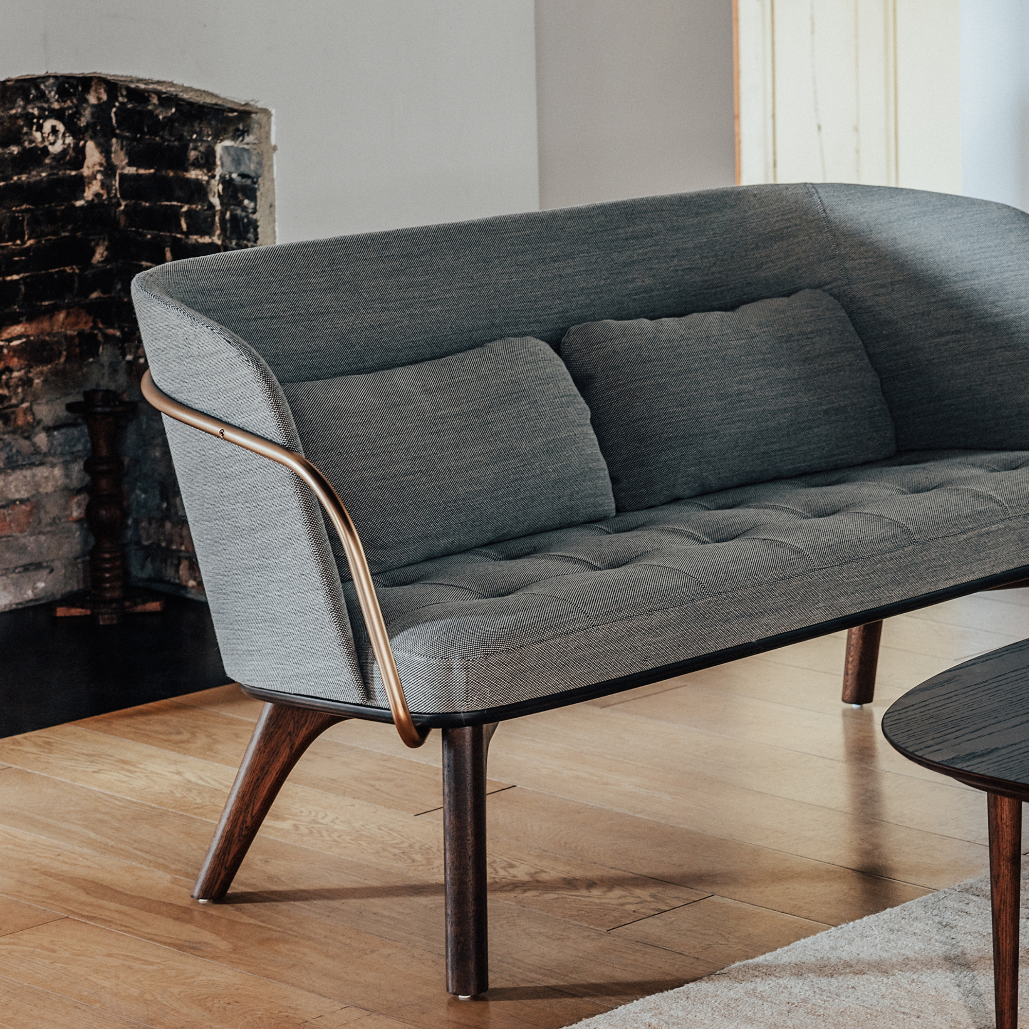 The Stellar Works Utility Lounge Chair Two-Seater (Full Back) by Neri & Hu features solid wood legs, a steel aged-gold frame, and plush full-back upholstery in fabric or leather. Combining industrial strength with refined comfort, it's ideal for hospitality and modern interiors.