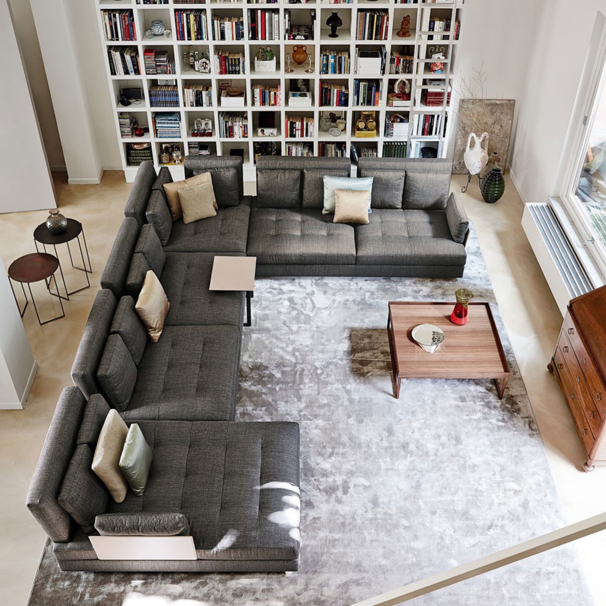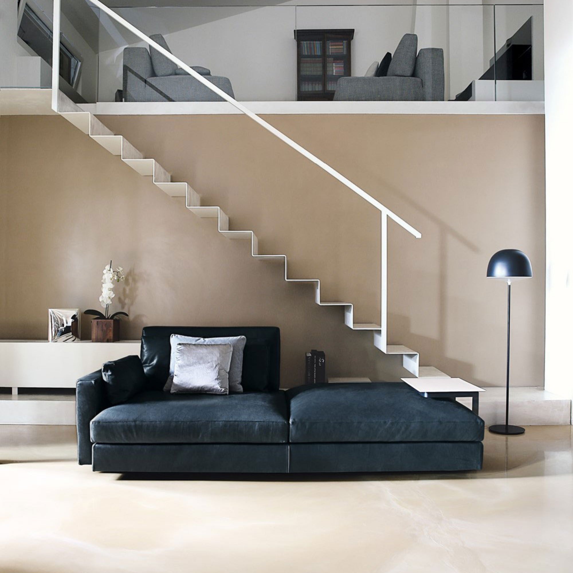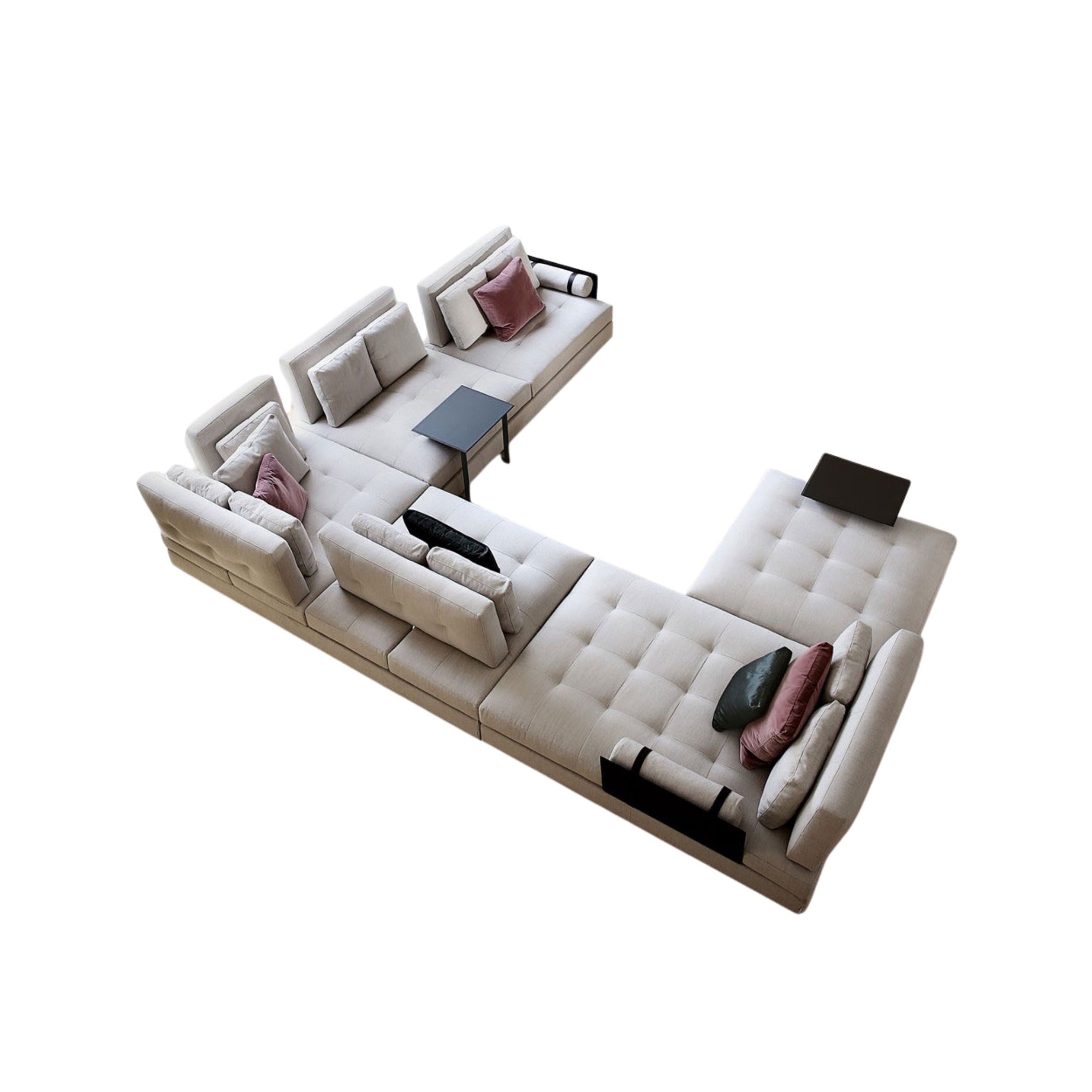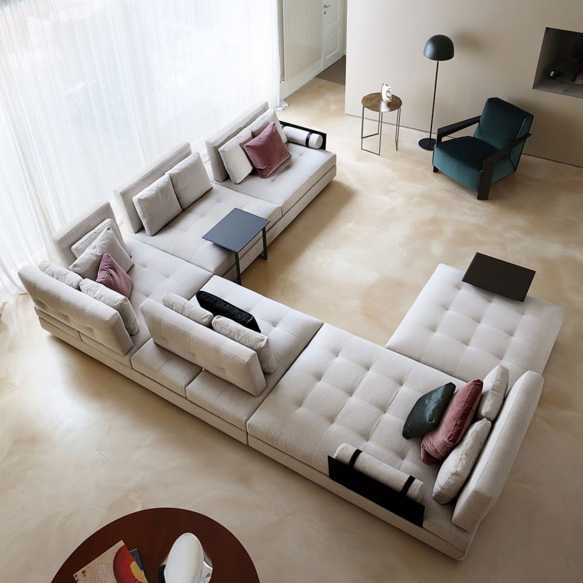 HEMINGWAY is a modular sofa that blends spacious comfort with versatile functionality. Its adjustable backrest offers a relaxation mode or a conversational configuration, while deep-button upholstery highlights plush softness. Minimalist leather armrests contrast elegantly with the sofa’s generous volumes, embodying refined comfort and sophisticated design.