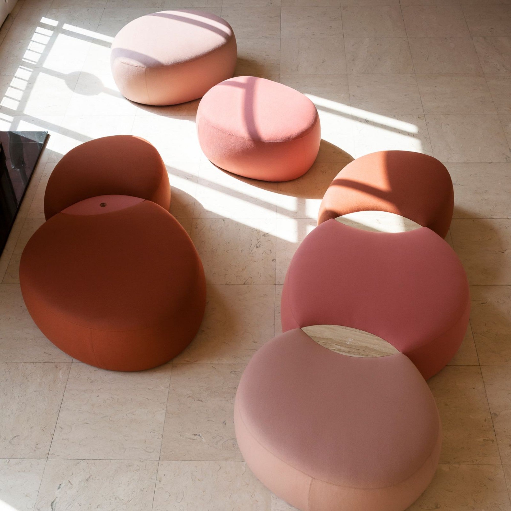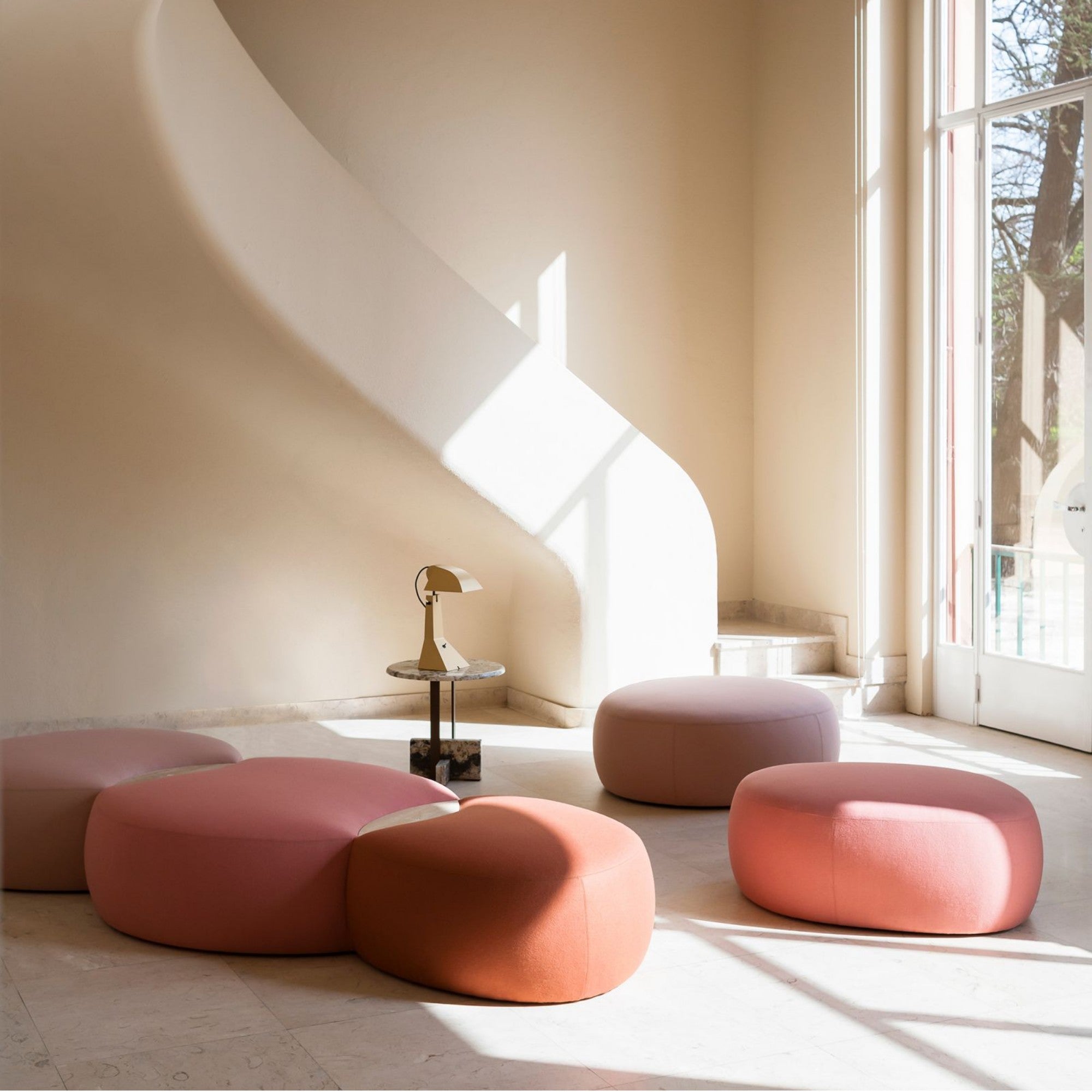 The Matera Modular Pouf System by Tacchini, designed by Gordon Guillaumier, offers upholstered “stone‑like” seating modules that stand alone or combine into islands. Optional wood or marble dining tops and integrated wireless chargers make it perfect for contract lounges, waiting areas or collaborative spaces.
