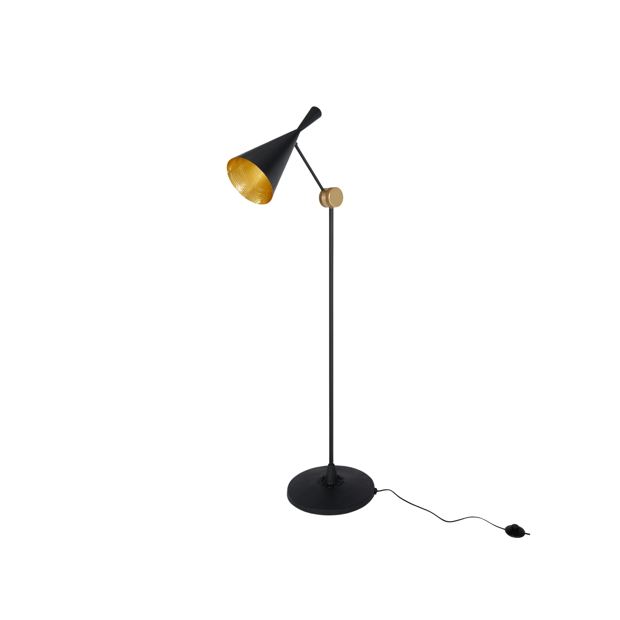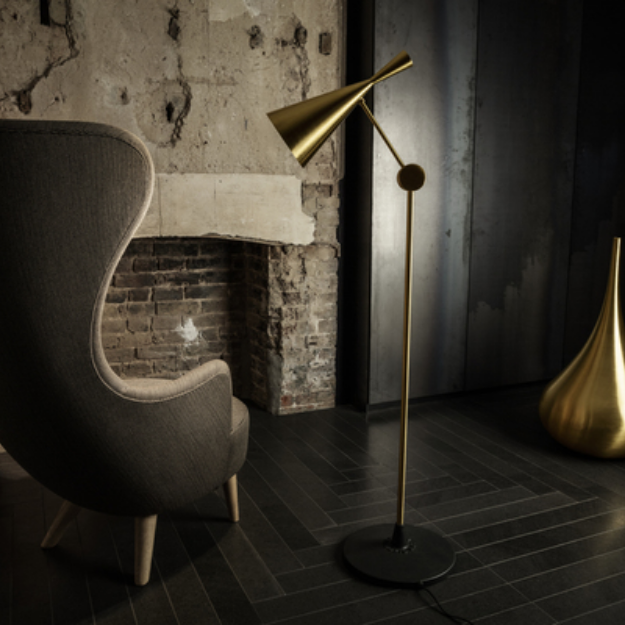 The BEAT Floor Light is a handcrafted floor light with a warm, golden interior, made by artisans in Northern India. Its beaten surface reflects soft light, showcasing the beauty of handmade craftsmanship.