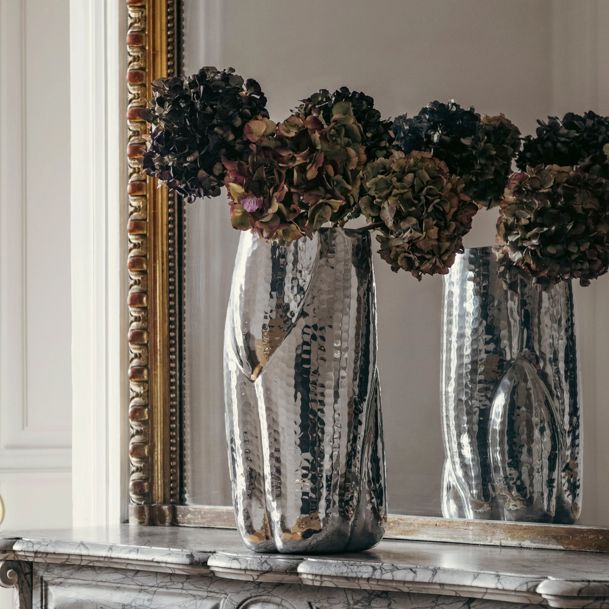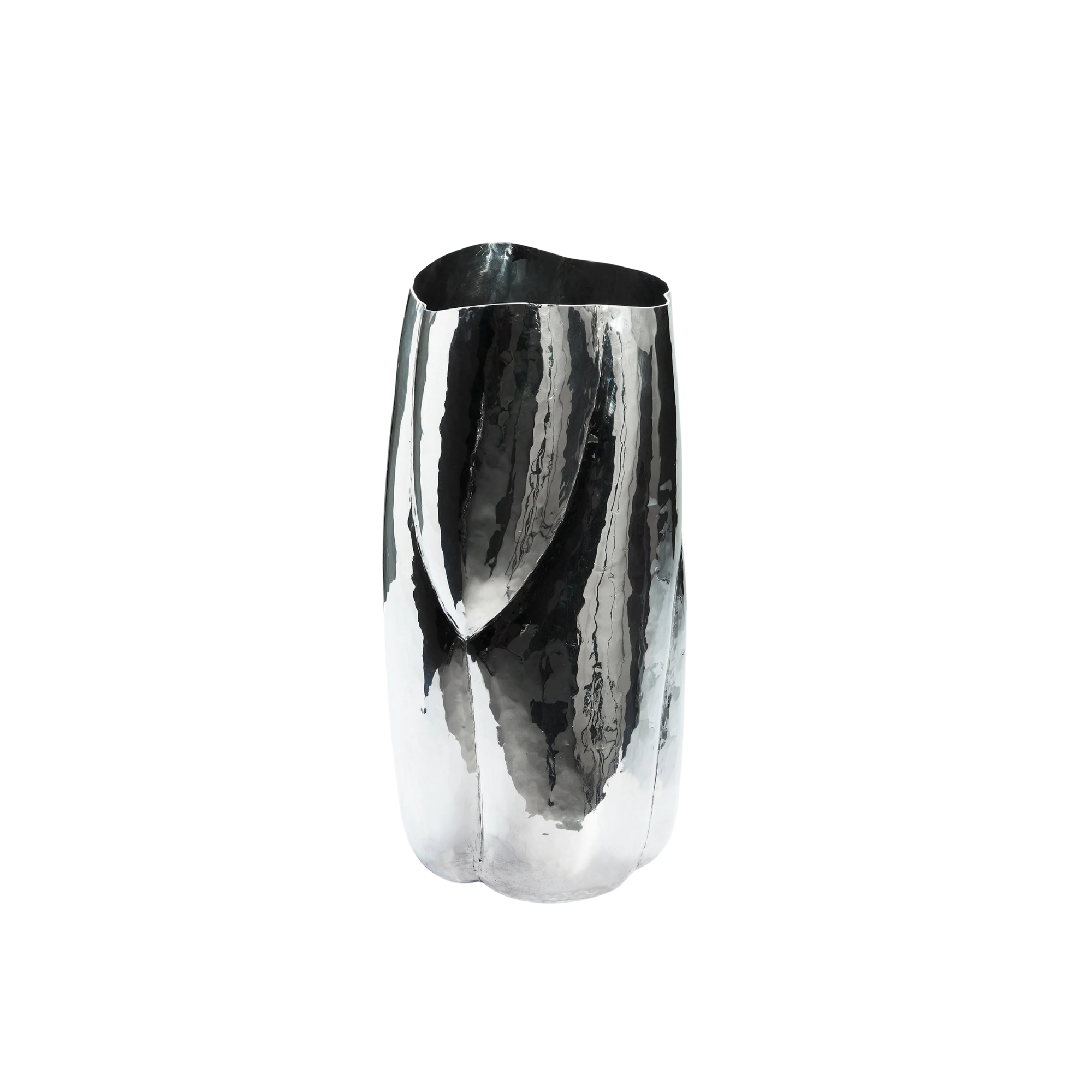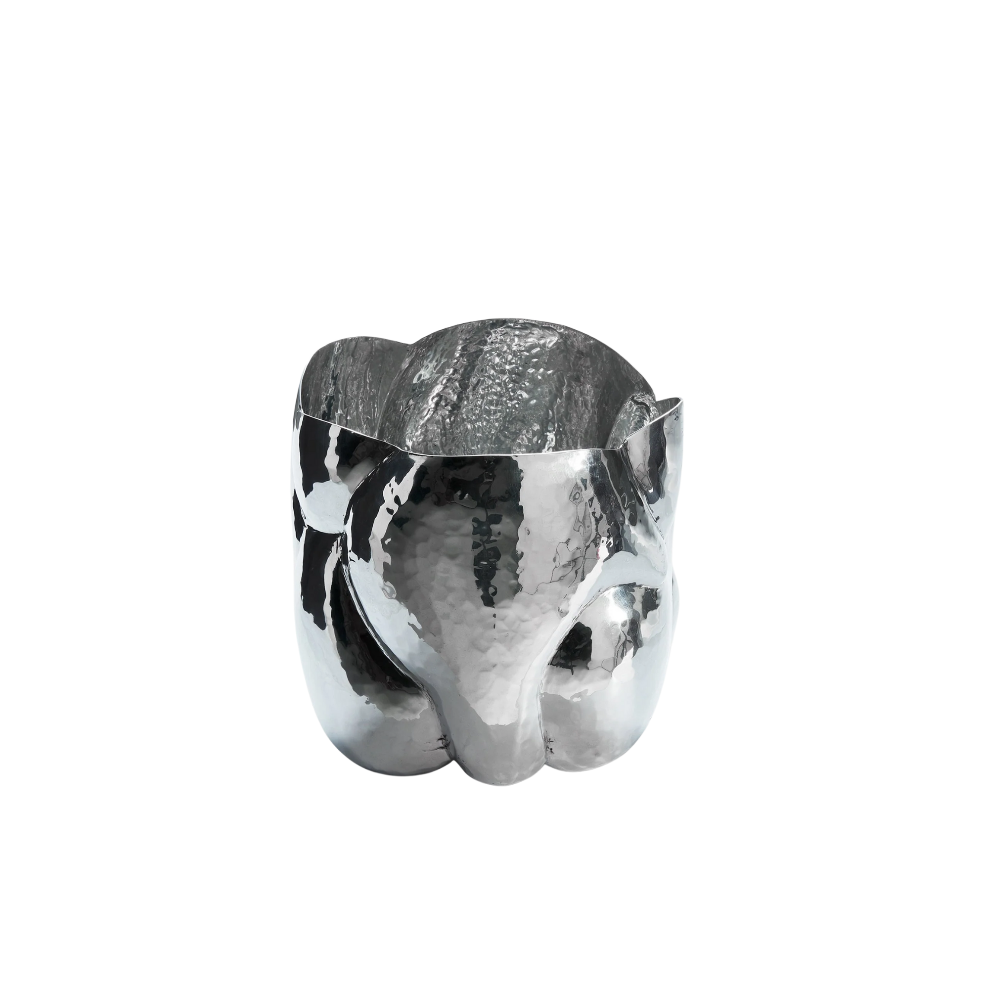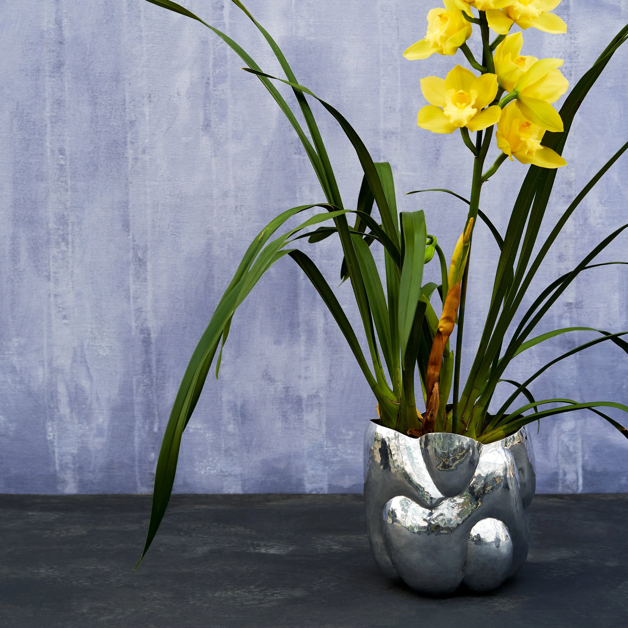 Cloud is a family of sculptural pieces made of highly reflective polished aluminium. The collection includes a platter, bowl, short and tall vessel, all of which are handmade by skilled artisans in India. Each Cloud vessel is impactful, and water-tight so can be used for floral arrangements, and also dry-food safe.