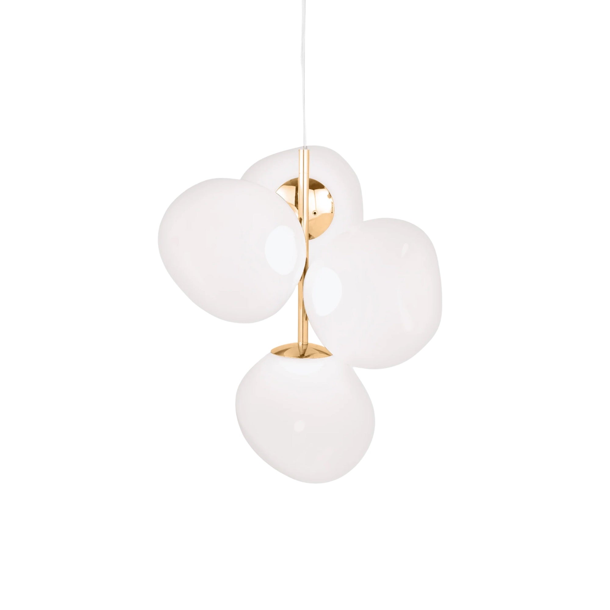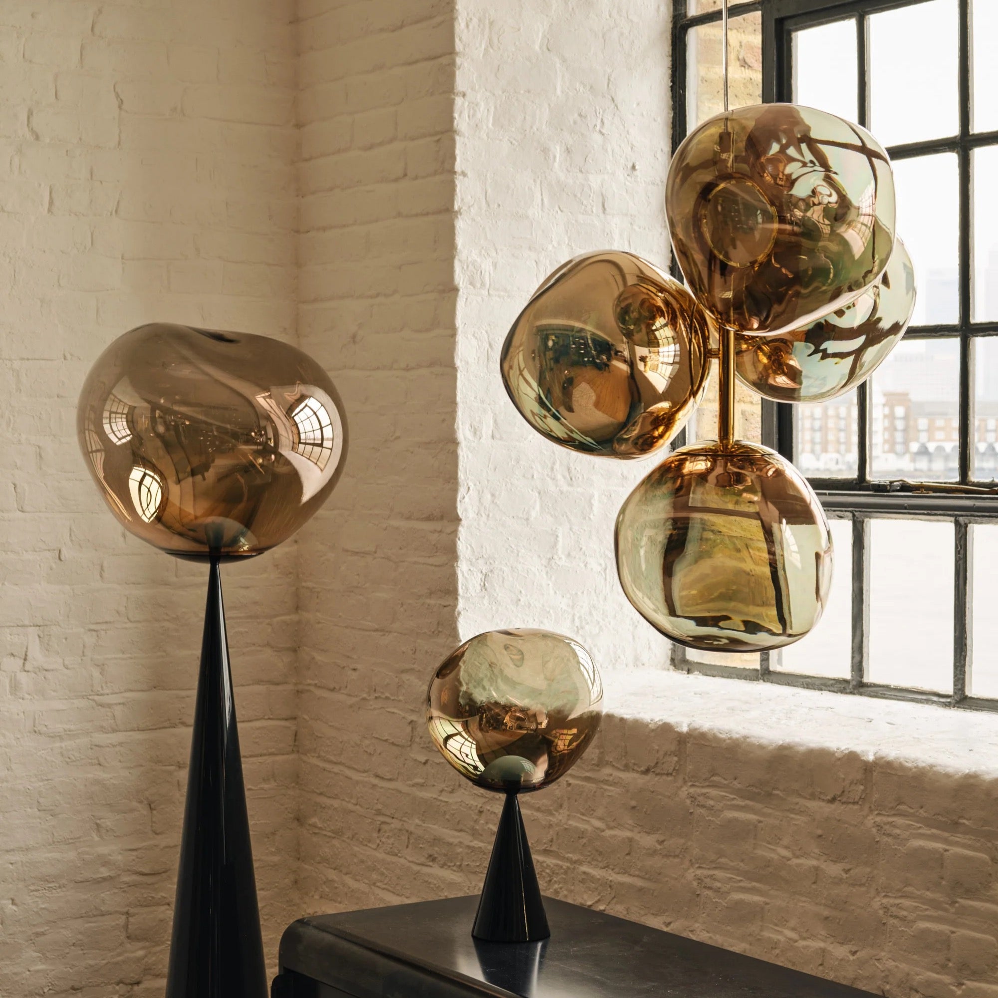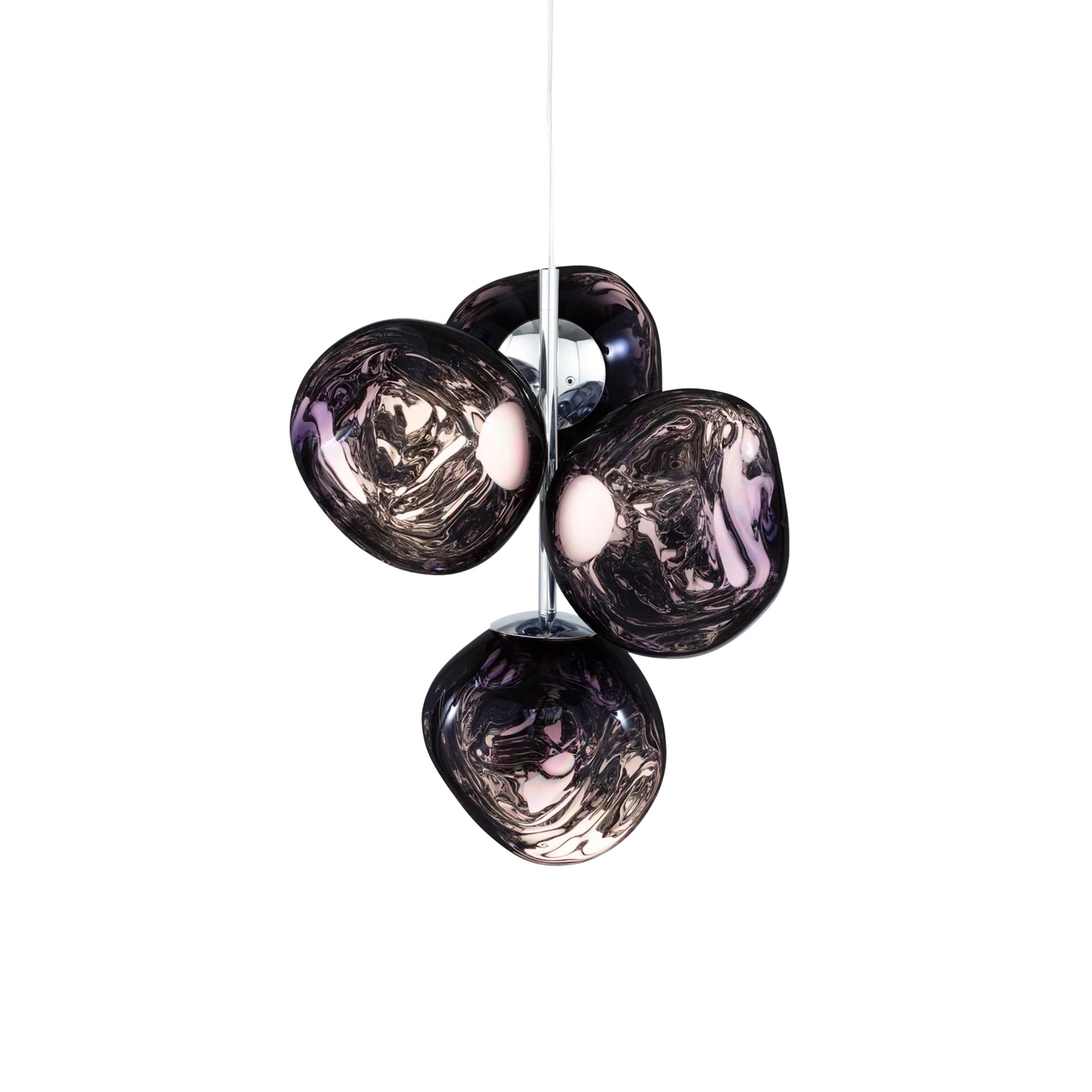 The Melt Chandelier features four mini Melt pendant lights in a modern chrome finish. With an integrated LED module, it creates a mesmerizing hot-blown glass effect when on and a mirror-finish effect when off. Made in Germany using high-tech manufacturing, it evokes molten glass, and is perfect for smaller spaces.